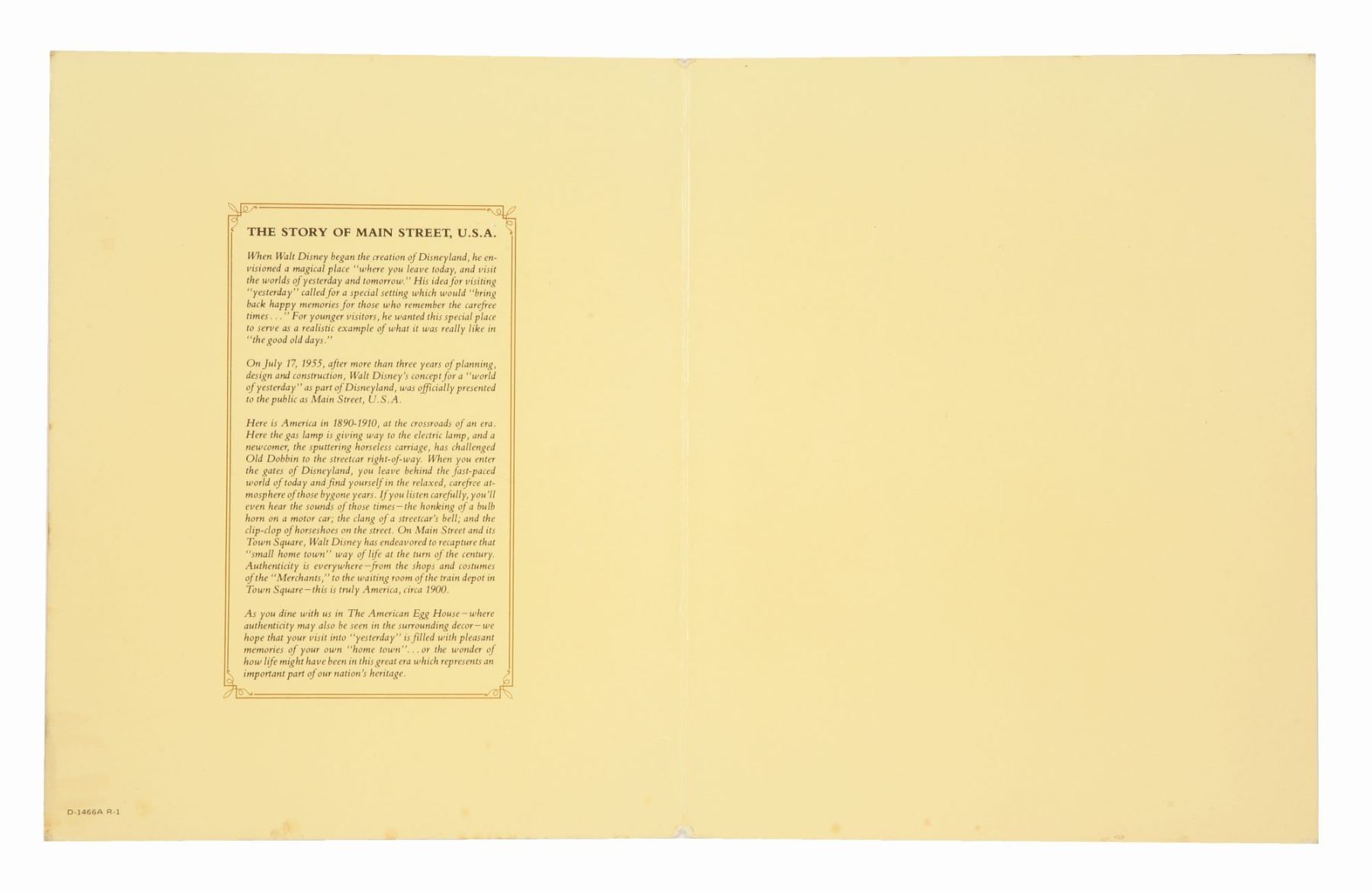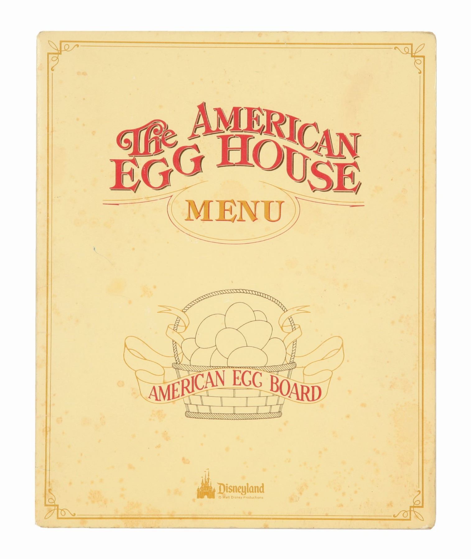 (Disneyland, 1978-83) A rare menu cover from The American Egg House at Disneyland. This Main Street, U.S.A. dining establishment was the only Park restaurant to serve breakfast all day. The menu features a message from the American Egg Board on the back cover and the story of Main Street inside the front cover. The cover does not include the inner sheet of menu items. Measuring 8" x 10", the menu cover is in fair condition with spotting throughout, creases, a stray ink mark, and wear from use.