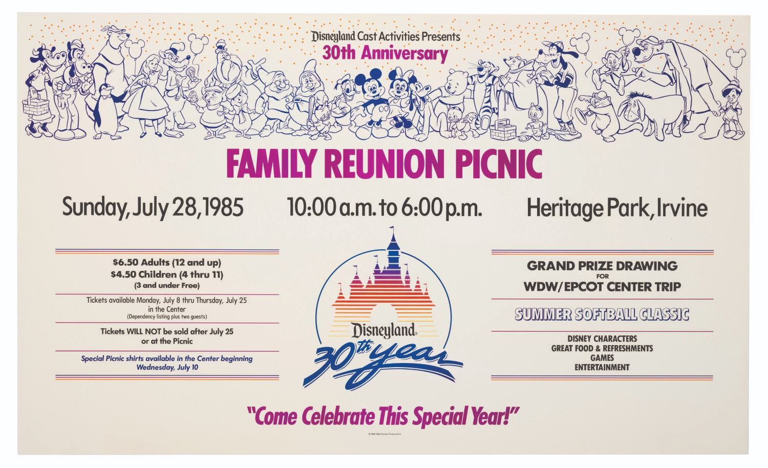 (Disneyland, 1985) A poster advertising the "Disneyland 30th Anniversary Family Reunion Picnic." The ticketed event, organized for Cast Members, included food, games, character appearances, and an EPCOT Center raffle. Posters like this were mounted backstage in areas like The Center, where tickets were available. Measuring 18" x 30", the glossy poster is in very good condition with light wear to some edges.