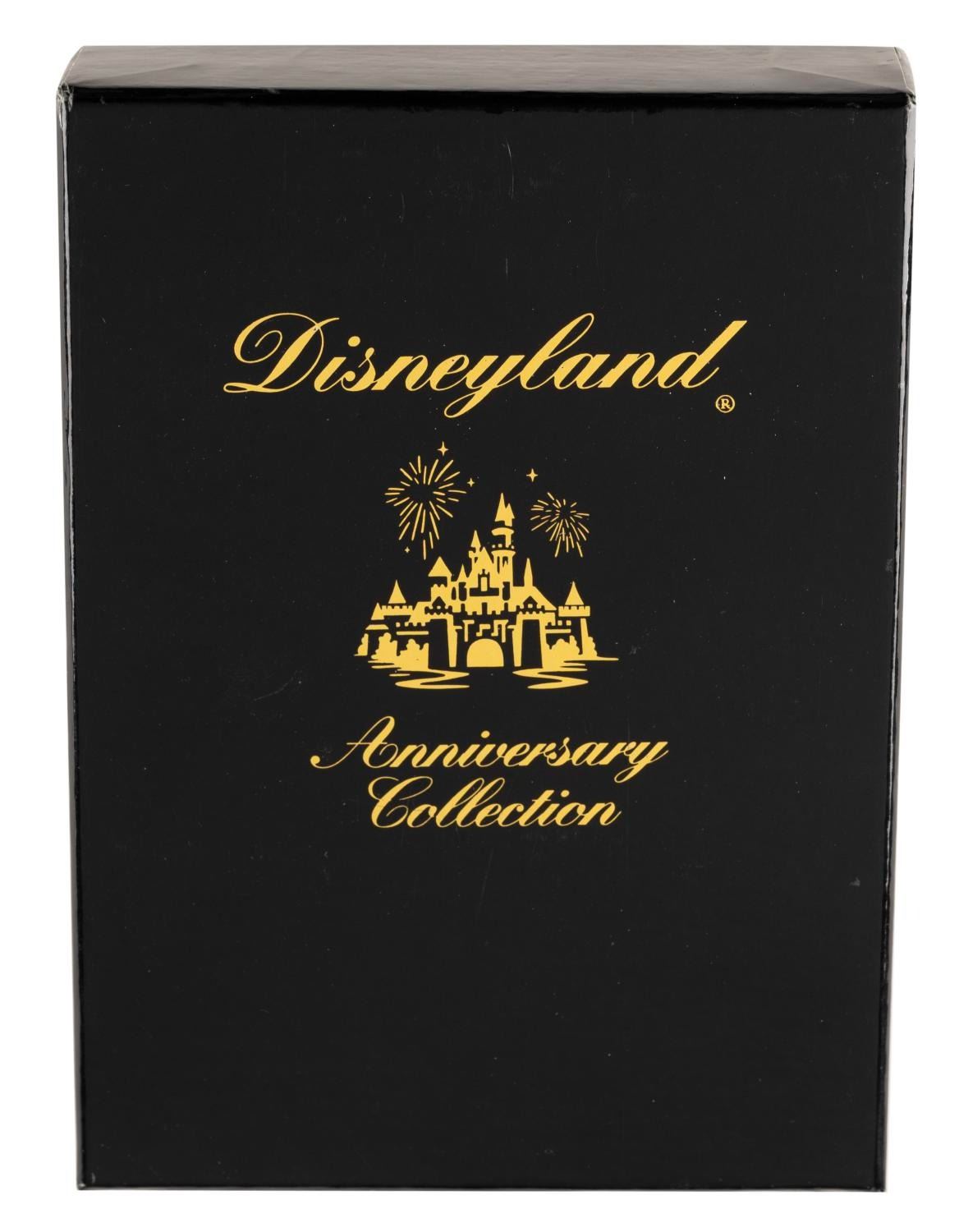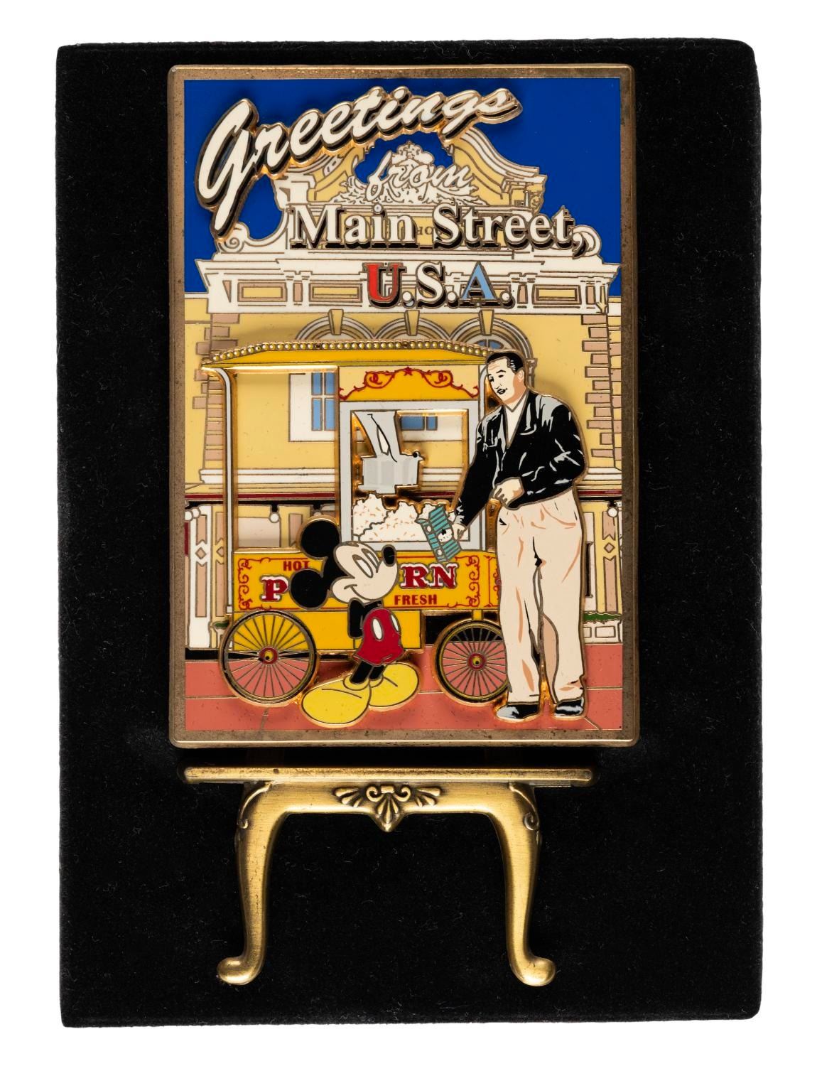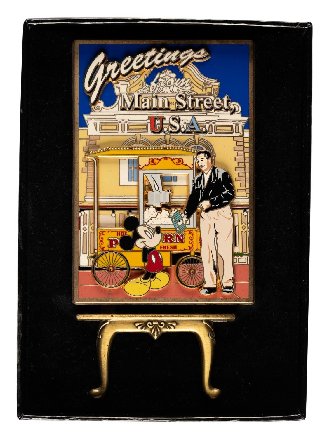 (Disneyland, 2005) A Disneyland Resort Passholder Exclusive “Hear You Go Partner” pin commemorating the 50th anniversary of dining at Disneyland, distributed as a limited release Passholder Exclusive on July 15th and 16th, 2005. The pin features the expression “Greetings from Main Street” as Walt hands Mickey a box of popcorn next to a cart. Measuring 3.5” x 2.75”, the jumbo pin and accompanying 4.75” tall metal easel are both in fine condition. Both are packaged inside the original box.