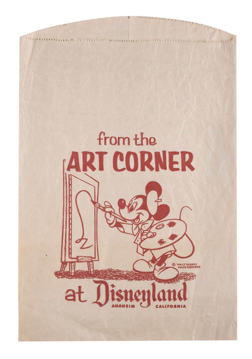 (Disneyland, 1960s) A medium-sized souvenir bag from The Art Corner at Disneyland. Bags of this stye were used to package merchandise purchased at both the Fantasyland and Tomorrowland Art Corner locations. Measuring 9.5"x14", the historic Disneyland ephemera is in good condition with yellowing, creasing, and wear throughout from handling and age.