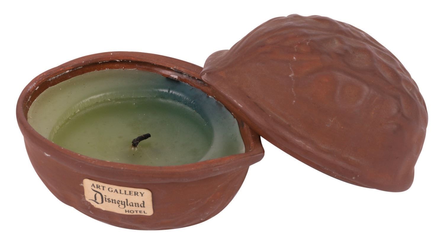 (Disney, 1950s-1960s) A walnut-shaped ceramic candleholder with candle, originally sold at the Art Gallery at the Disneyland Hotel. Measuring 6"x4.5"x4.5" high, the piece is in very g ood condition, with light wear from use. The piece still retains its original Disneyland Hotel sticker.