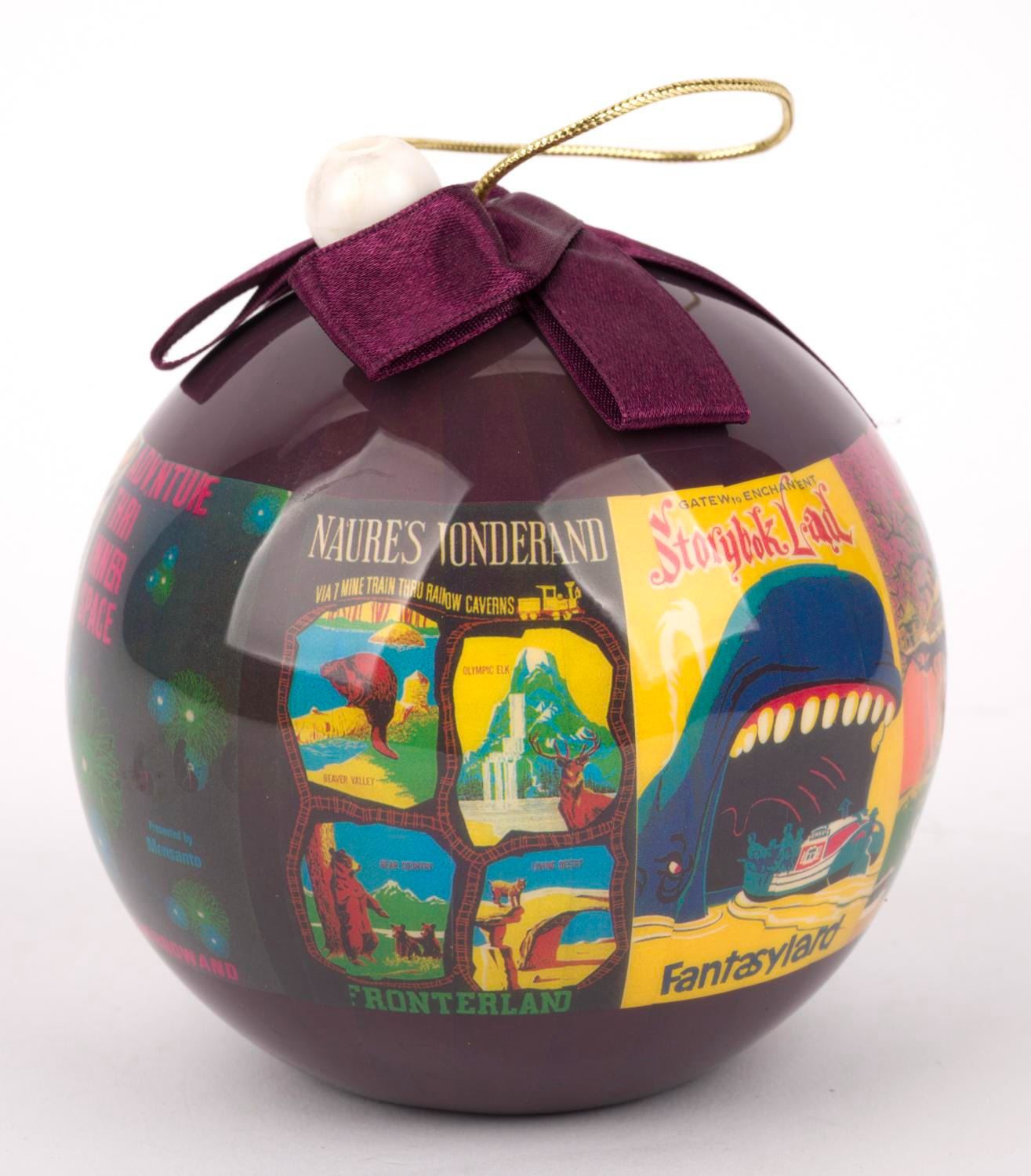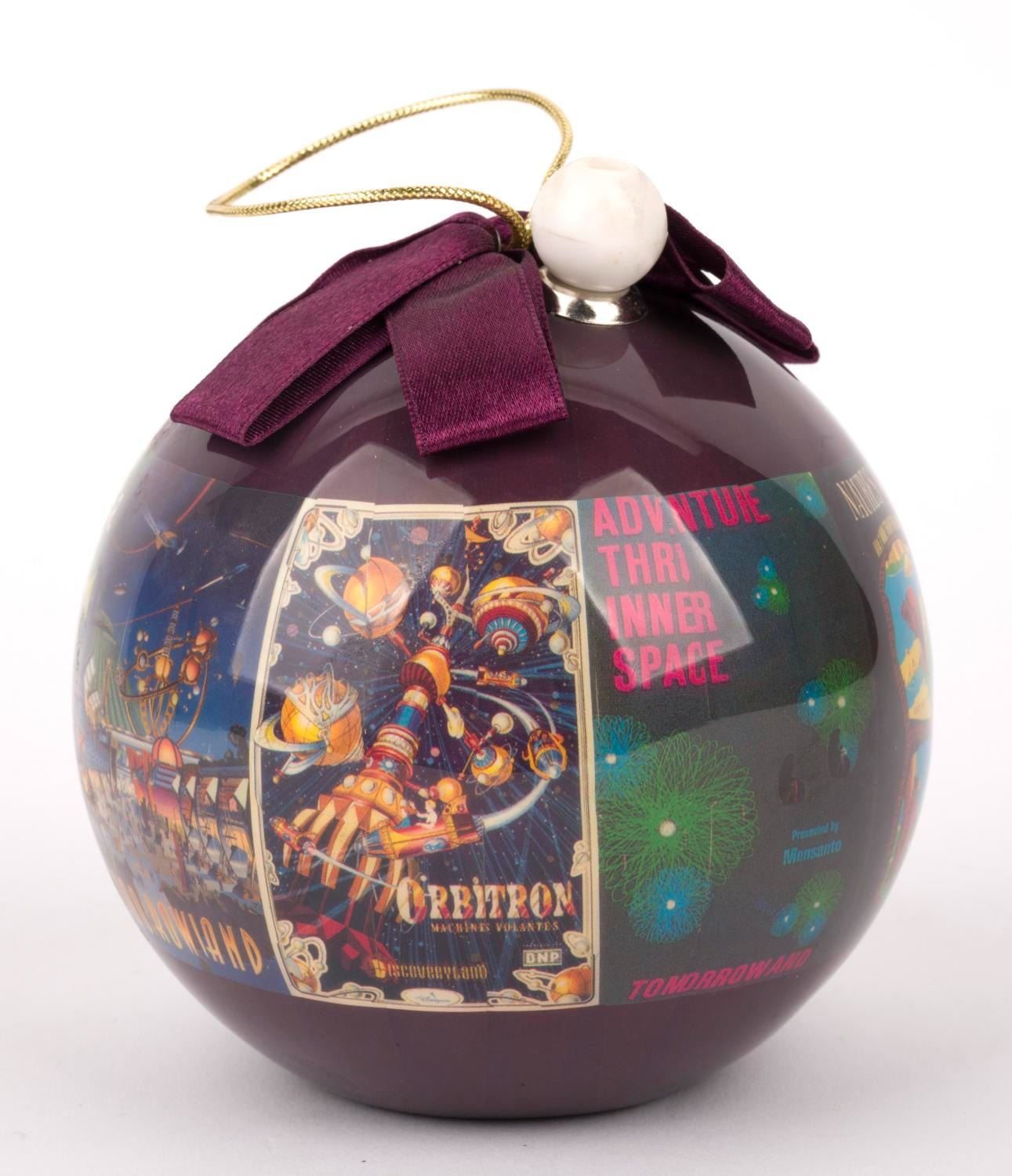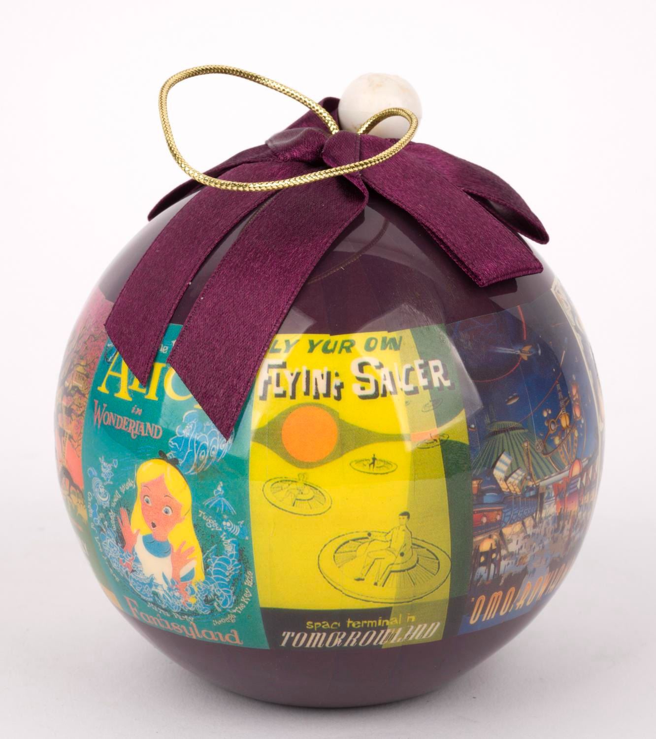 (Disneyland, 2000s) A glass holiday ornament featuring Disneyland Attraction Posters. the piece is in fine unused condition.