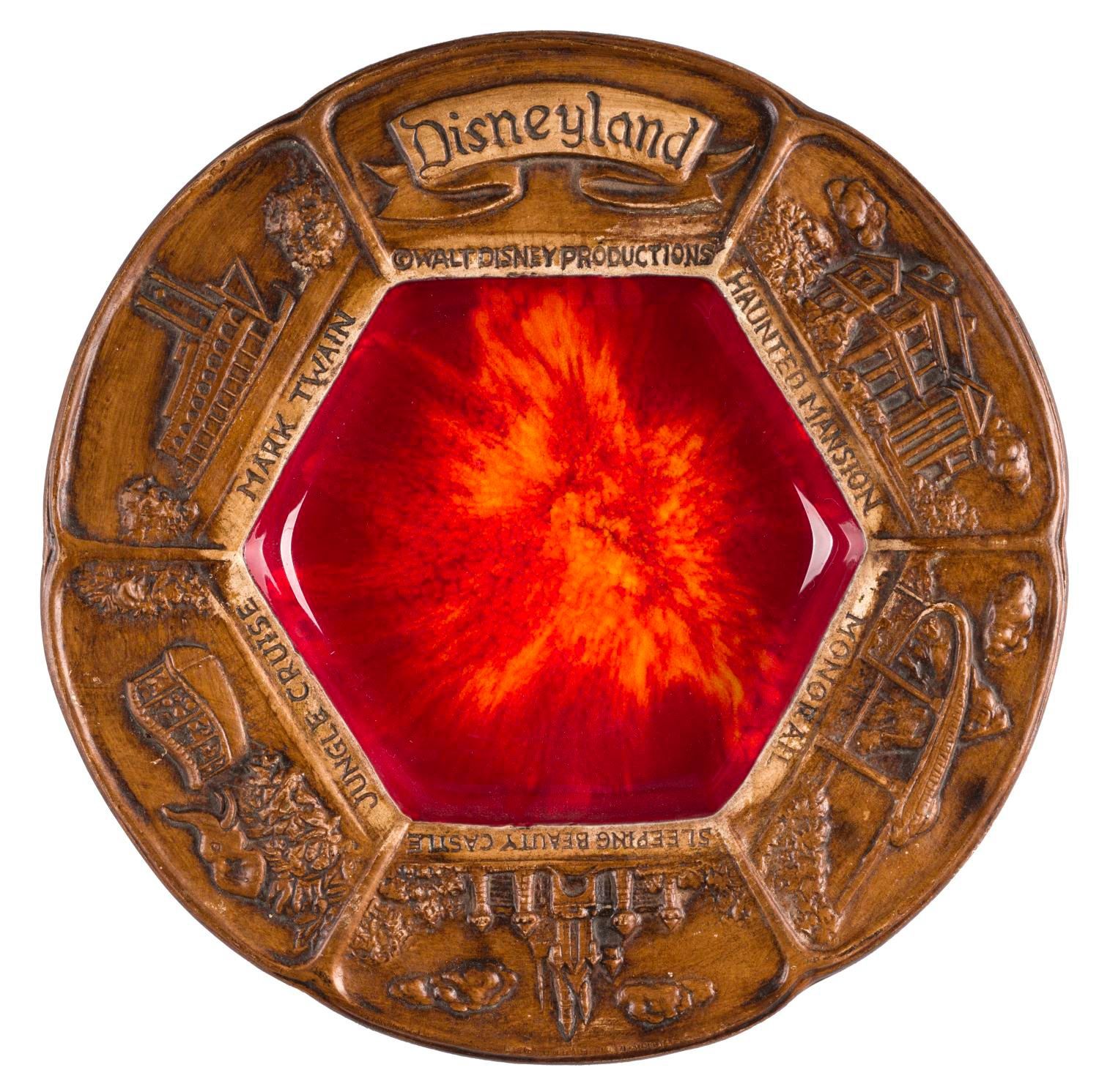 (Disneyland, 1970s) A Disneyland souvenir plate/ashtray with relief images of attractions, made of resin. The 8" plate is in fine condition.