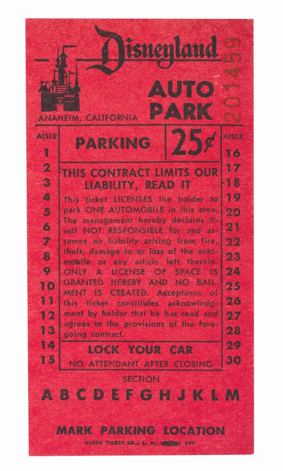 (Disneyland, 1960s) A mid-1960s 25-cent Disneyland Auto Park ticket. Measuring 2.5" x 5", the ticket numbered 201459 displays in fine condition with very light wear.
