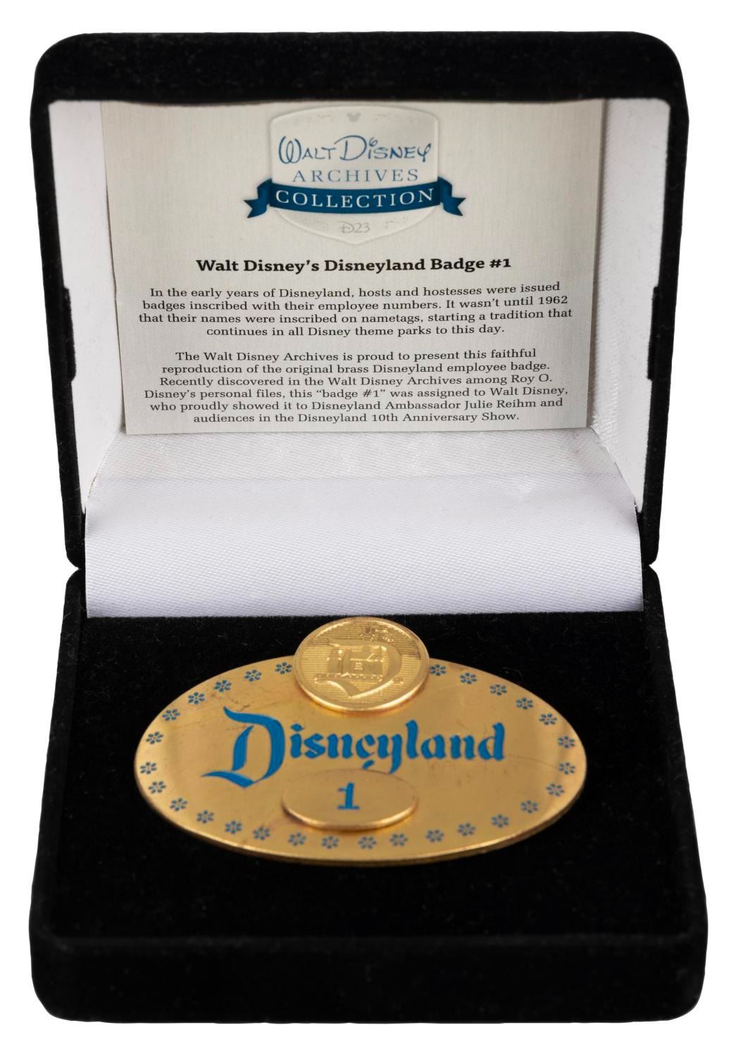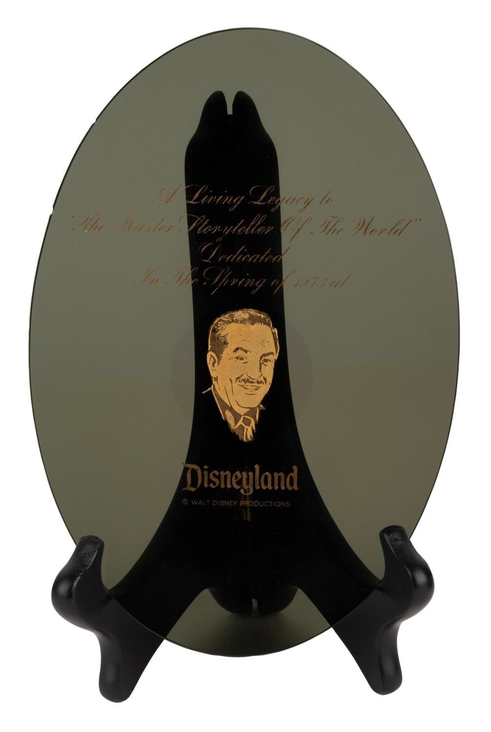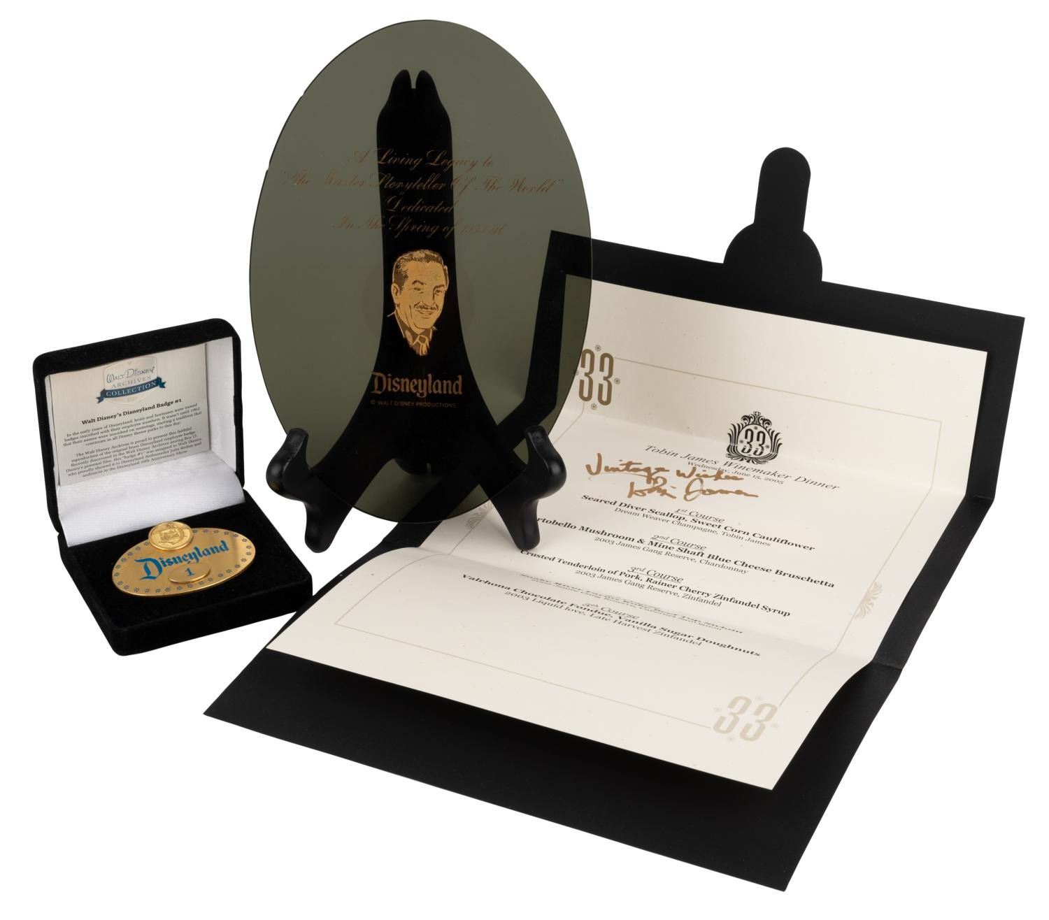 (Disneyland, 1973-2011) A limited edition replica of Walt Disney’s Disneyland Badge #1, a Club 33 Invitation, and a Walt Disney Tribute Glass. The badge was released at D23 in a limited edition of 1955, replicating Walt’s personal badge. The invitation is from a Tobin James wine-tasting event held at the exclusive Club on June 15, 2005, and bears James’ signature in gold marker, while the tribute glass features Walt’s image and a dedication to his legacy. Also included in the lot is a stand for displaying the tribute glass. Ranging in size from the 2” 2.5” badge in its original 3.5” x 3.5” box to the 9.75” x 17.5” open invitation, the items are in good to very good condition with light scratches, scuffs, and wear.