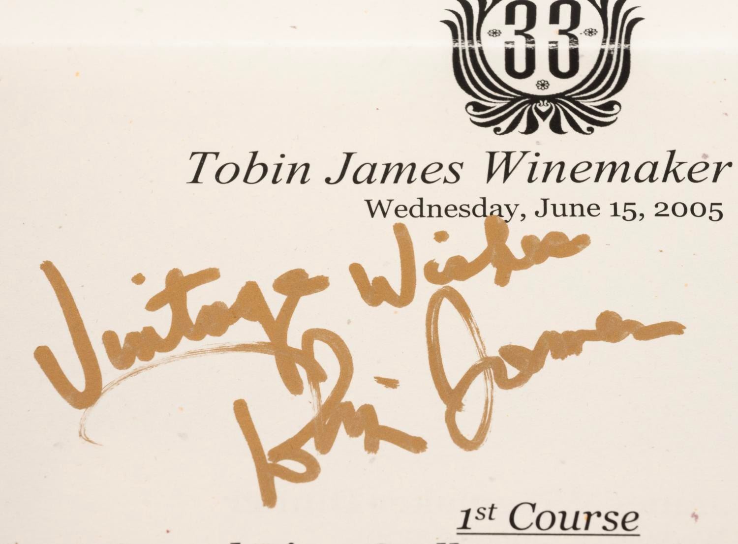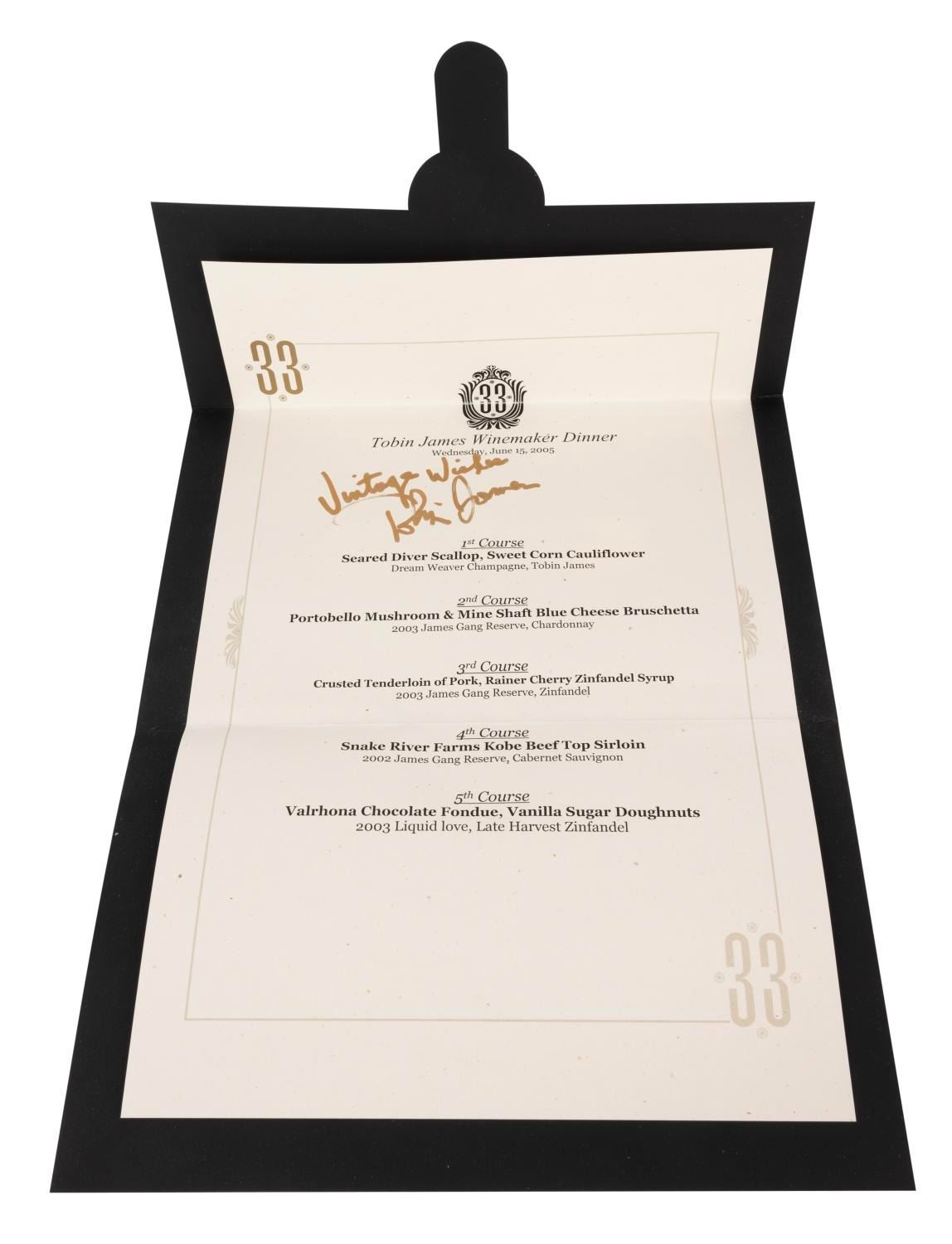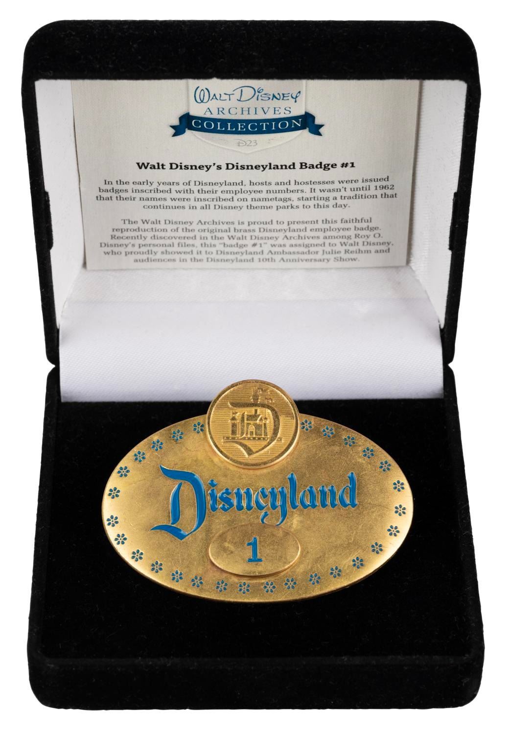 (Disneyland, 1973-2011) A limited edition replica of Walt Disney’s Disneyland Badge #1, a Club 33 Invitation, and a Walt Disney Tribute Glass. The badge was released at D23 in a limited edition of 1955, replicating Walt’s personal badge. The invitation is from a Tobin James wine-tasting event held at the exclusive Club on June 15, 2005, and bears James’ signature in gold marker, while the tribute glass features Walt’s image and a dedication to his legacy. Also included in the lot is a stand for displaying the tribute glass. Ranging in size from the 2” 2.5” badge in its original 3.5” x 3.5” box to the 9.75” x 17.5” open invitation, the items are in good to very good condition with light scratches, scuffs, and wear.