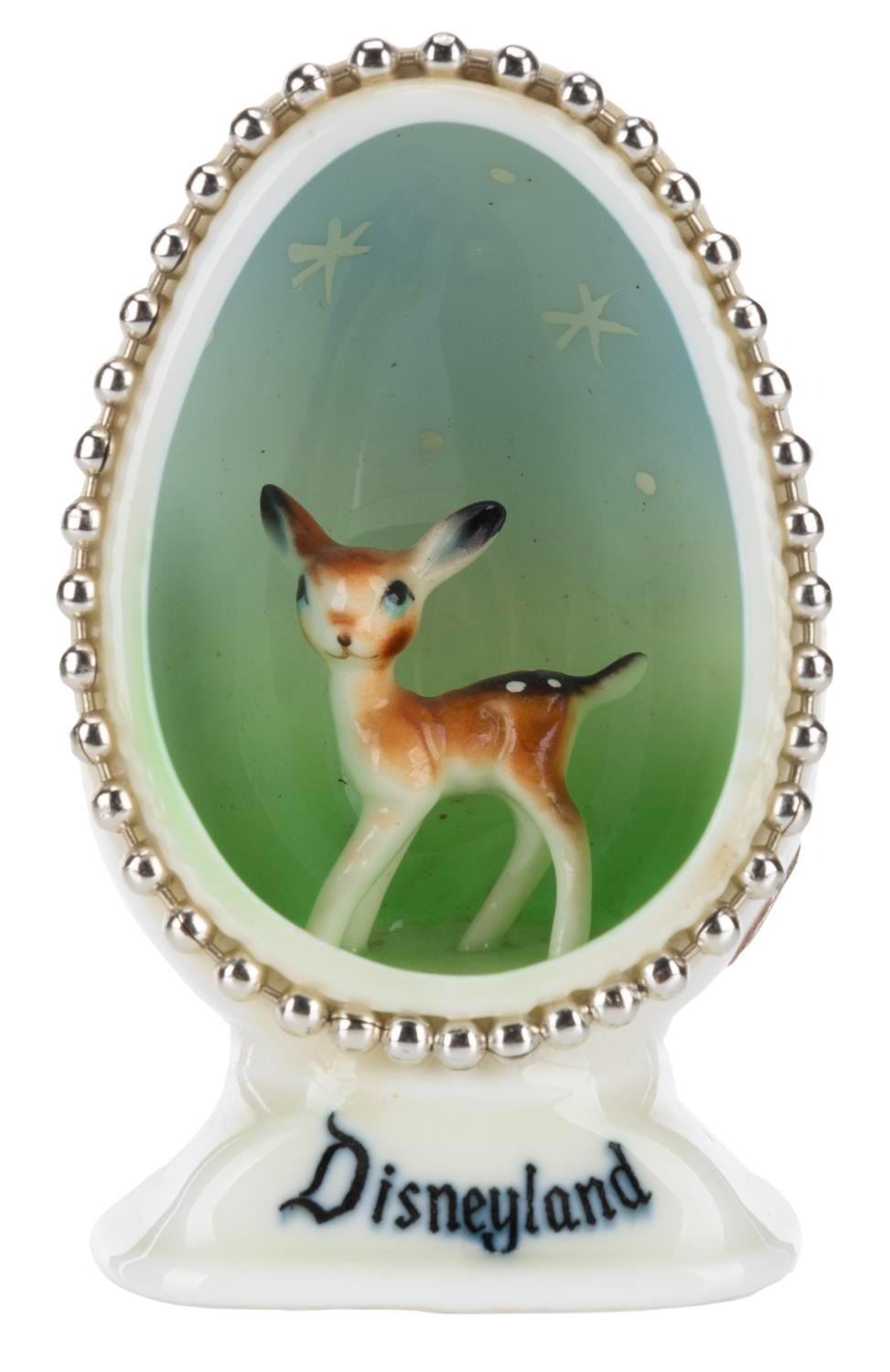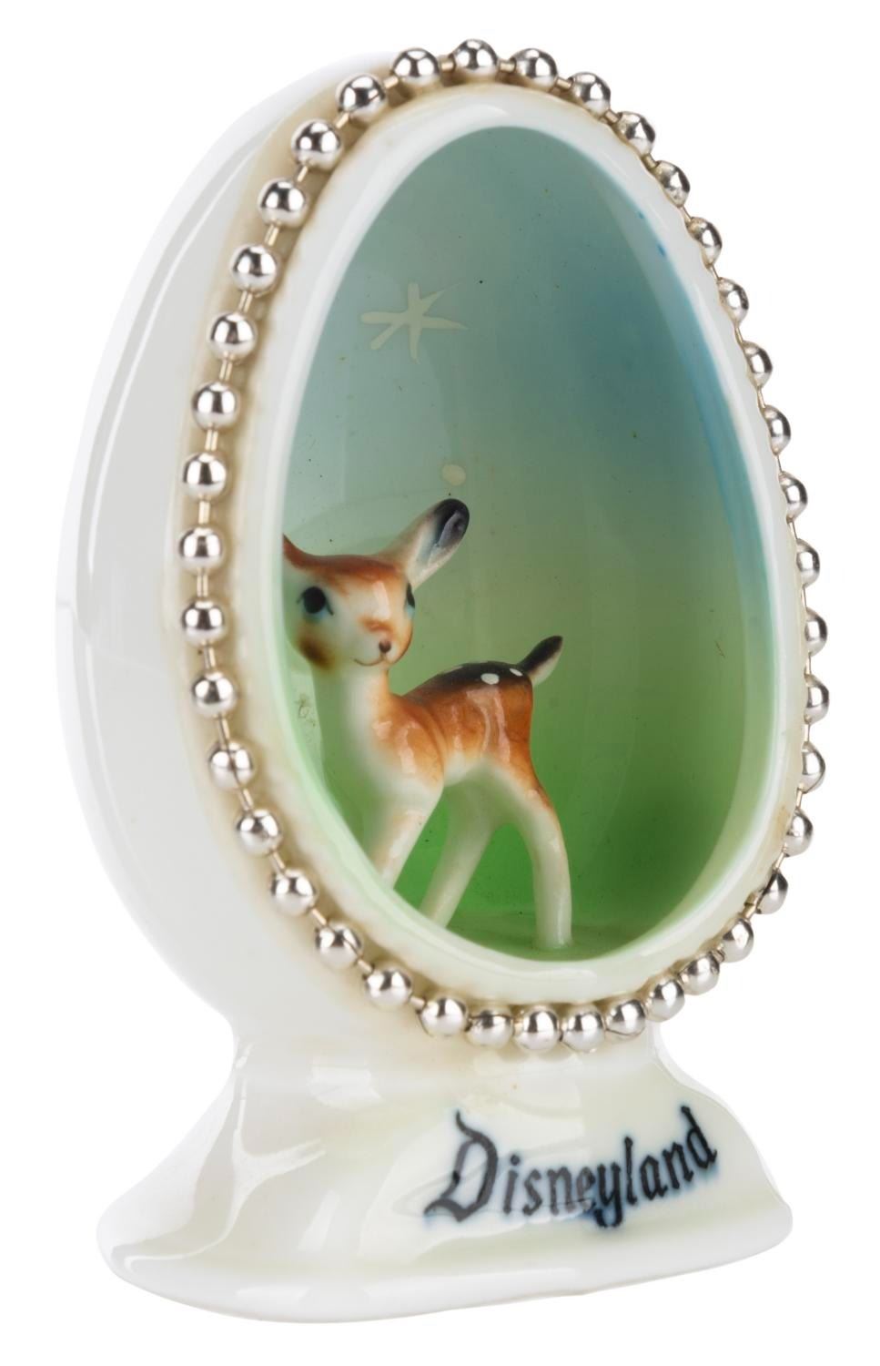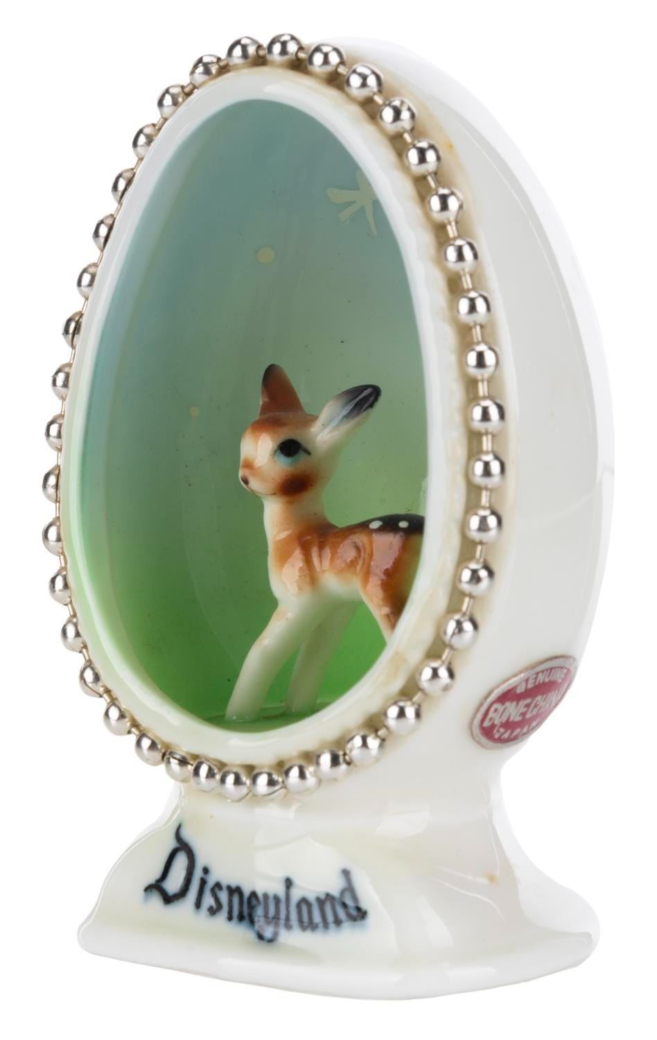 (Disneyland, 1950s-60s) A bone china egg souvenir of Disneyland featuring Bambi. Measuring 2.75" x 1.75" x 1.25", the figurine is in very good condition with minimal soiling.