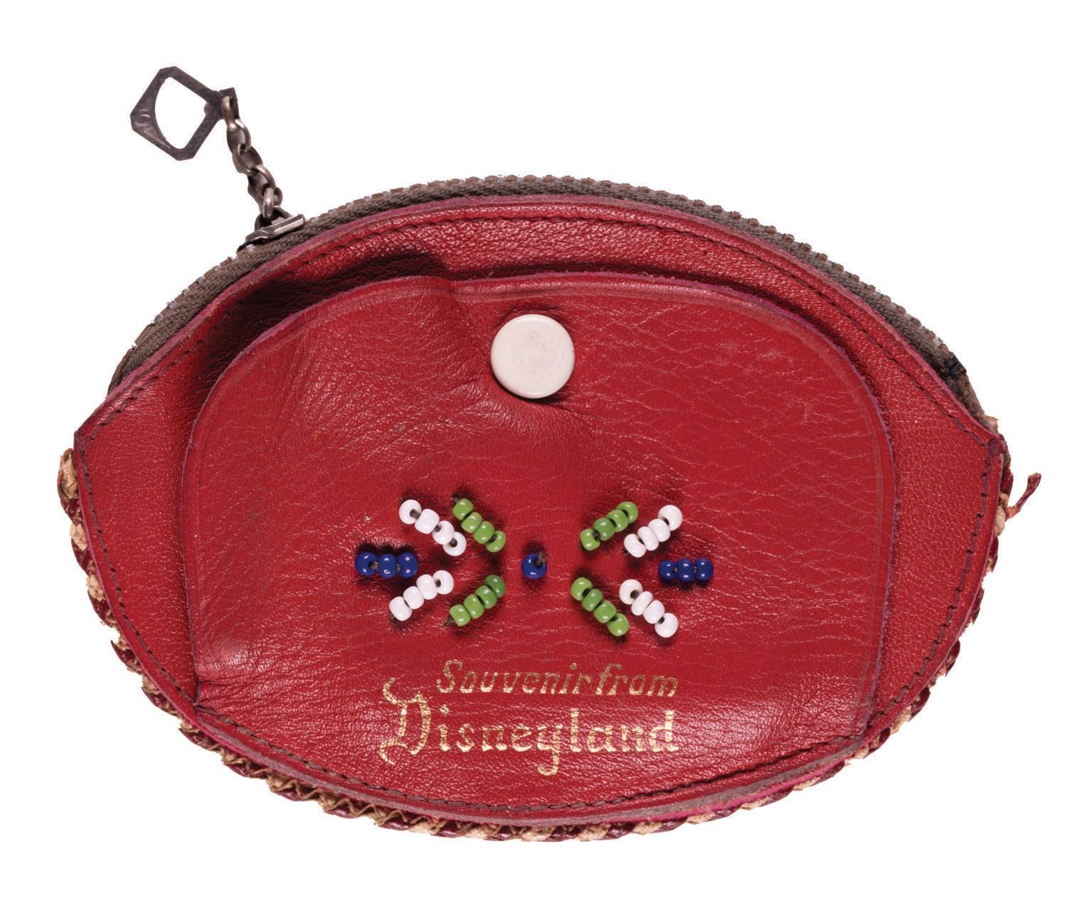 (Disneyland, 1960s) A beaded coin purse souvenir from Disneyland. The small red leather purse is accented with beads and features the Disneyland name in gold-finish print. Measuring 4.5" x3", the piece is in very good condition with few mild creases to leather, scuffs, and wear to surface from handling and age.