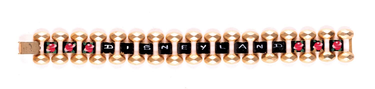(Disneyland, 1950s-1960s) A hand-painted metal bracelet from the earliest years of the Park. "Disneyland" is spelled out across the middle links, with roses painted on the outer (6). Measuring 7" long, the bracelet is in very good condition, with slight paint loss from the black areas.