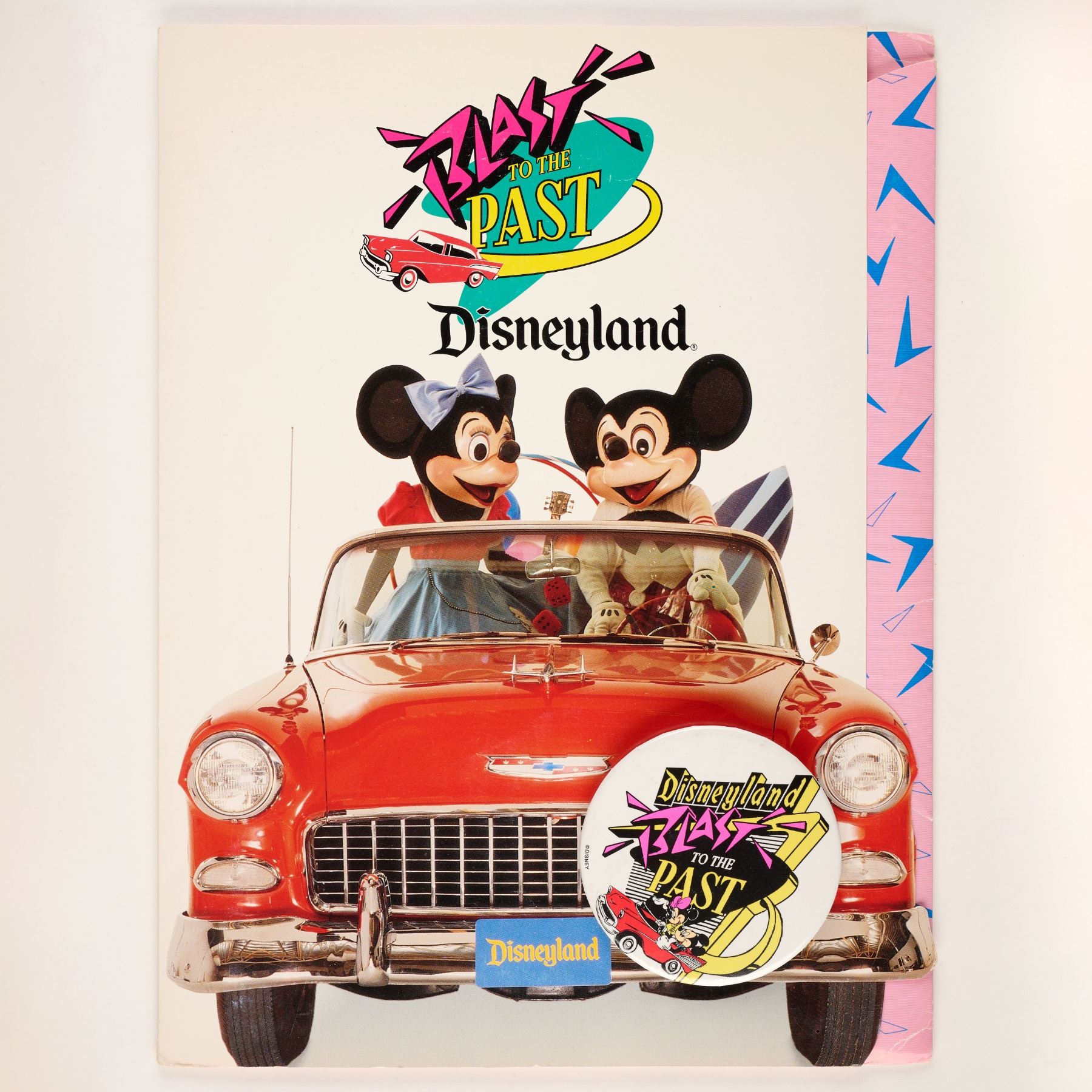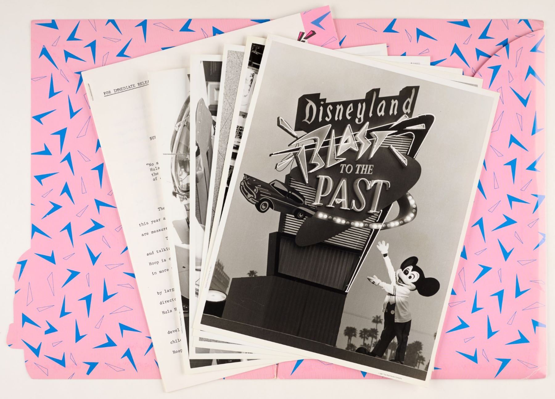 (Disneyland, 1989) An original press kit for Disneyland's Blast to the Past event in 1989 celebrating the 1950s. Included in the kit are five press photographs, one pinback button, three information packets, and two single-sheet press releases on topics including; the Hula Hoop Sensation, special event plans, trivia, and multi-day passport event pricing. The 12" x 9" outer folder, 11" x 8.5" press packets, 10" x 8" photos, and the 3" diameter button are in very good condition with light edge and corner wear throughout, age-related discoloration, and general handling wear.
