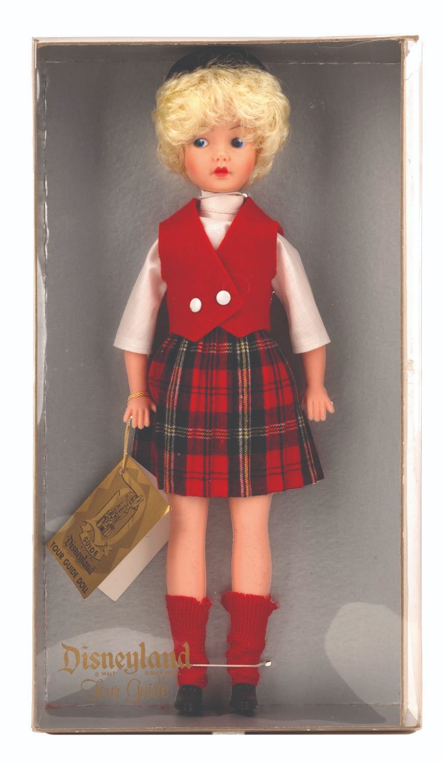 (Disneyland, 1960s) A souvenir tour guide doll in the original box and featuring the famous Park Tour Guide attire. Measuring 12" tall, the doll is in fine condition with a light tackiness to the plastic shoes from age. The box measures 7" x 12.5" and is in good condition with a tear in the plastic on the top right corner.