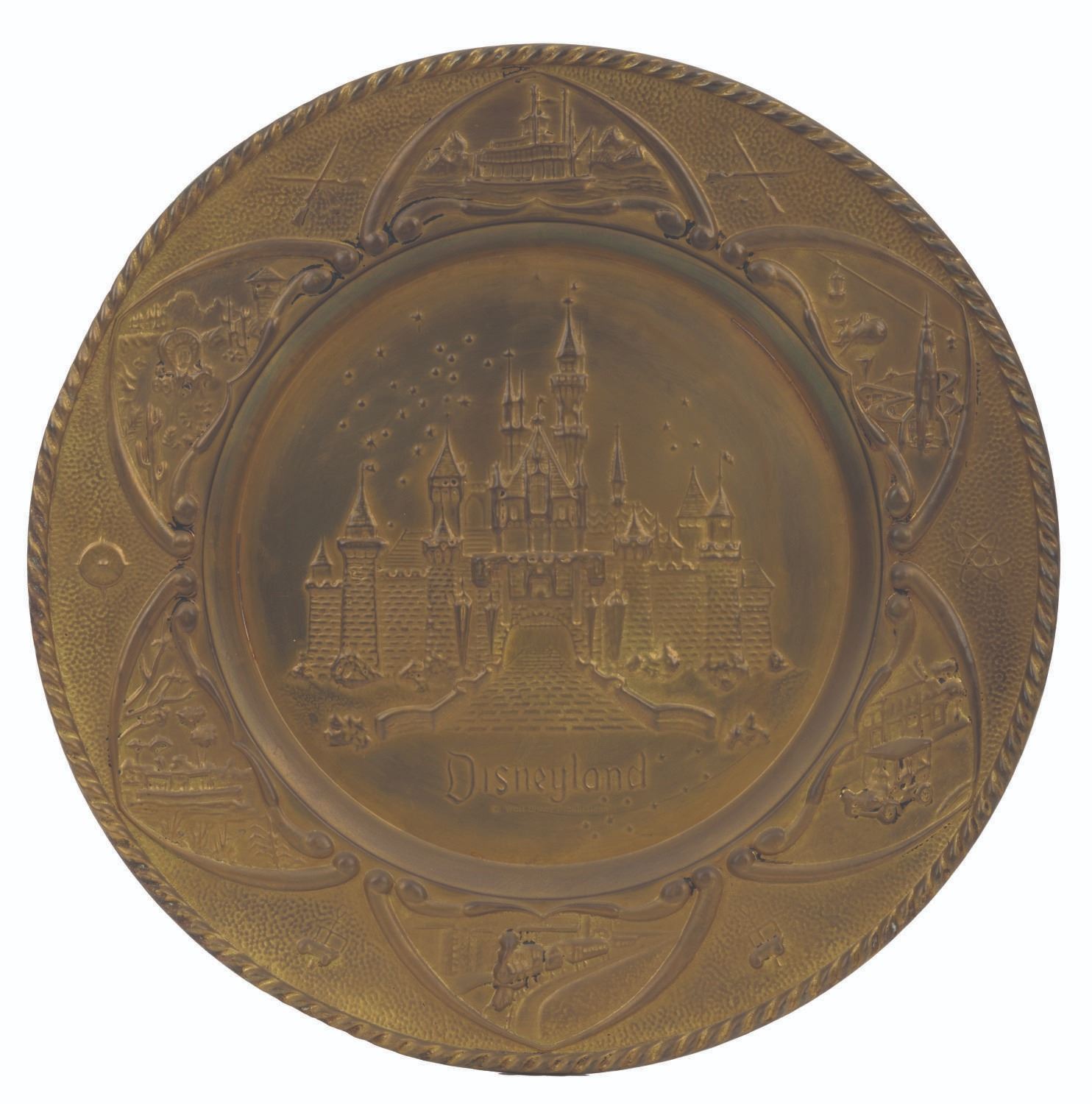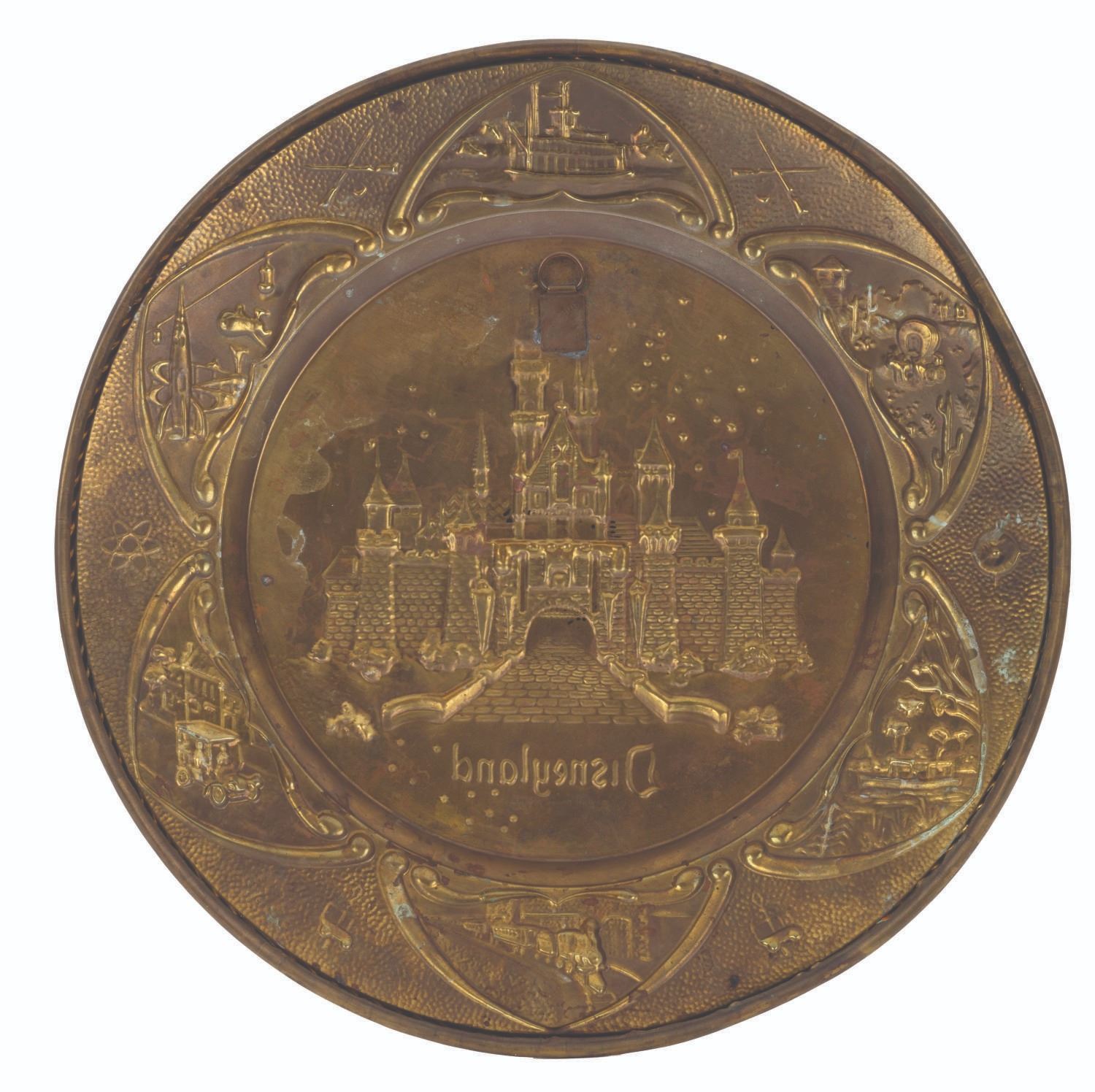 (Disneyland, 1950s) A brass tray by Peerage of England, featuring a relief of Sleeping Beauty Castle and lands of Disneyland. Measuring 12" in diameter, the tray is in good condition with expected wear throughout.