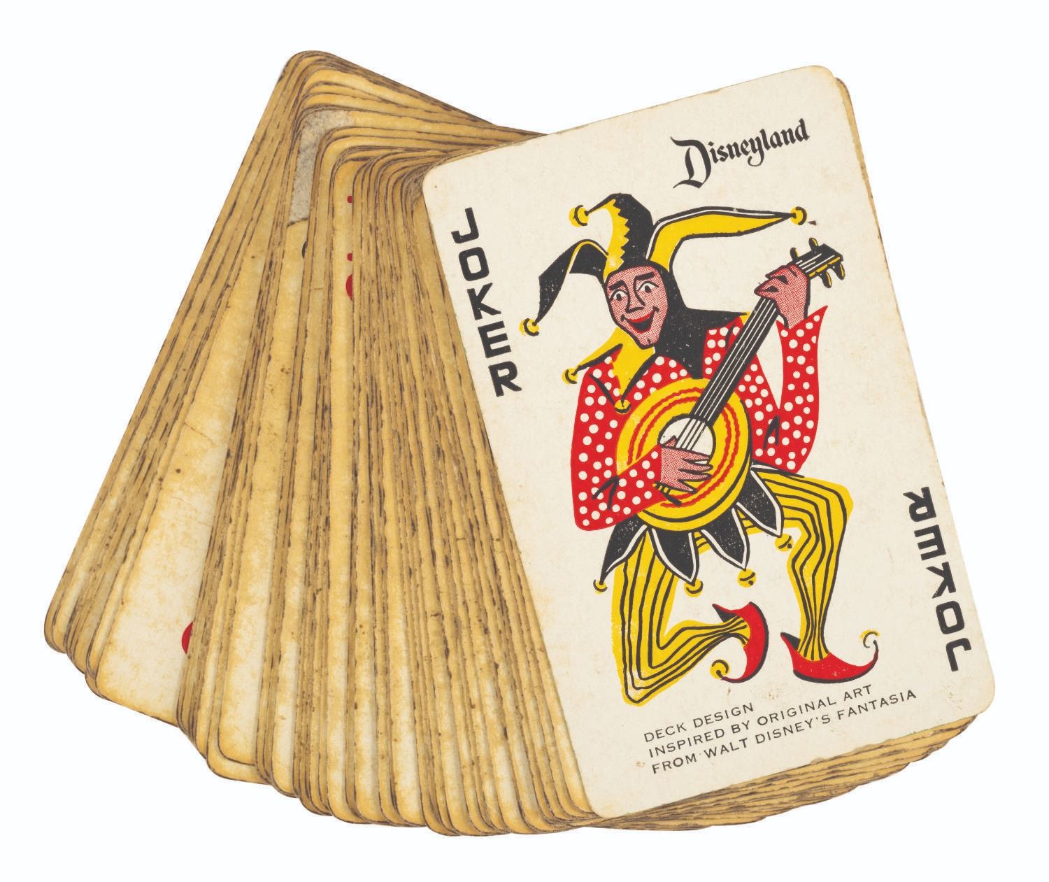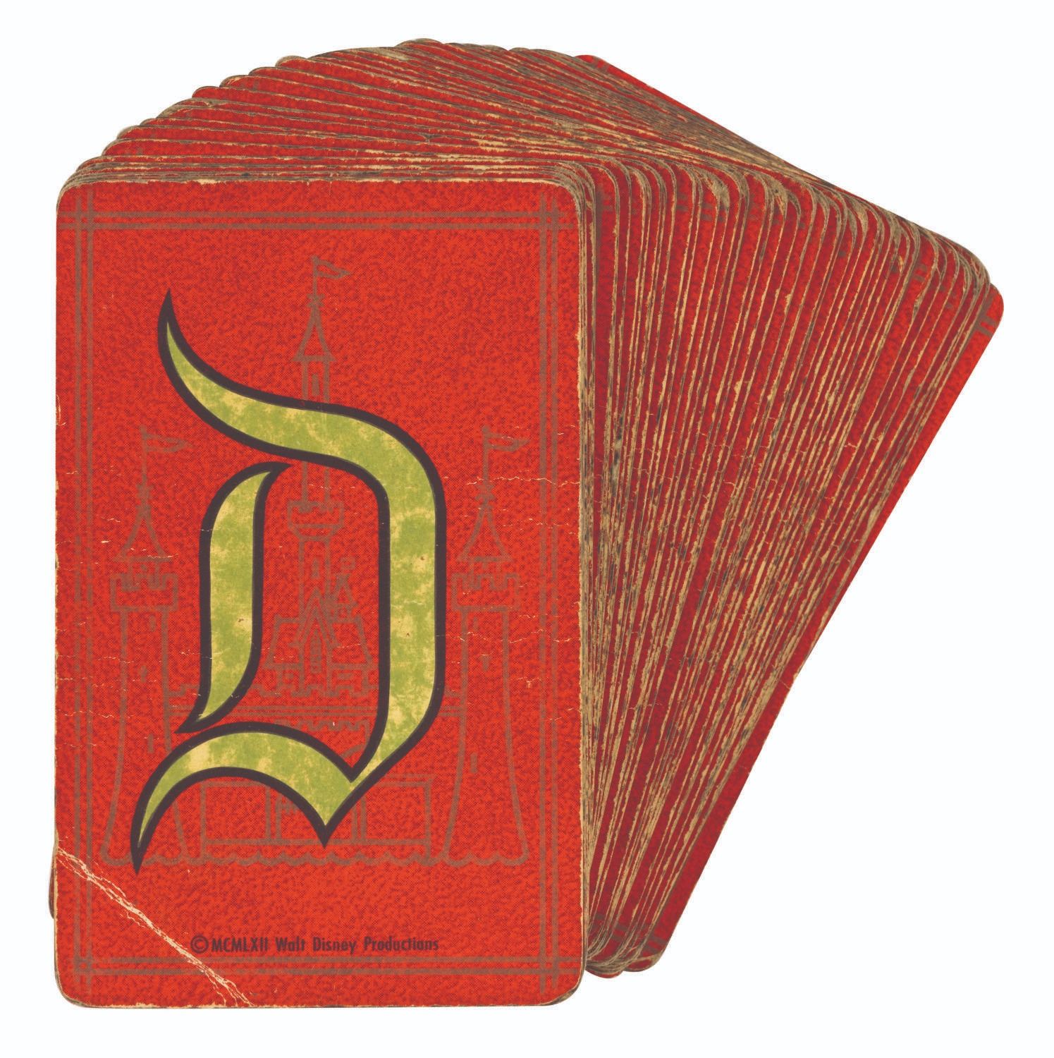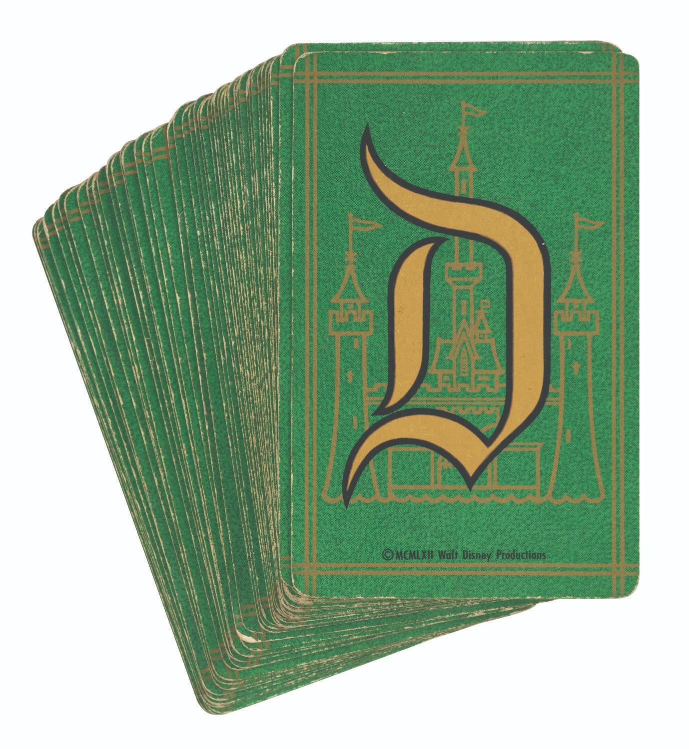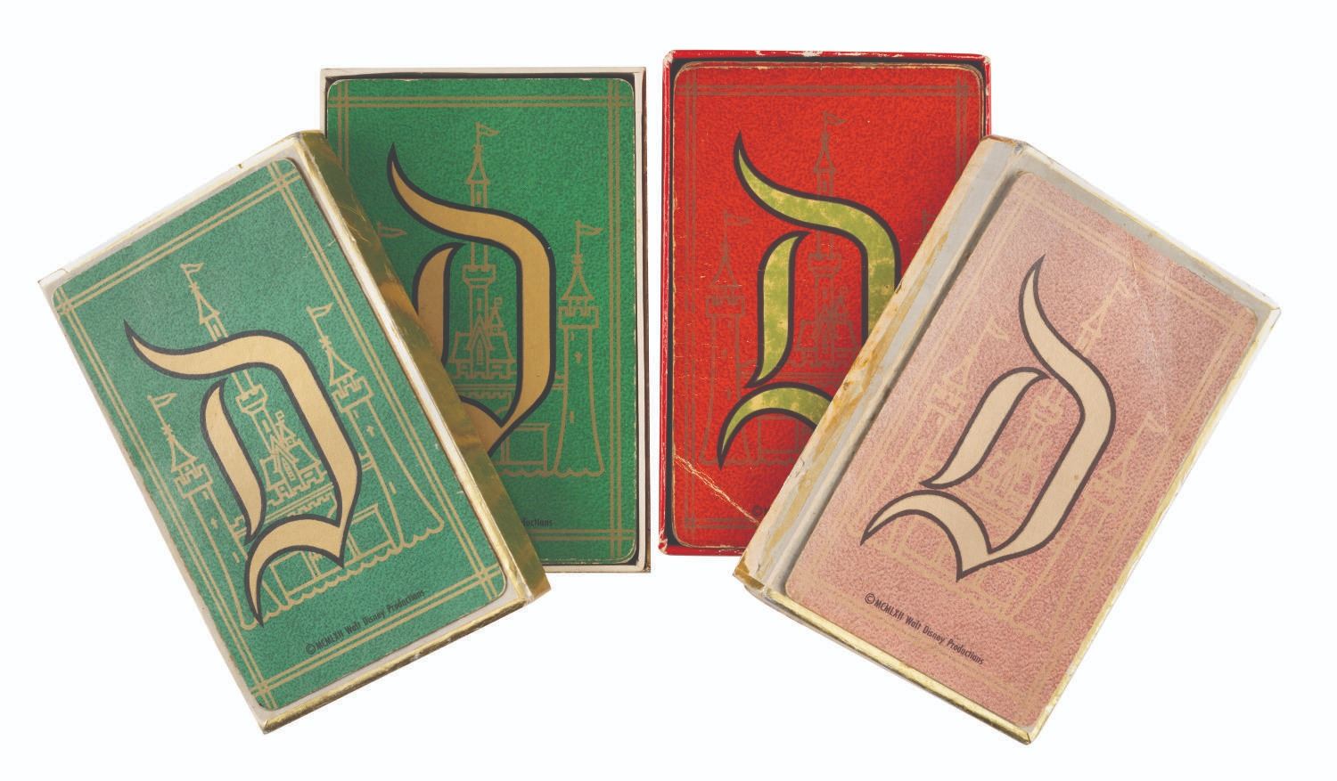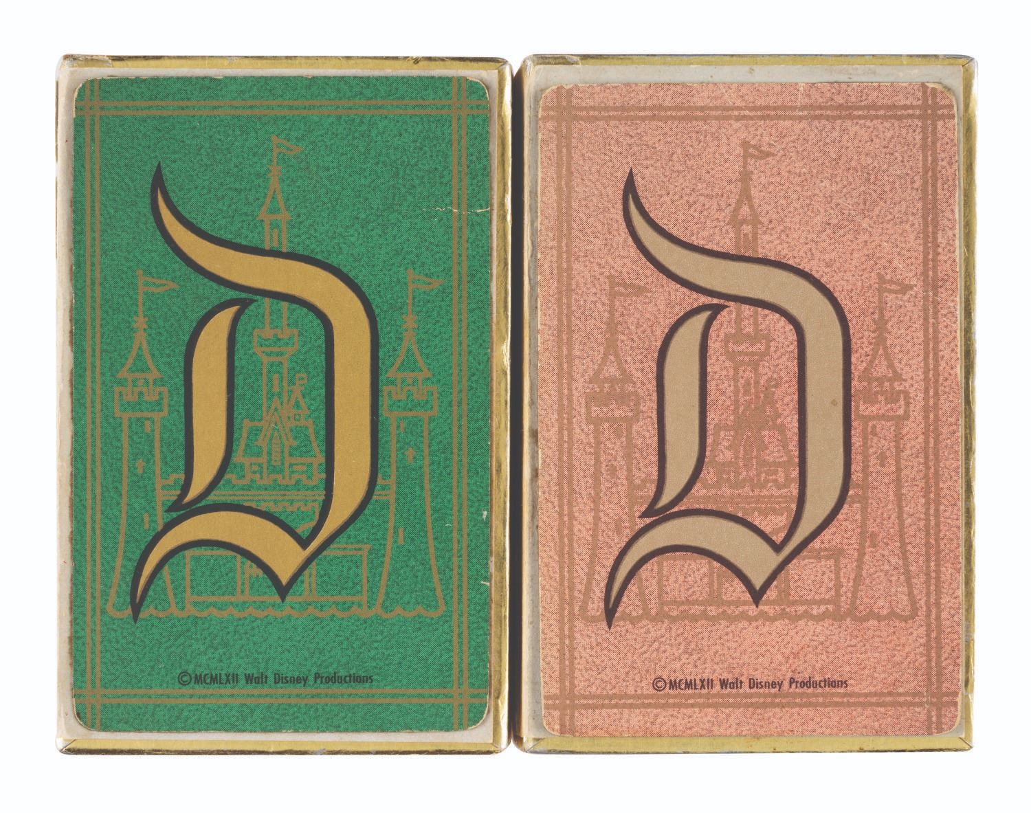 (Disneyland, 1962) A Disneyland Bridge Card Boxed Set. This boxed set comes with a 53-card red deck (missing a Joker) and a 53-card green deck (missing a Joker). Each deck features the Sleeping Beauty Castle and "D" monogram on the reverse and its respective box. Measuring 2.25"x3.5", the cards come within their 4.75"x4"x.75" boxes. The cards are in fair condition with yellowing, fading, spots of discoloration and wear throughout, with tears and wear to the edges and corners of the boxes.