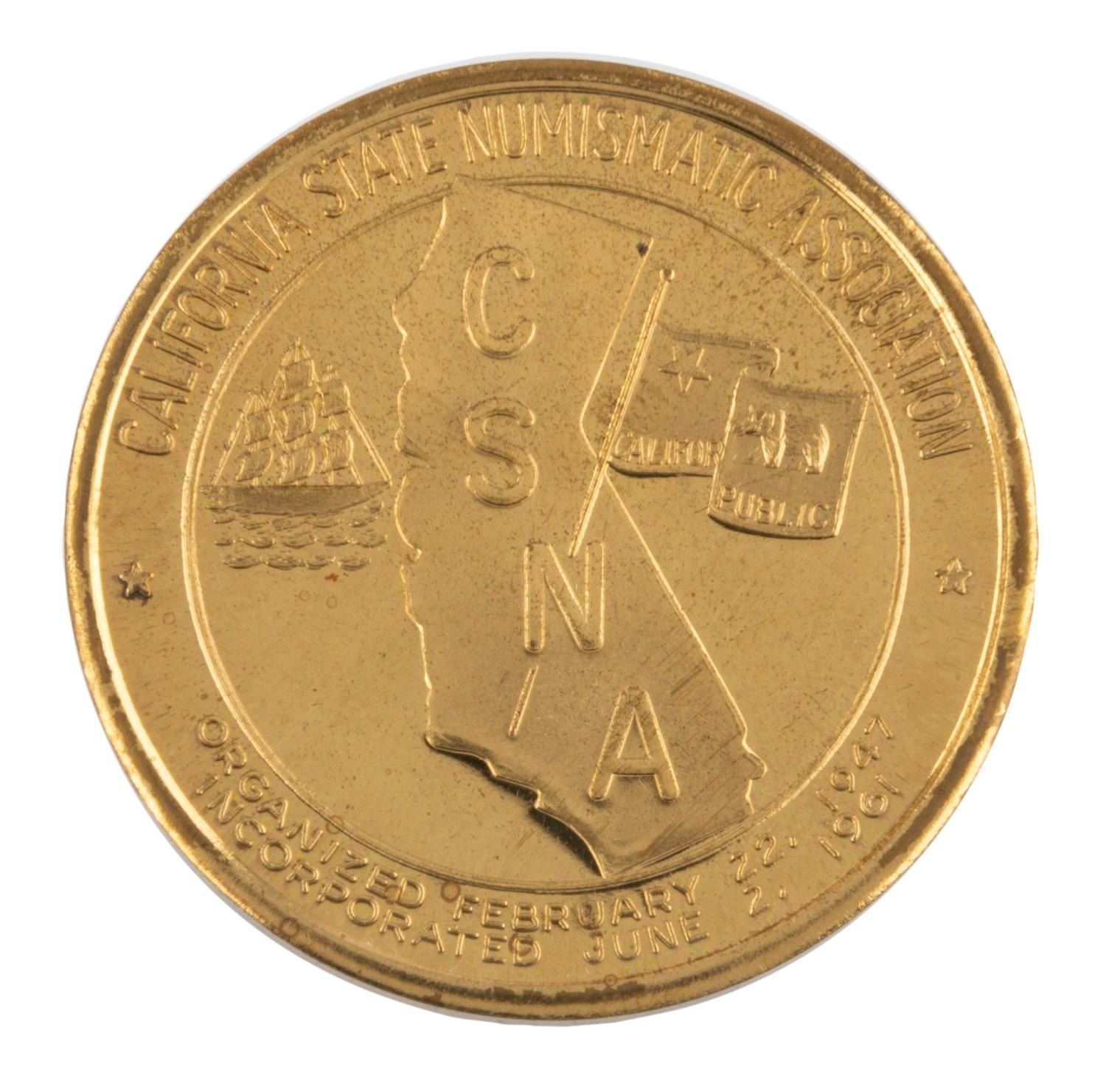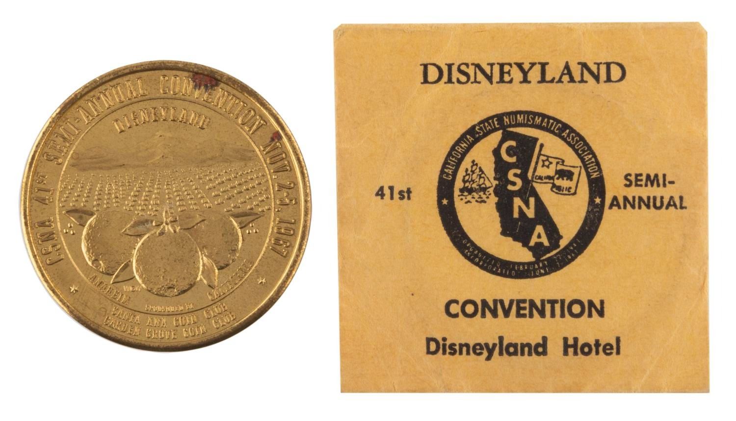 (CSNA, 1967) A gold-tone commemorative coin for the California State Numismatic Association's 41st semi-annual convention for coins, currency, and medallions held at Disneyland from November 2 to 5, 1967. Measuring 1.5" in diameter, the coin is in good condition with light tarnish and comes with its 2” x 2” original envelope in good condition with wear and creasing.