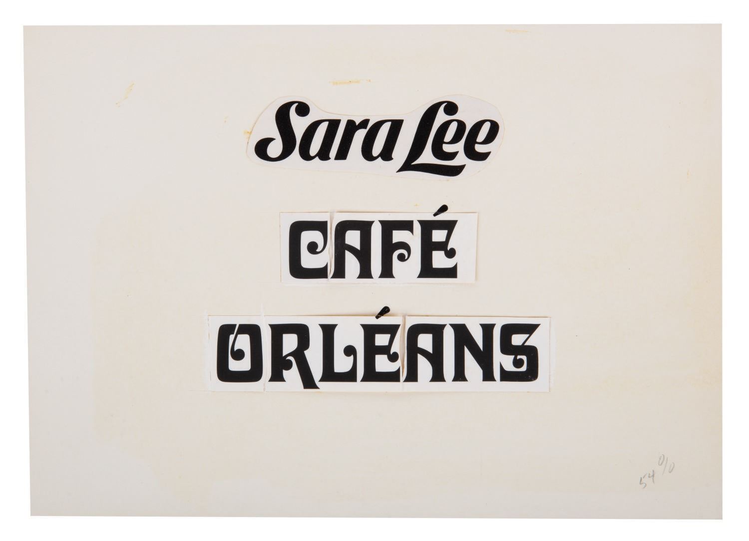 (Disneyland, 1970s) A logo concept design for Cafe Orleans presented by sponsor Sara Lee. The letters have an image size of 4.5"x5" mounted on a 10"x7.25" board and display in fine condition.