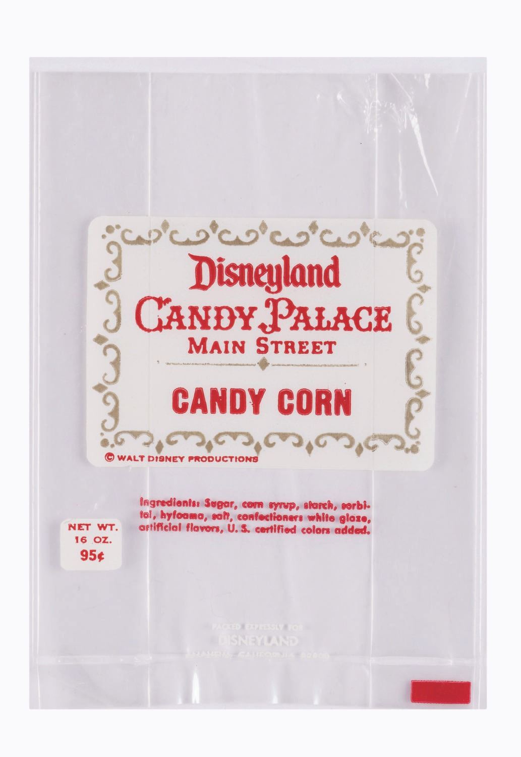 (Disneyland, 1960s-70s) A Disneyland Candy Palace Candy Corn Bag from the popular Main Street, U.S.A. shop. Measuring 4” x 5.75”, the plastic bag is in good condition with mild creases and wear from handling and age, and a .25" tear at the opening.