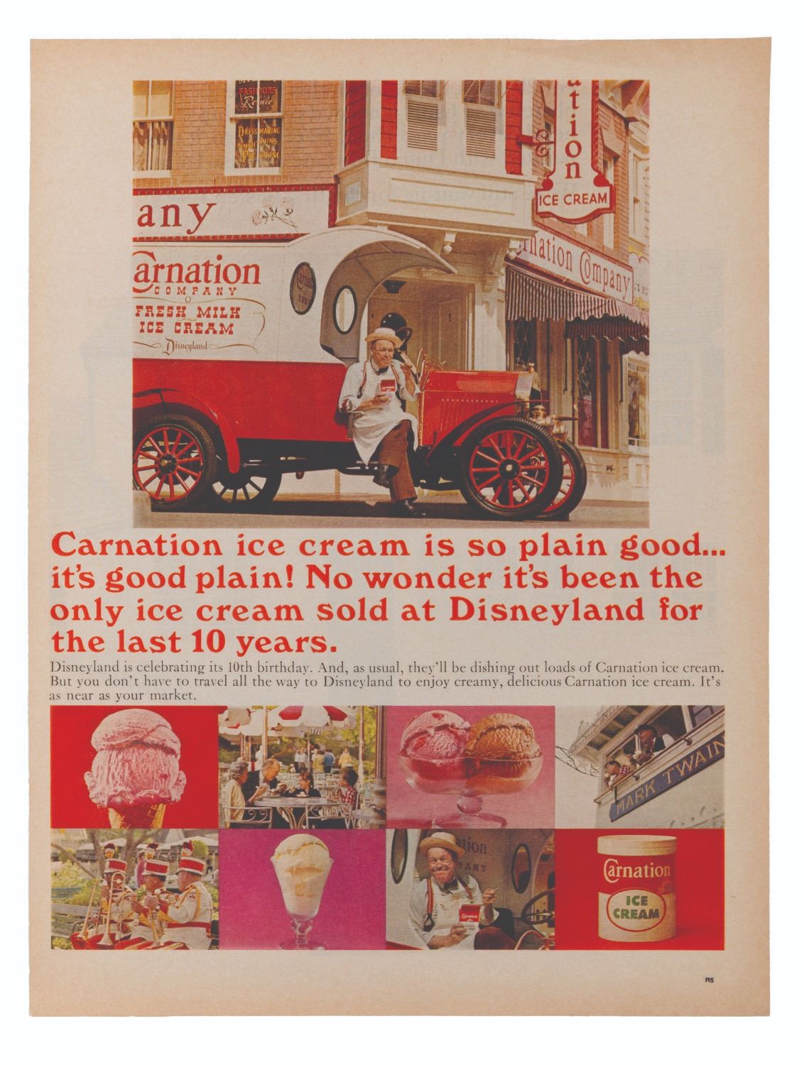 (Carnation, 1965) A single-page magazine insert for Carnation Ice Cream at Disneyland. Measuring 10.25" x 13.5", the insert displays in very good condition with creases and light discoloration from age.