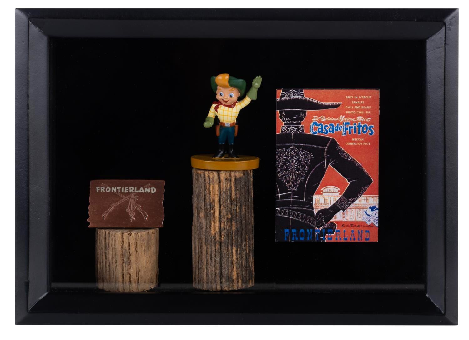 (Disneyland, 2005) A shadow box containing three mementos from Disneyland's Casa De Fritos restaurant. Included are a Disneyland 50th anniversary pewter miniature of Frito the Kid designed by Kevin Kidney and Jody Daily, a 50th Frontierland logo pin, and a miniature Park attraction poster for the restaurant. The shadow box measures 7.5" x 5.5" and 2.5" thick and is in very good condition with light wear from use and a crack in the paint along the bottom edge. The back of the box has been stapled shut. The interior items are in fine condition unexamined out of frame.