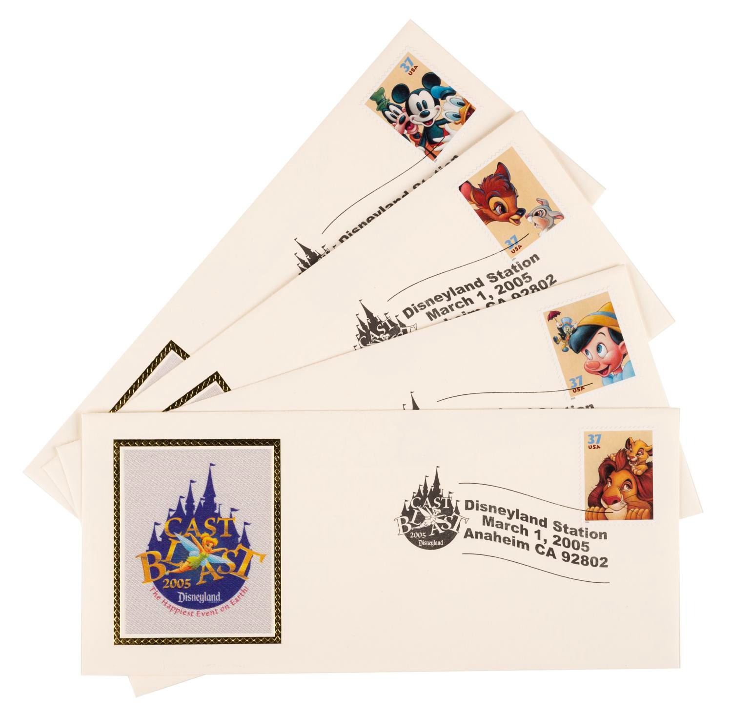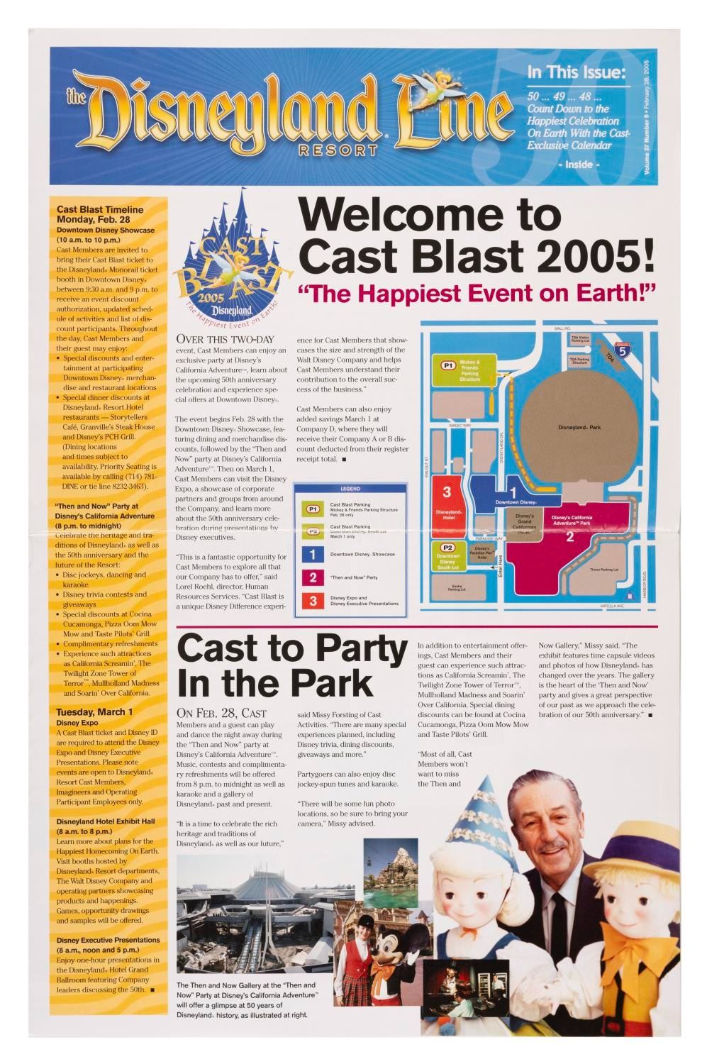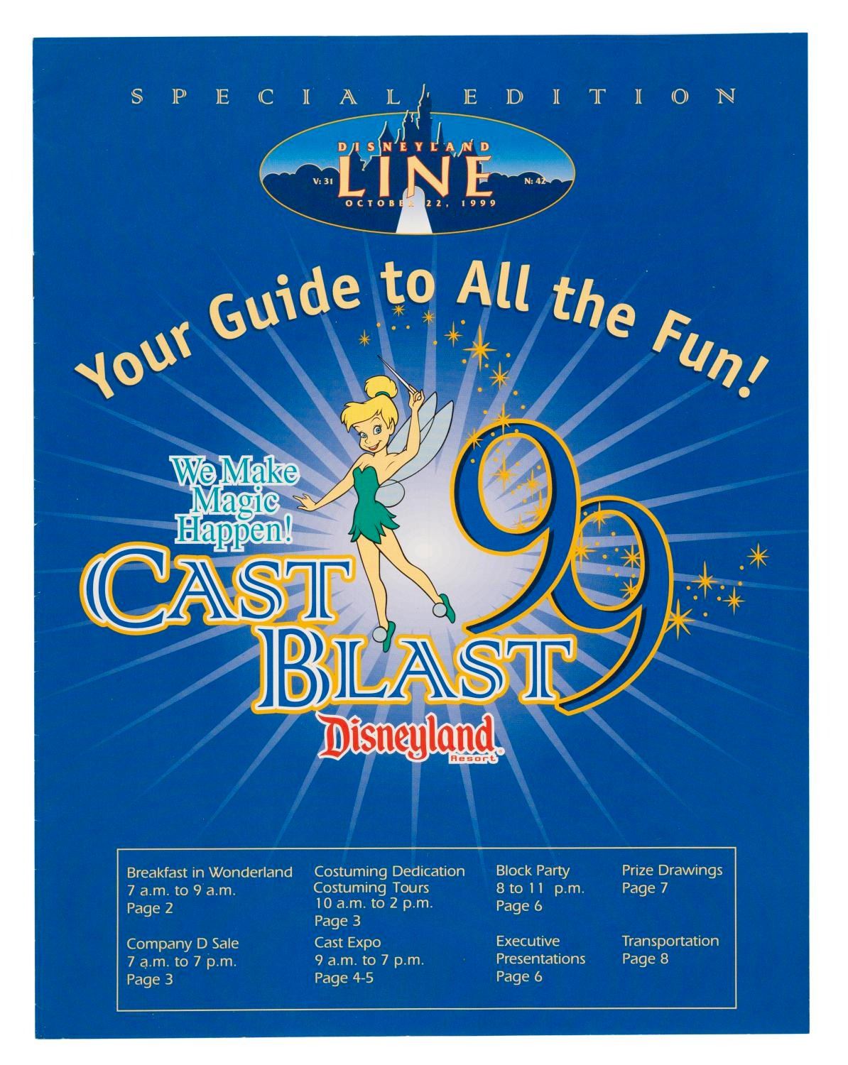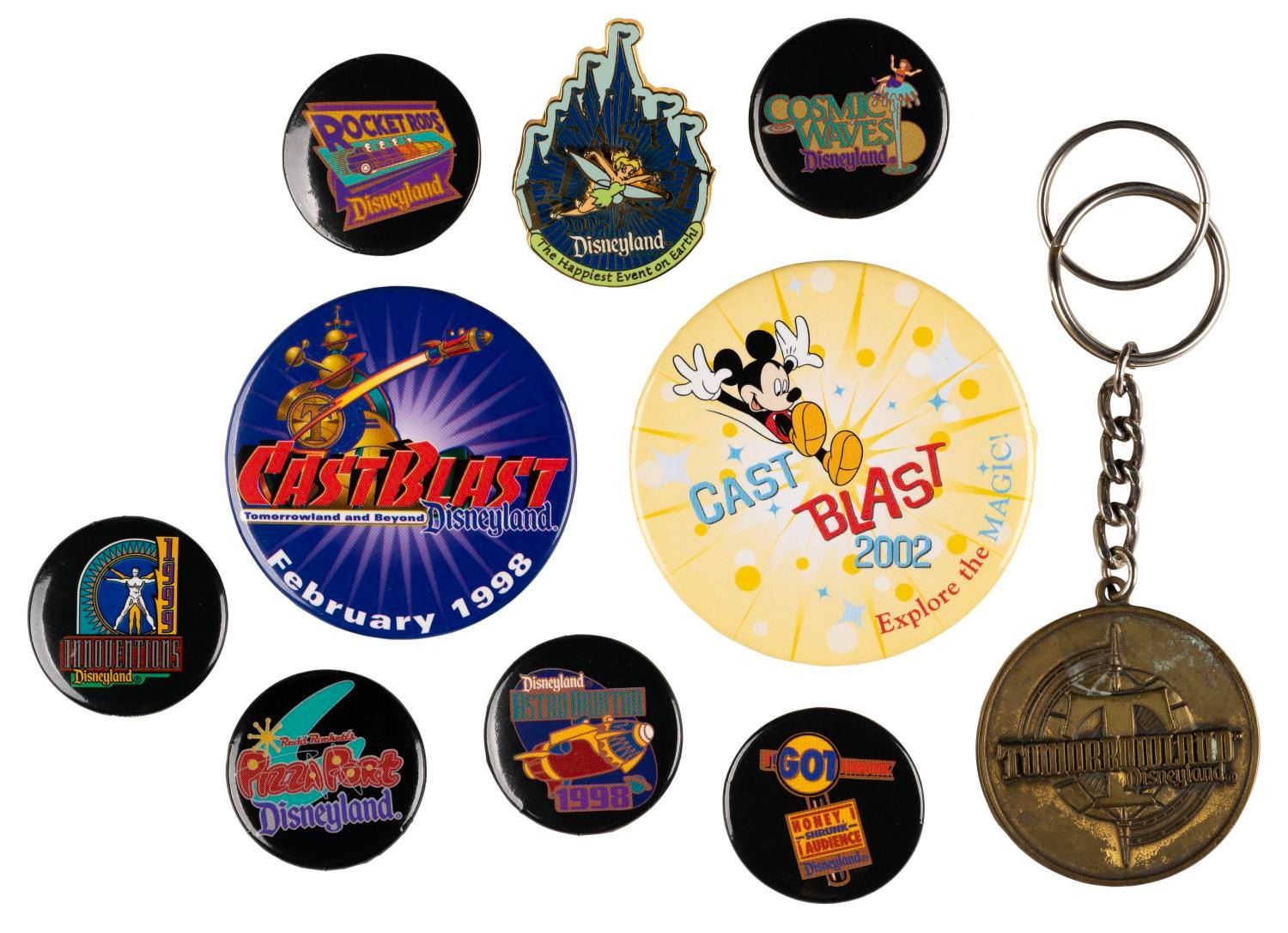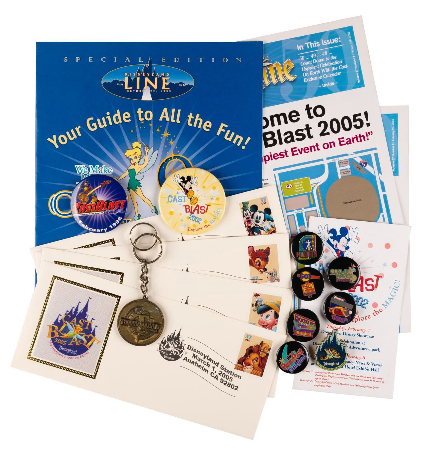 (Disneyland, 1998-2005) A collection of "Cast Blast" annual Cast Member event souvenirs including three copies of the Disneyland Line, eight buttons featuring six of New Tomorrowland attractions that debuted in 1998, a 2002 schedule, and 5 commemorative envelopes postmarked with the logo for the 2005 Cast Blast. Also included is a New Tomorrowland Grand opening commemorative bronze keychain. The collection is overall in very good condition with some light handling wear, the envelopes in fine condition in protective sleeves, the schedule in good condition with heavy handling wear, and the keychain in good condition with tarnish.