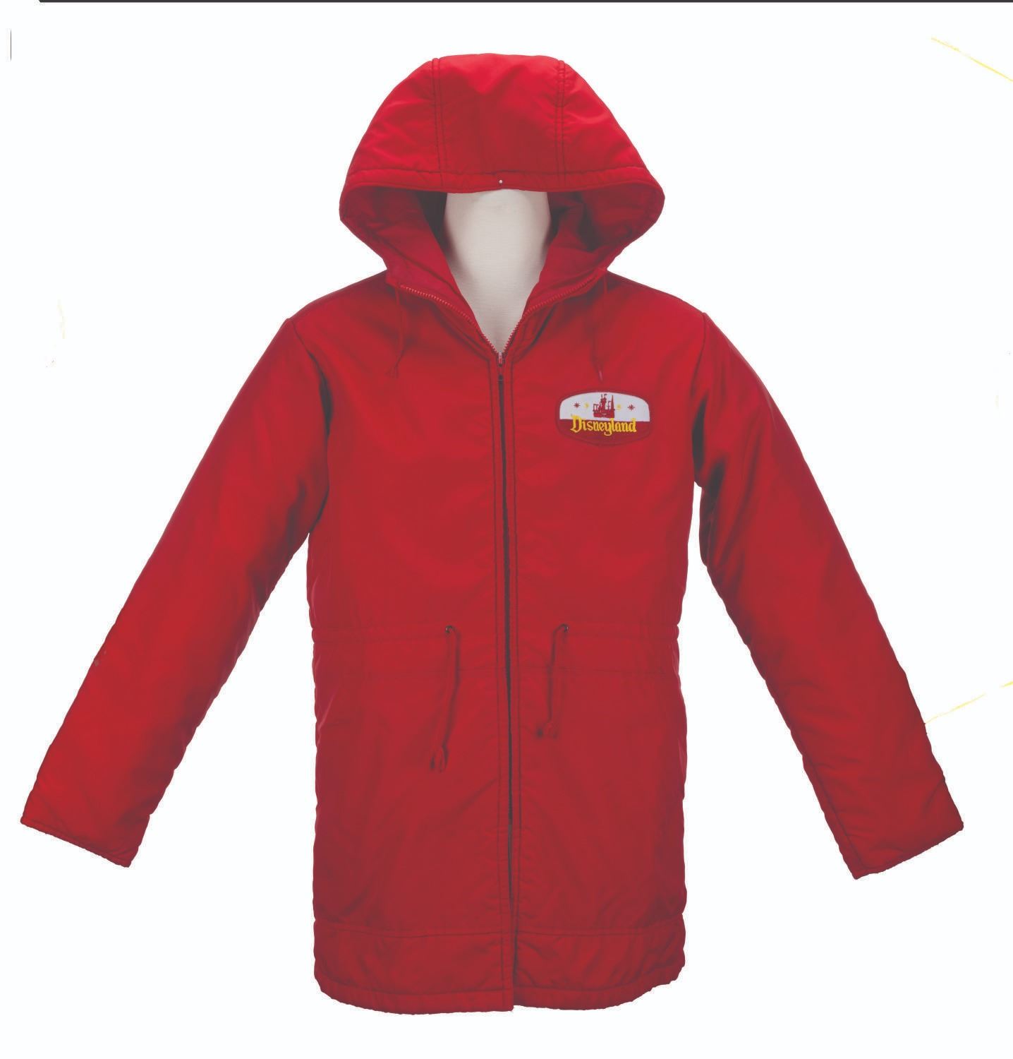 (Disneyland, 1980s-90s) A red Cast Member parka with an embroidered Disneyland patch on the chest. Labeled a size L, the coat is in very good condition light wear from Park use.