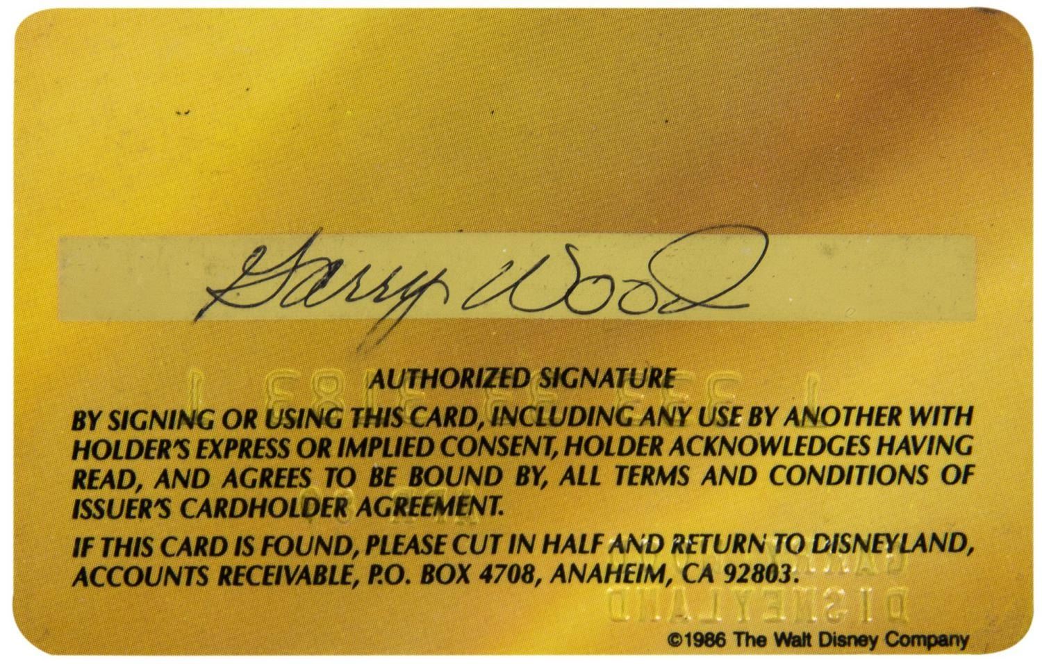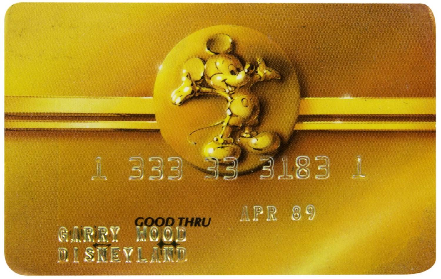 (Disneyland, 1986) A Disneyland credit card belonging to Cast Member Garry Wood. Measuring 2.25" x 3.5", the card is in fair condition with heavy peeling to the laminate, scratches, and wear from use including some separation around the edges.
