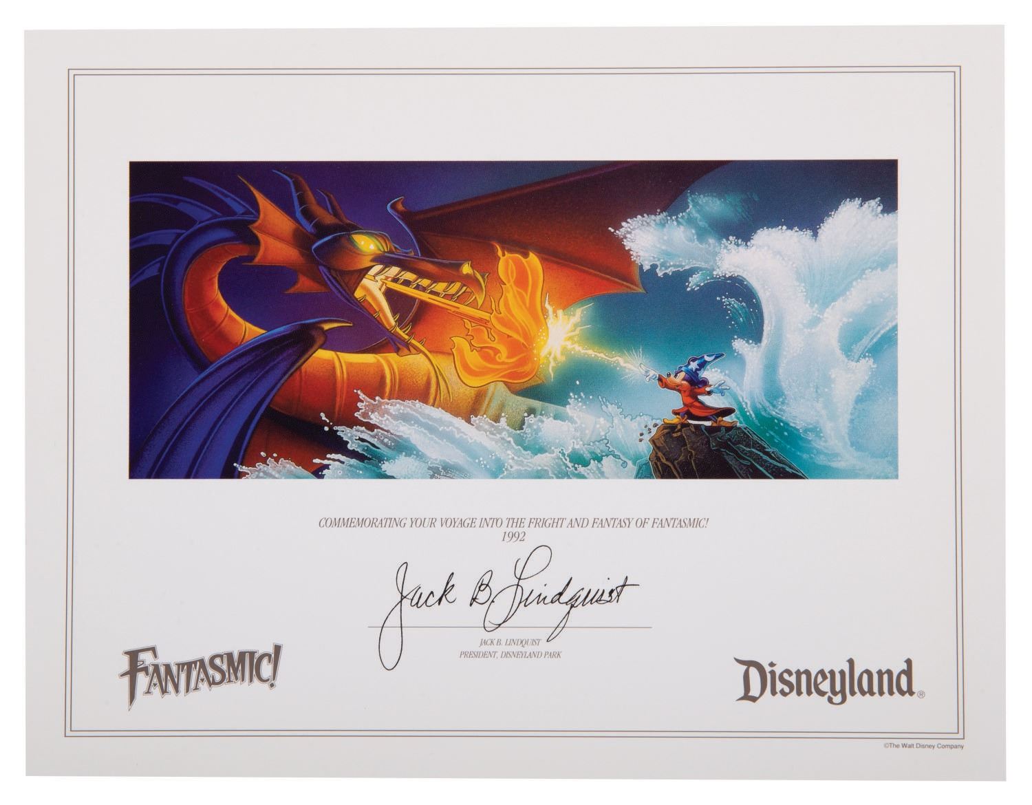 (Disneyland, 1992) A commemorative certificate awarded to Cast Members involved with the debut of Fantasmic! at Disneyland. The certificate has been signed by then-President of Disneyland Park, Jack Lindquist. Measuring 8.5"x11", the document displays in fine condition.