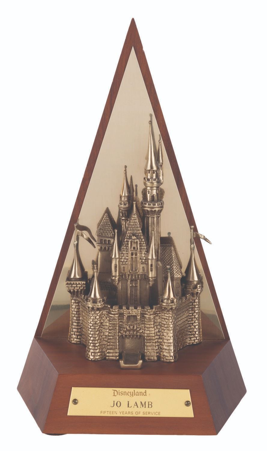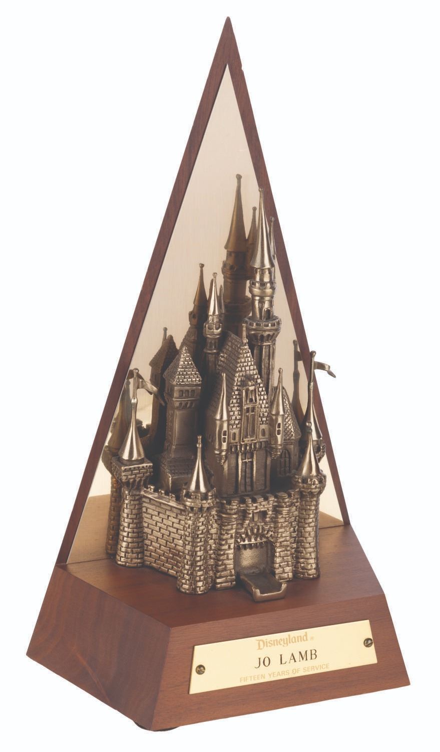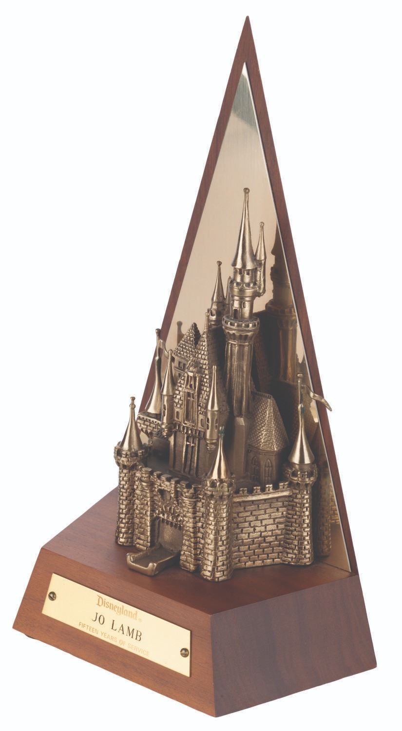(Disneyland, 1980s-90s) A Disneyland Cast Member Fifteen-Year Service Award featuring the Park's iconic Sleeping Beauty Castle. Measuring 10.5" tall and 6.5” wide, the award is in very good condition with minor wear.