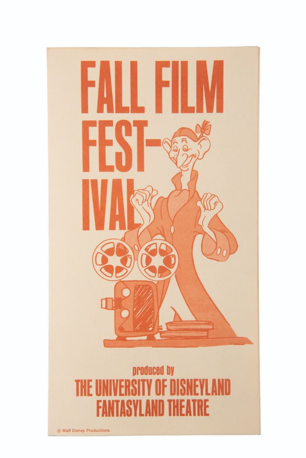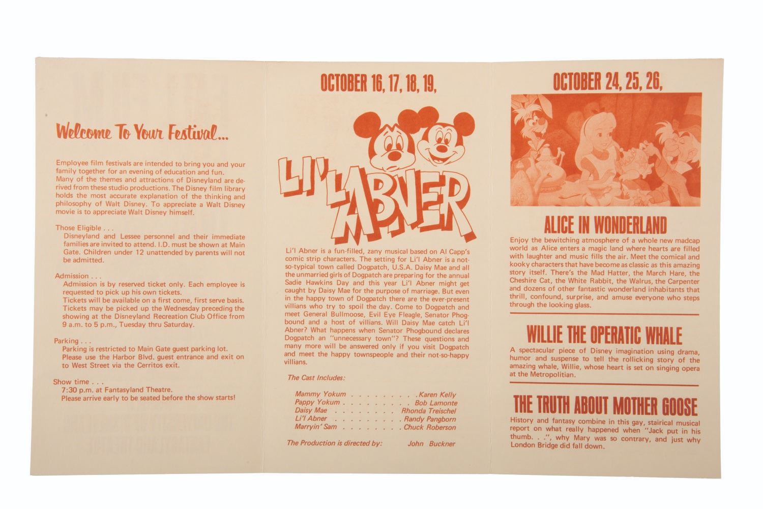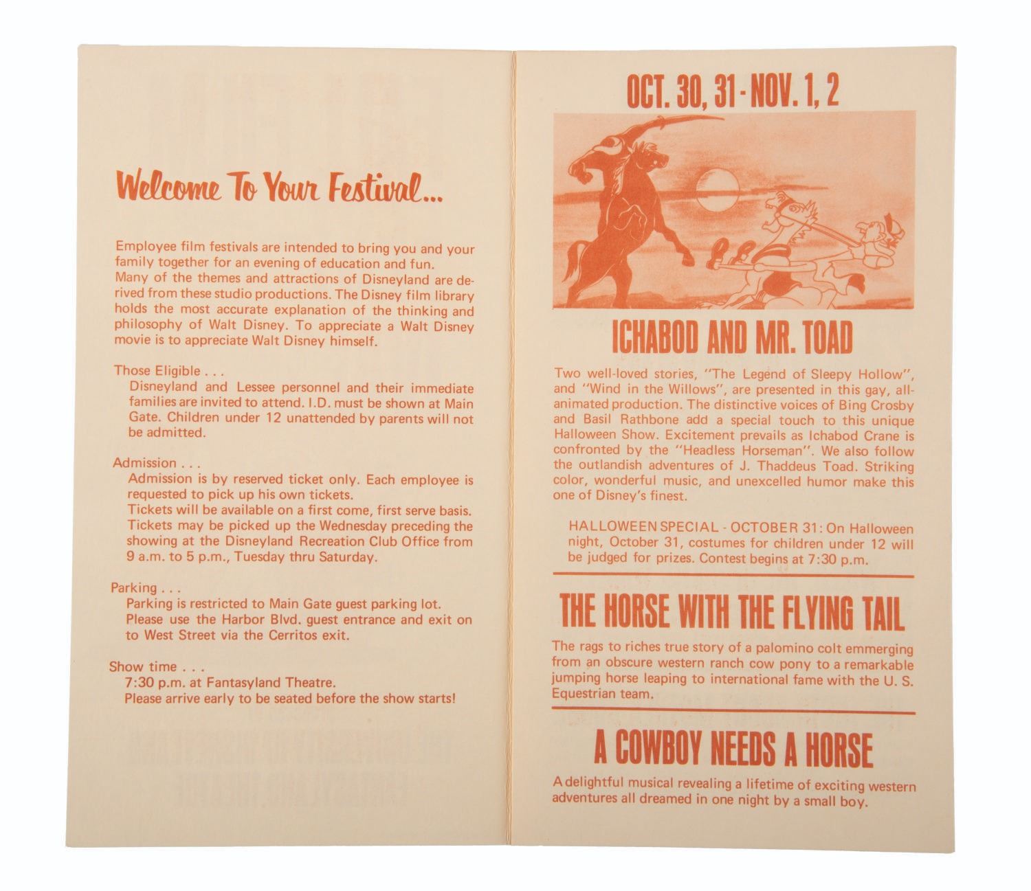 (Disneyland, 1970s-80s) A Fall Film Festival Brochure, from the Disneyland University for Cast Members. Films include “The Adventures of Ichabod and Mr. Toad,” “Li’l Abner,” and “Alice in Wonderland.” Measuring 8.5” x 4.5” the brochure is in fine condition with a spot of discolorationon the back.