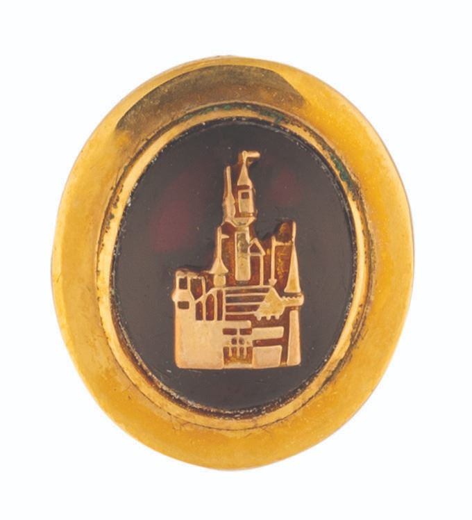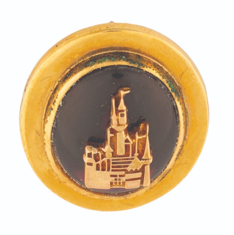 (Disneyland, 1960s-80s) A pin awarded to Disneyland Cast Members for five years of service. The pin has a glass ruby stone in the center and an embossed Sleeping Beauty Castle on top. Measuring 0.75” tall, the pin is in very good condition with light oxidation and wear.