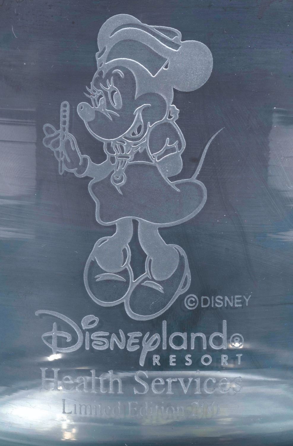 (Disneyland, 2000s) A Disneyland Resort Cast Member exclusive Health Services etched glass candy jar featuring Minnie Mouse as a nurse. Measuring 4" in diameter x 6.5" high, the limited edition 200 candy jar is in very good condition.