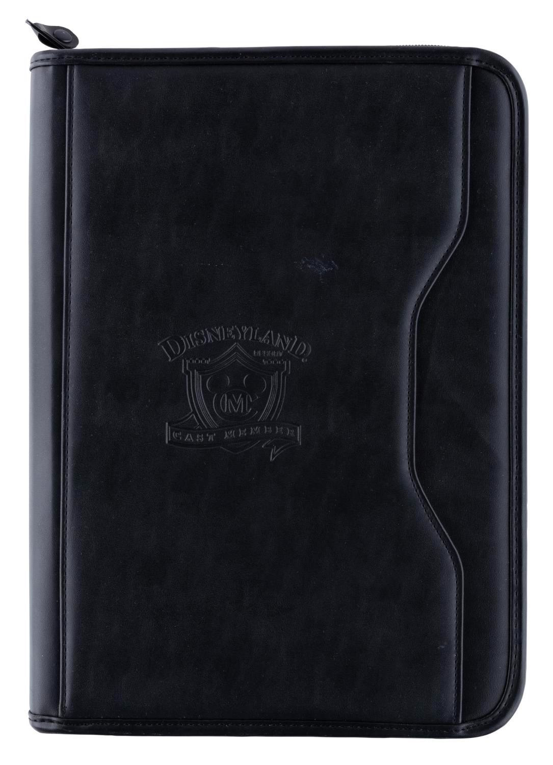 (Disneyland, 1990s-2000s) A Disneyland Resort Cast Member-branded padfolio featuring four Cast Member pens and a notepad. Measuring 10” x 13.5”, the padfolio is in good condition with scratches, creases, and wear.