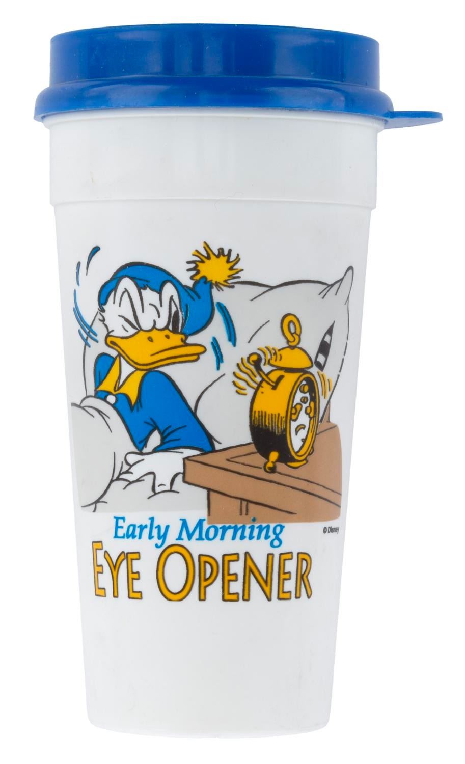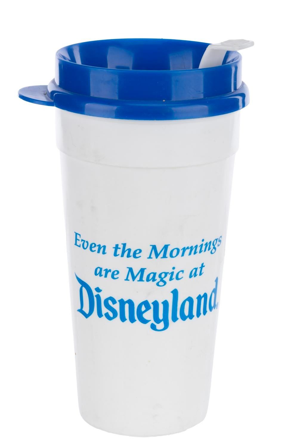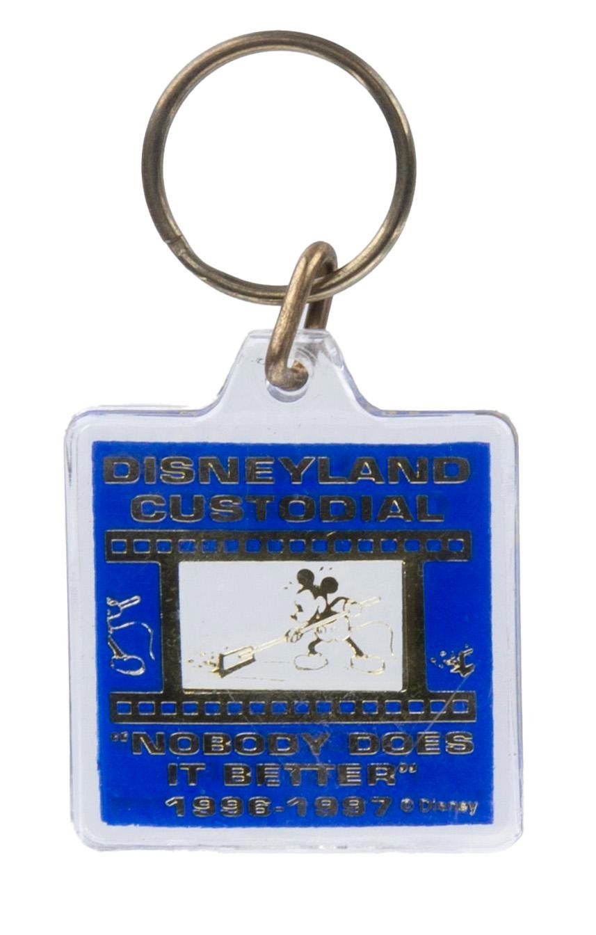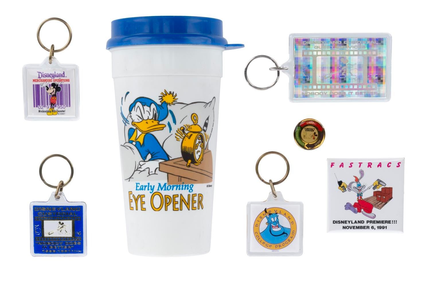 (Disneyland, 1980s-90s) A Disneyland Cast Member souvenir collection including four keyrings from Custodial Services, Merchandise Operations, and the College Program; one travel tumbler, a Roger Rabbit Fastracs button, and one Contact Center pin. Measuring from 0.75" in diameter to 6.75" tall and 4" in diameter, each souvenir is in very good condition with typical color shift to the pin from age, and slight handling wear to the tumbler.