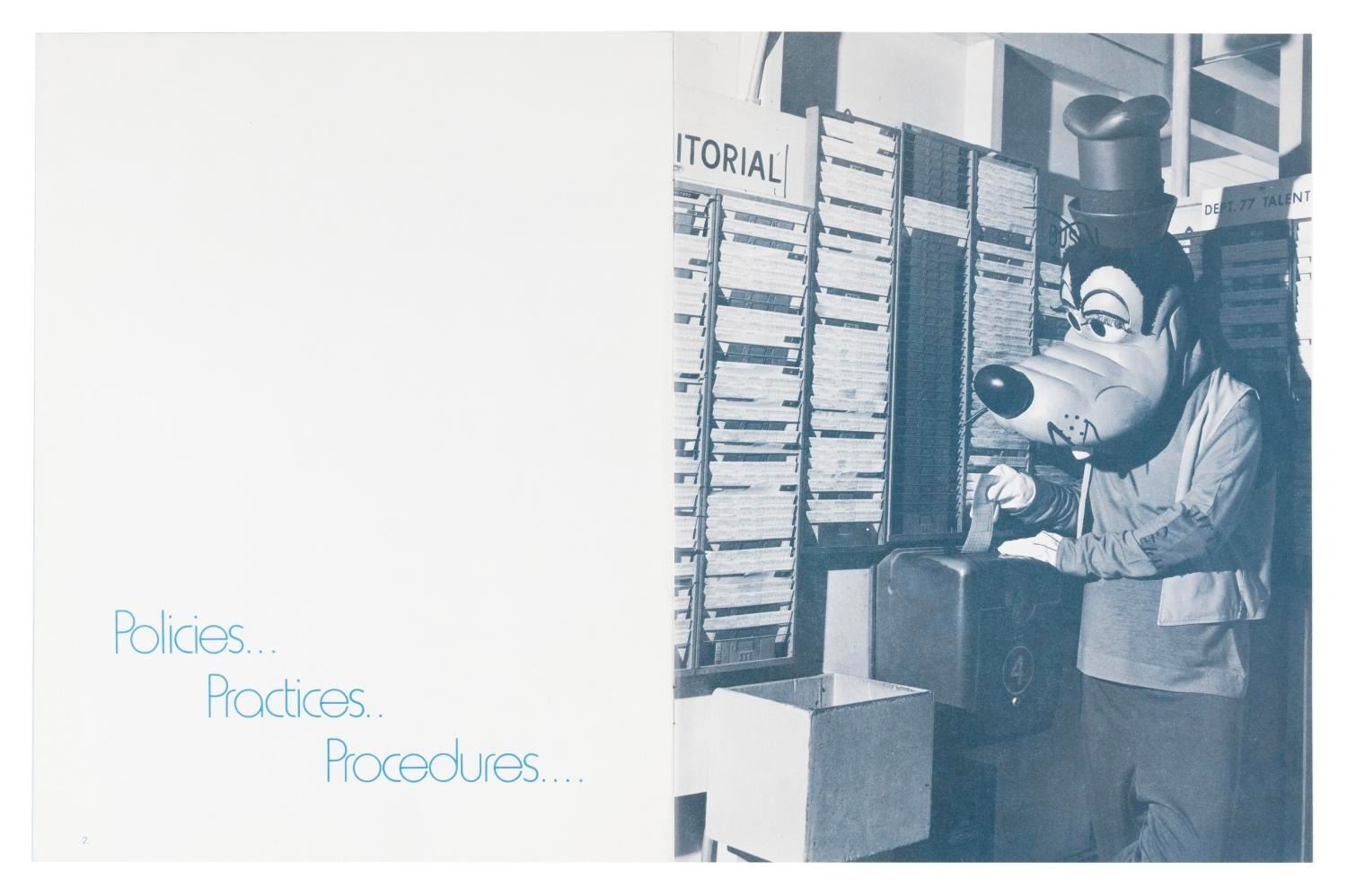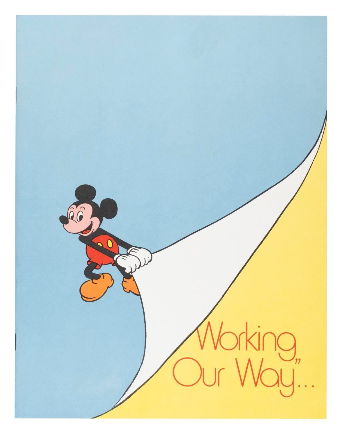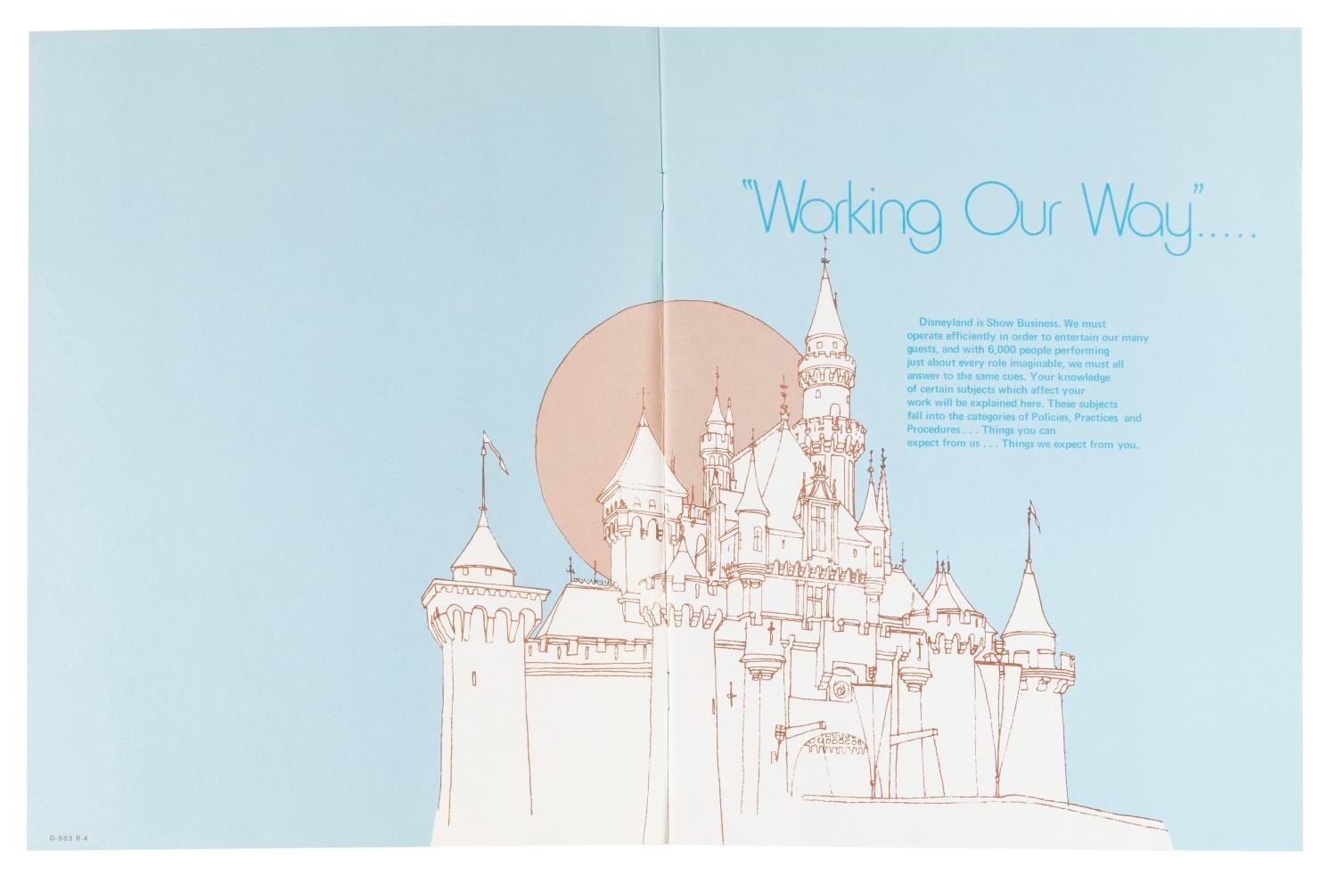(Disneyland, 1974) A Working Our Way orientation booklet given to Cast Members outlining the policies, practices, and procedures for working at the Park. Measuring 8.5” x 11”, the booklet is in good condition with light stains and creases.