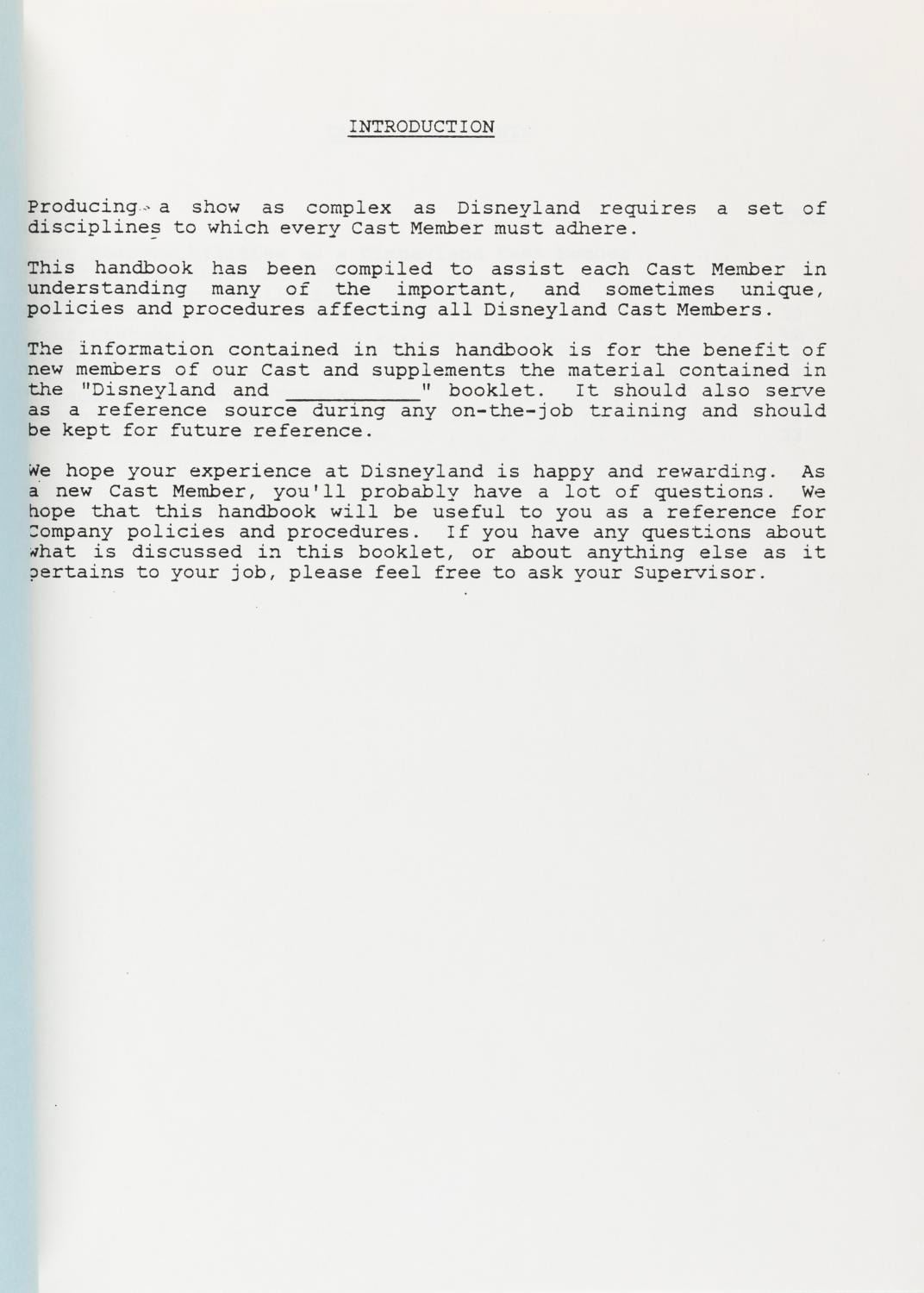 (Disneyland, 1980s) A Working Our Way orientation book given to Cast Members, outlining the policies and procedures to follow when working for the Park. Measuring 8.75” x 11”, the 41-page booklet is in good condition with light wear and heavy pencil inscriptions on the front from a Cast Member.