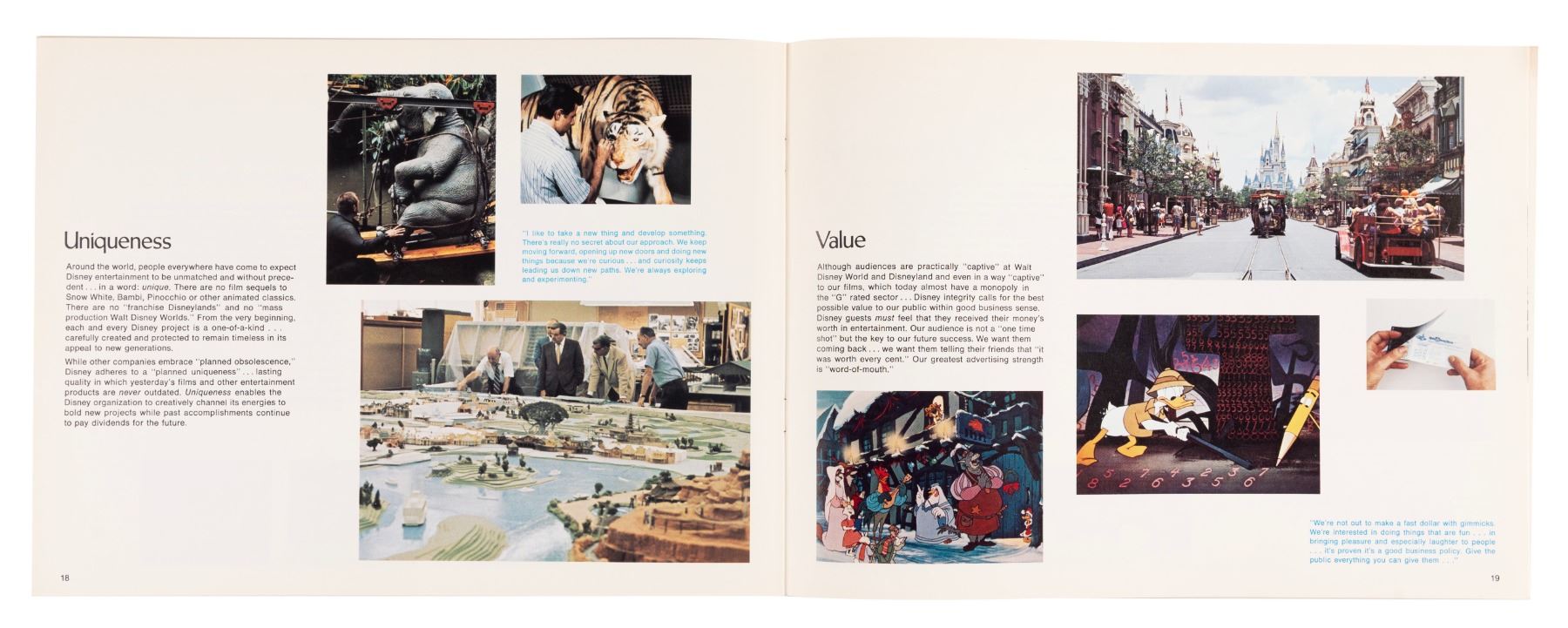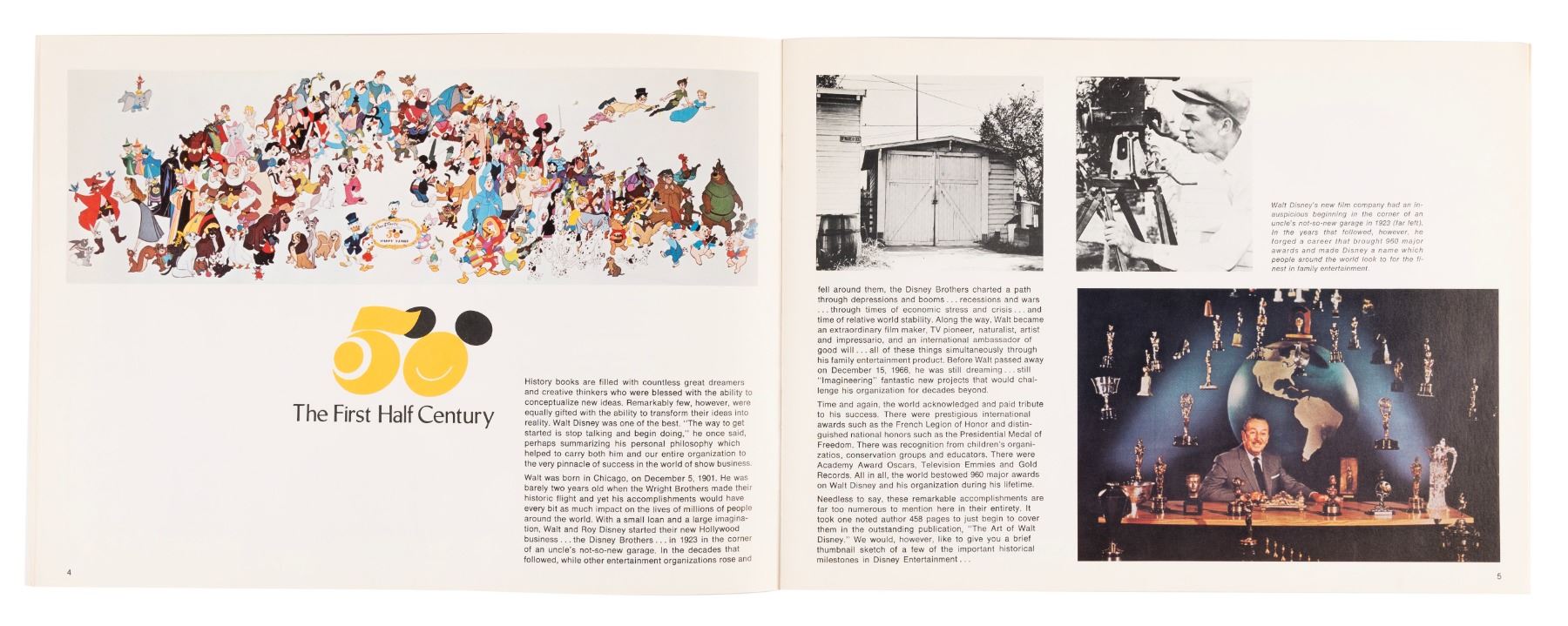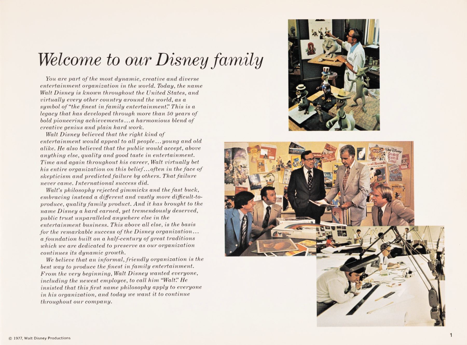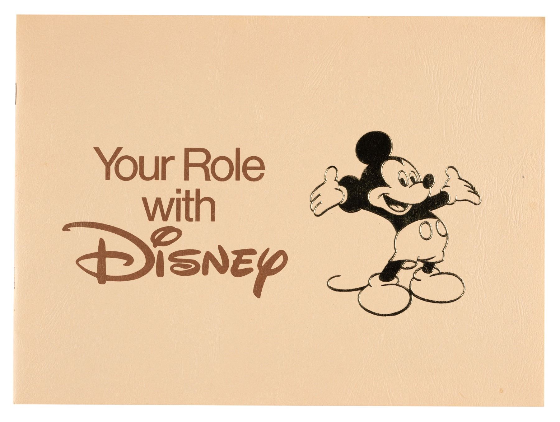 (Disneyland, 1977) A book for new Disneyland Cast Members featuring a gold embossed Mickey logo on the cover. Full of colorful pictures, the book covers general expectations of Disneyland employees and gives a brief history of the Walt Disney Company's first 50 years. This 24-page book measures 8.5" x 11.5" and is in very good condition with minor wear from handling.