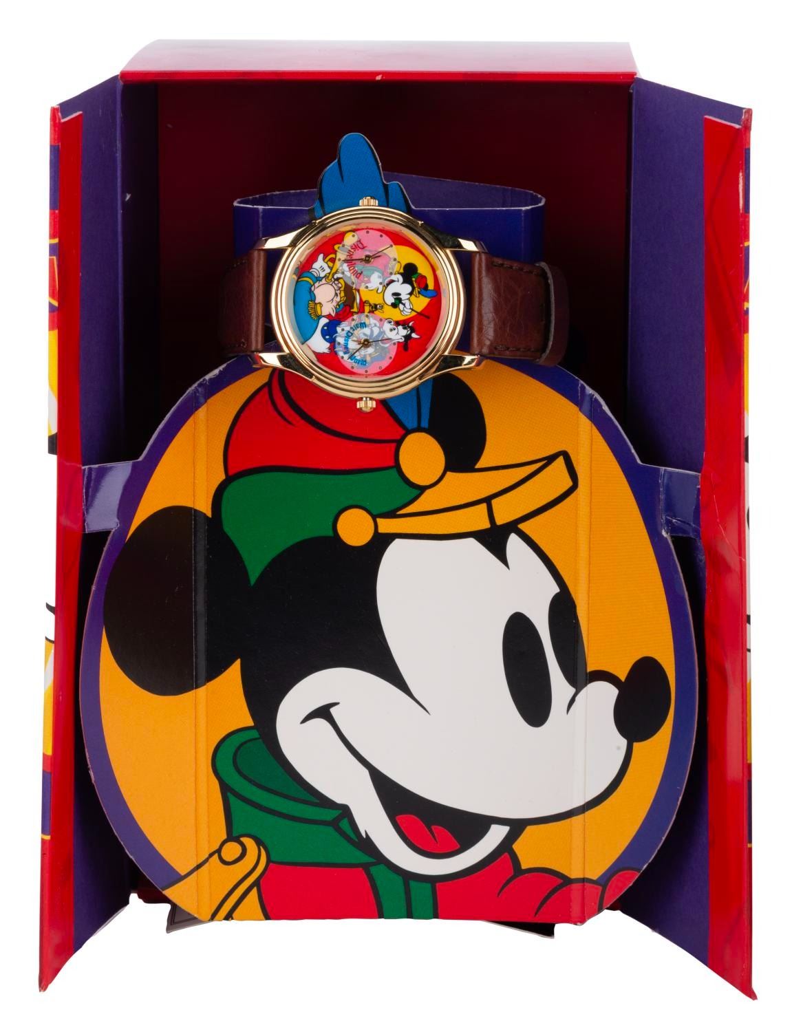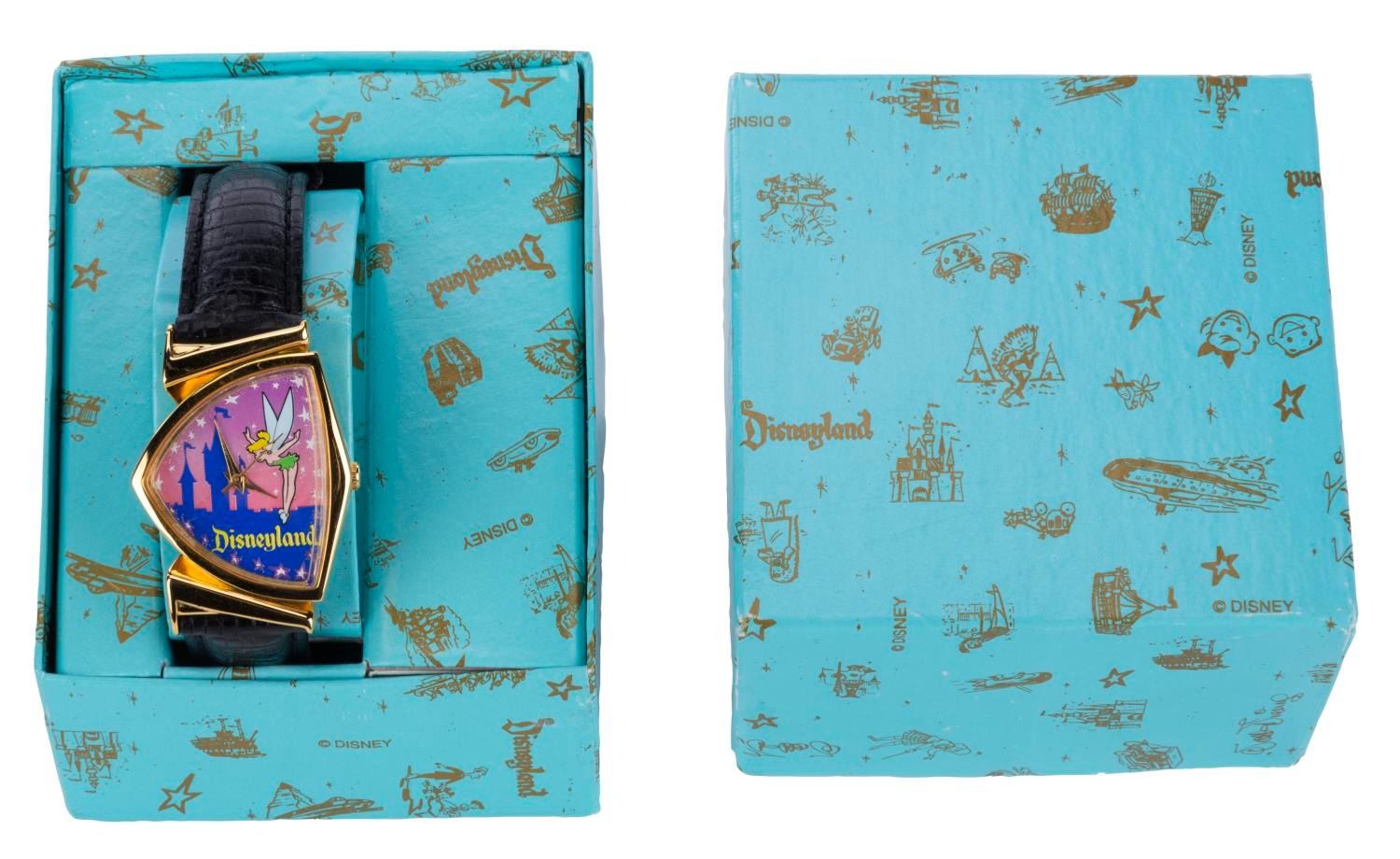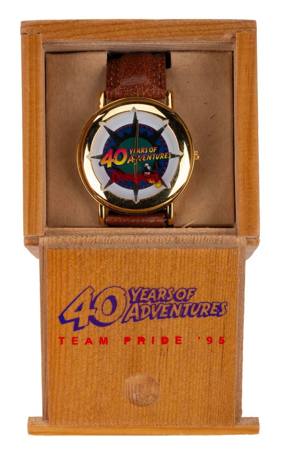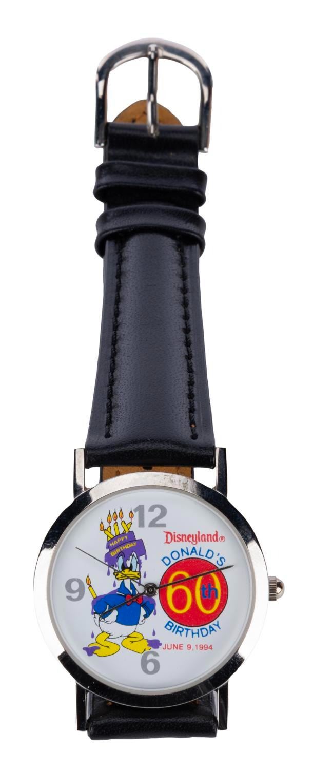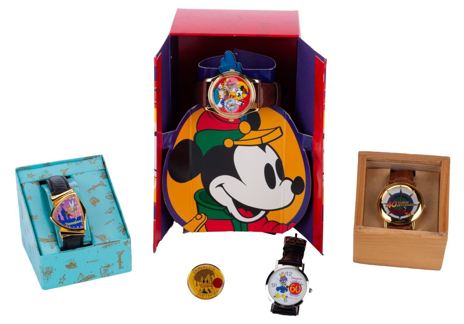 (Disneyland, 1993-1995) A collection of three rare Disneyland Cast and Disneyana Convention watches. The Disneyana watch from the 1993 convention is a limited edition of 1800. The Donald Duck 60th birthday watch comes with a pin and is numbered 267/500. The 40 Years of Adventure Watch is numbered 1275/5000 and the Team Pride Tinker Bell watch is numbered 1117/3000. The watches are in fine unworn condition, with some showing slight scuffs. The watches require batteries and service to function. The Donald Duck pin displays some color shift from age.