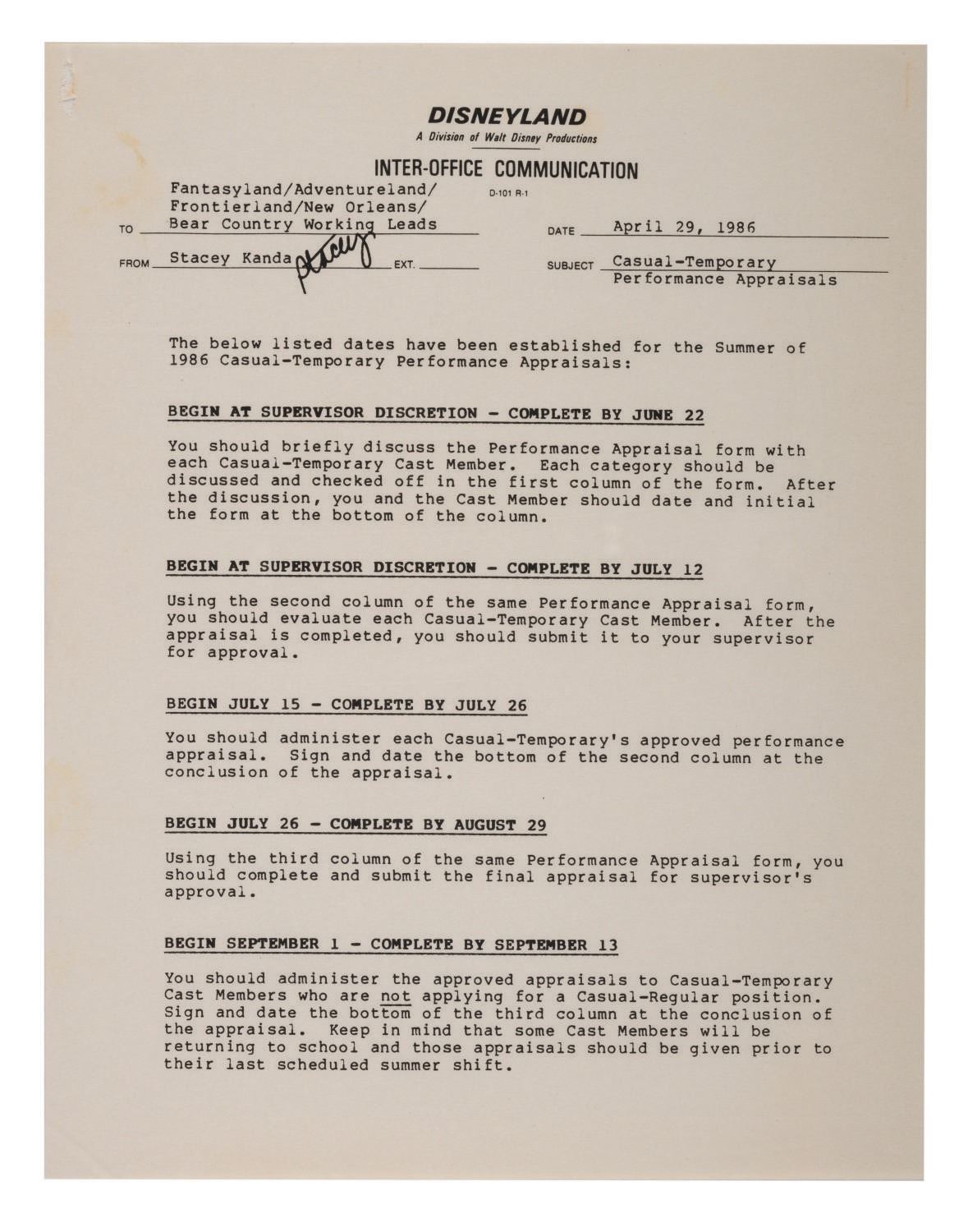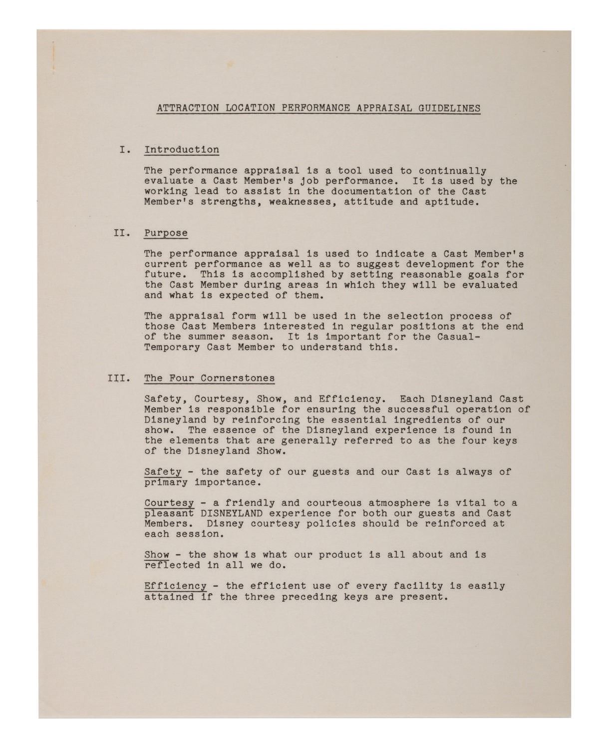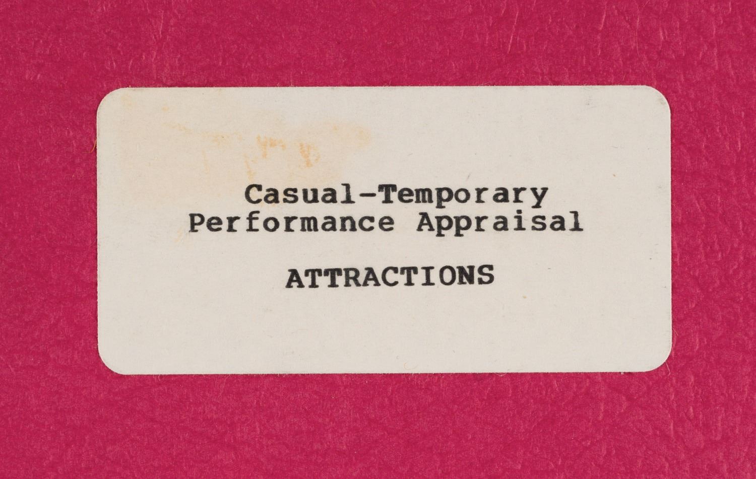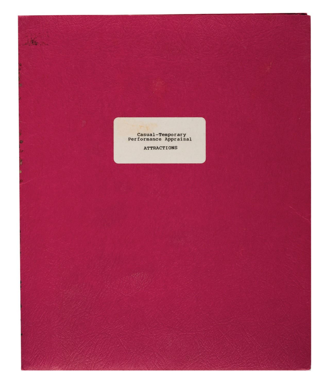 (Disneyland, 1980s) A Casual Temporary Performance Appraisal for a Disneyland Attractions Host. The folder contains Cast Members materials including an 18-page Fantasyland Tomorrowland Product Division document with area maps and (9) pages of the Performance Appraisal and Inter-Office Communications. Measuring 9.5"x11.75", the folder and contents are in very good condition with spots of discoloration to spine, creases and wear throughout.