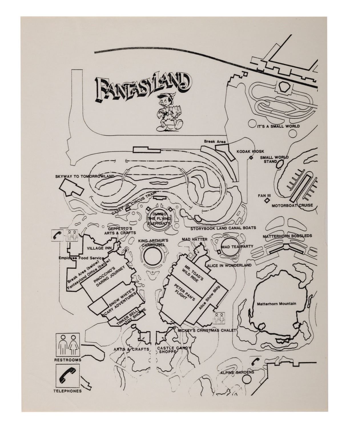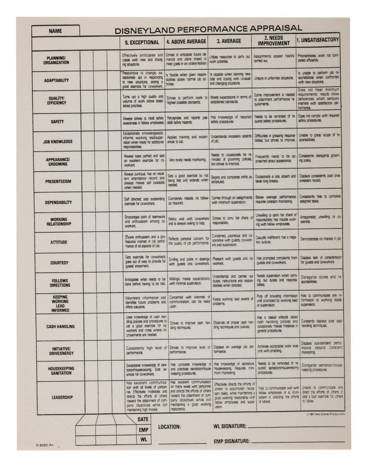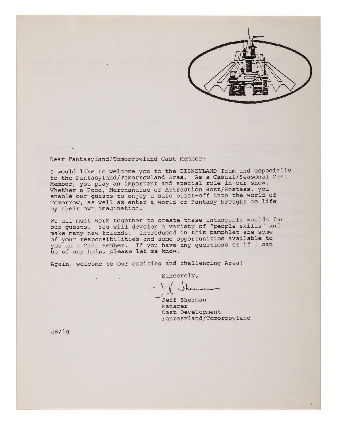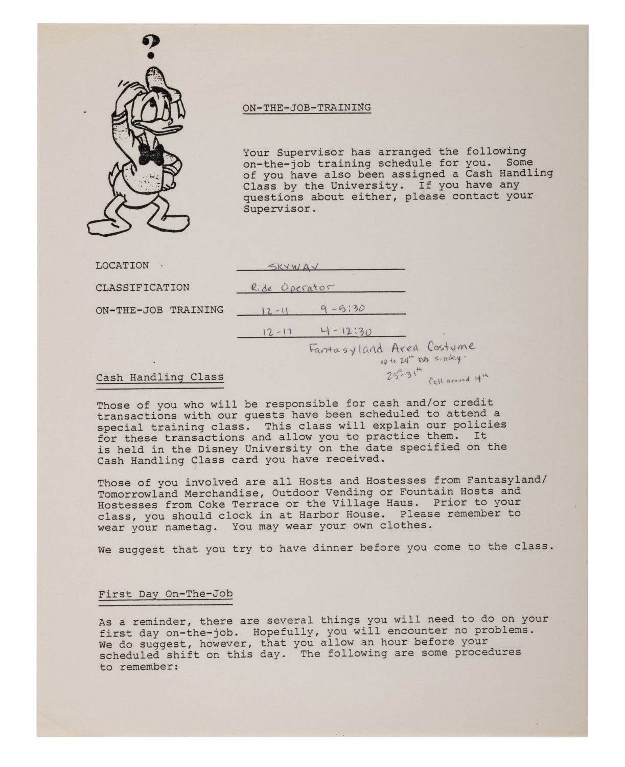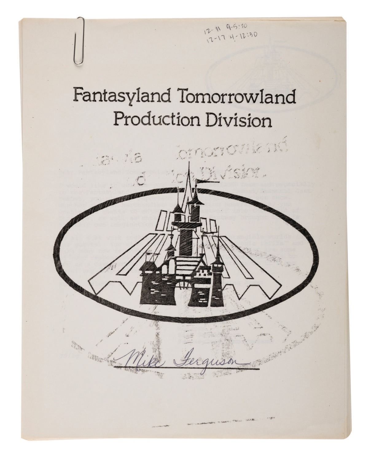 (Disneyland, 1980s) A Casual Temporary Performance Appraisal for a Disneyland Attractions Host. The folder contains Cast Members materials including an 18-page Fantasyland Tomorrowland Product Division document with area maps and (9) pages of the Performance Appraisal and Inter-Office Communications. Measuring 9.5"x11.75", the folder and contents are in very good condition with spots of discoloration to spine, creases and wear throughout.