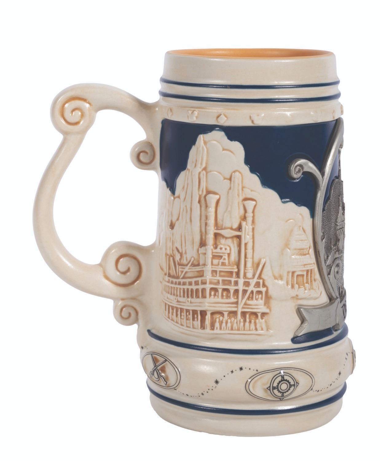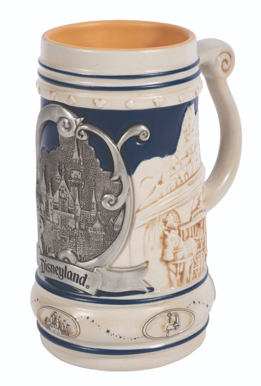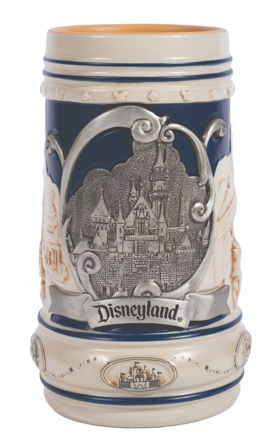 (Disneyland, 1980s-2000s) A decorative ceramic stein featuring a silver relief of Sleeping Beauty Castle. Measuring 7" tall and 3.75" in diameter, the stein is in very good condition with some stray brown paint marks and tape residue on the bottom of the base.