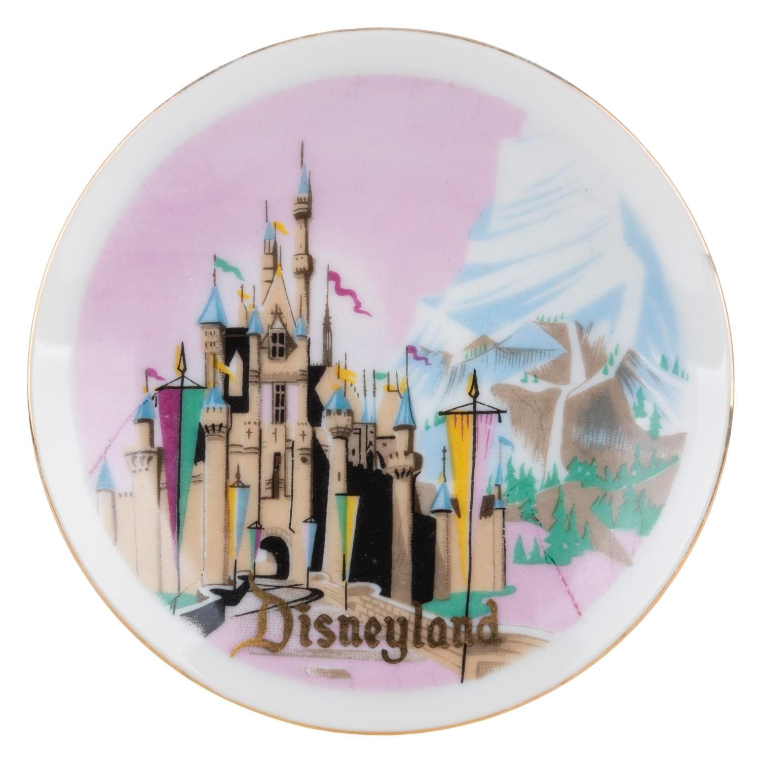 (Disneyland, 1960s) A decorative souvenir mini-plate featuring Sleeping Beauty Castle and the Matterhorn. Measuring 4” in diameter, the plate is in very good condition with light scratches and wear, its original Disneyland pricing sticker still intact on the reverse.
