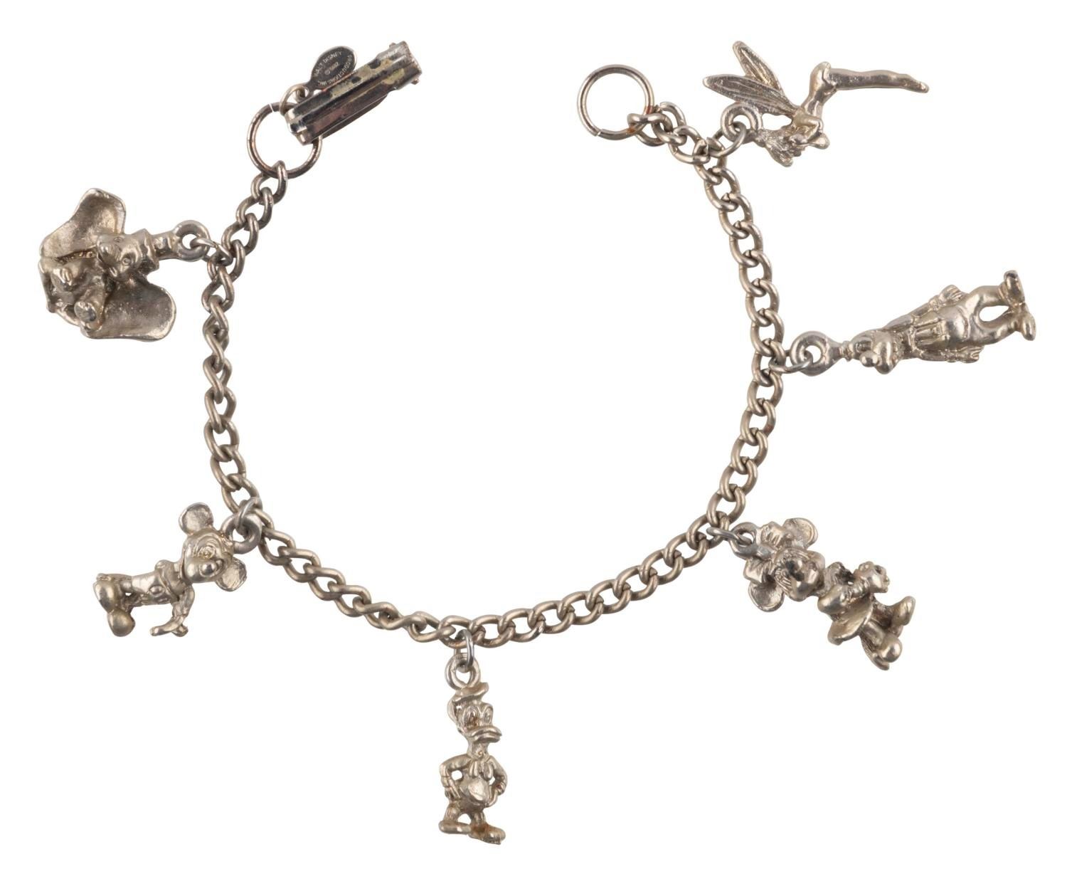 (Disneyland, 1960s) A charm bracelet featuring 6 figural charms of Dumbo, Mickey and Minnie Mouse, Goofy, Donald Duck, and Tinker Bell. Measuring 6" in length, with 0.75" to 1" charms, the bracelet is in fine condition.