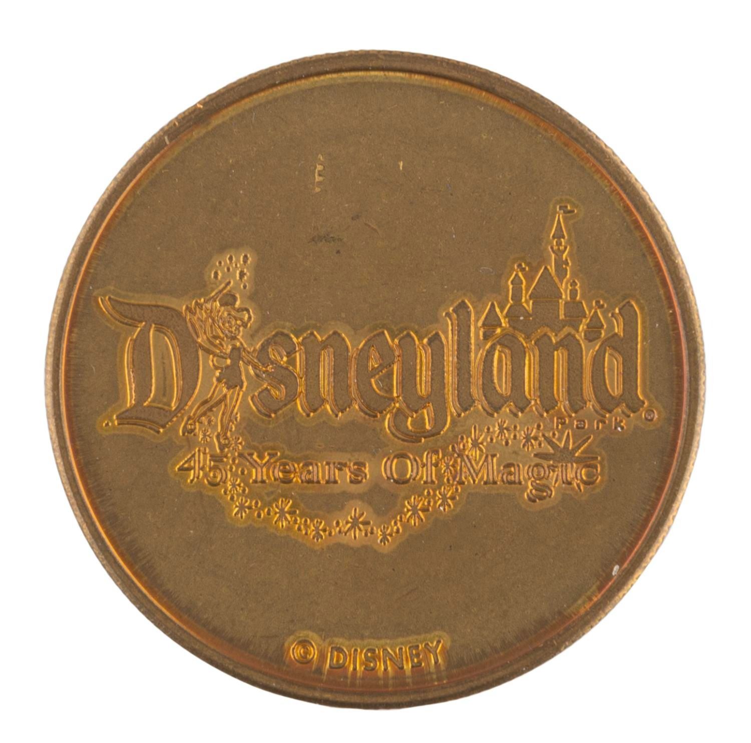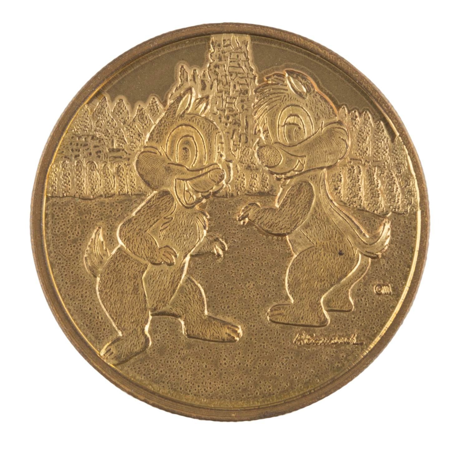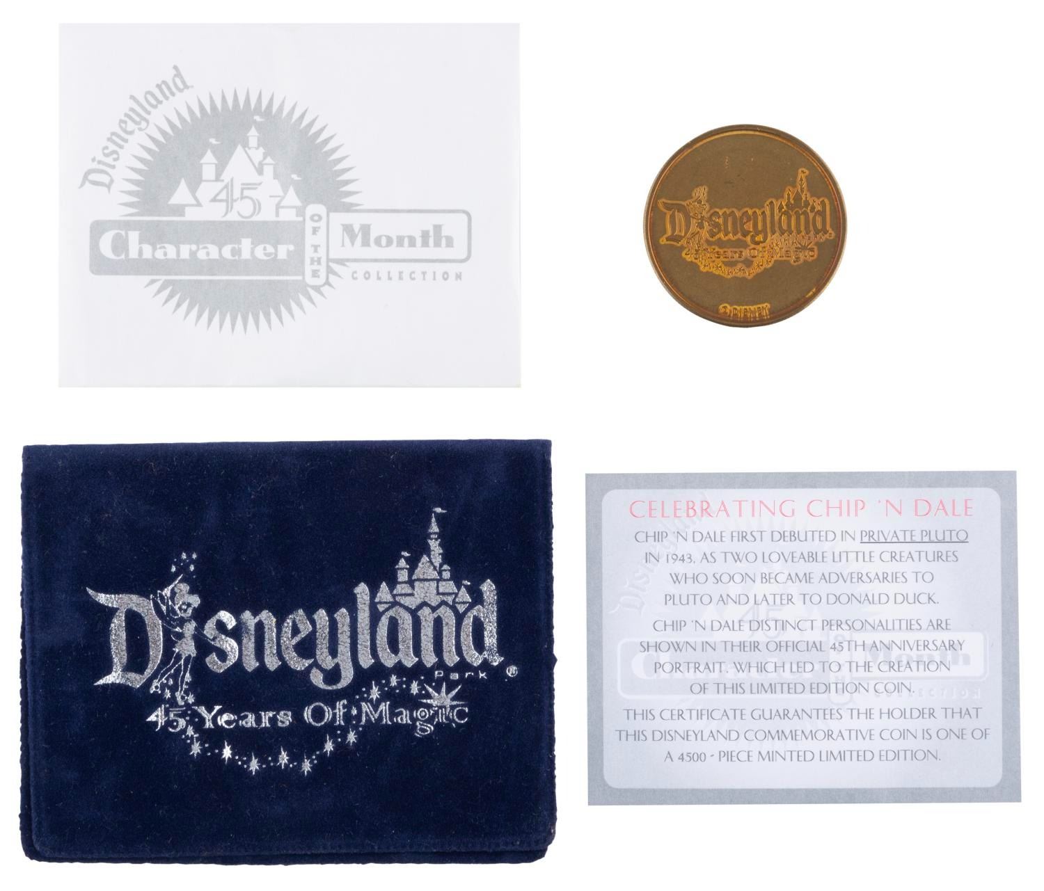 (Disneyland, 2000) A Disneyland Character of The Month Chip n’ Dale Coin, released during the 45 Years of Magic celebration and limited to an edition of 4,500 pieces. Measuring 1.5” in diameter, the coin is in fine condition, with light wear to the decorative sleeve.