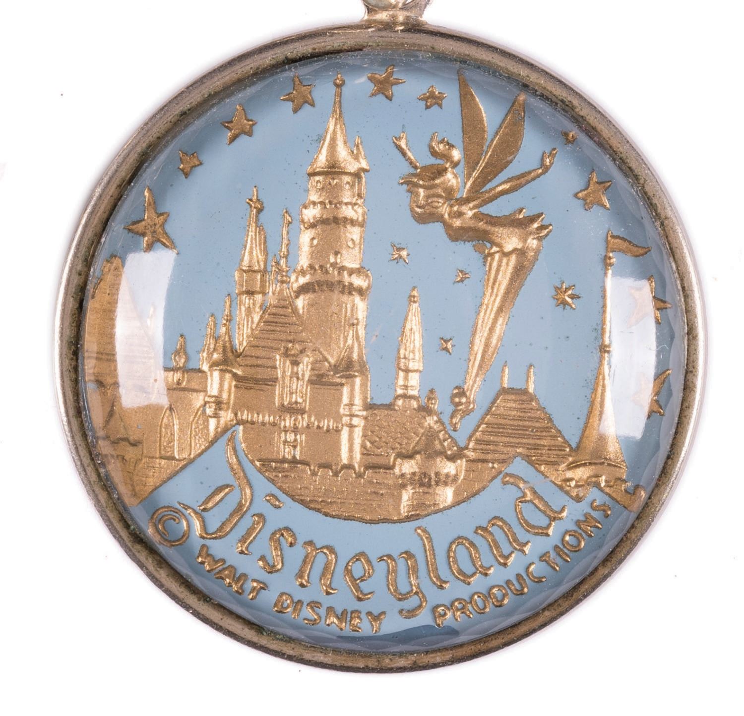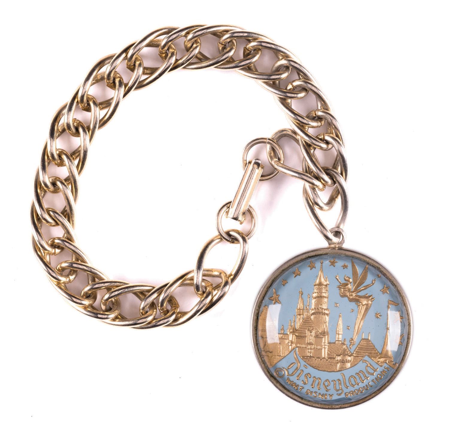 (Disneyland, 1950's-1960's) A very rare early Disneyland bracelet, featuring a striking image of Tinker Bell and the Castle. Measuring 8" long with a 1.25" diameter charm, the piece is in fine condition, with light wear from use to the reverse.