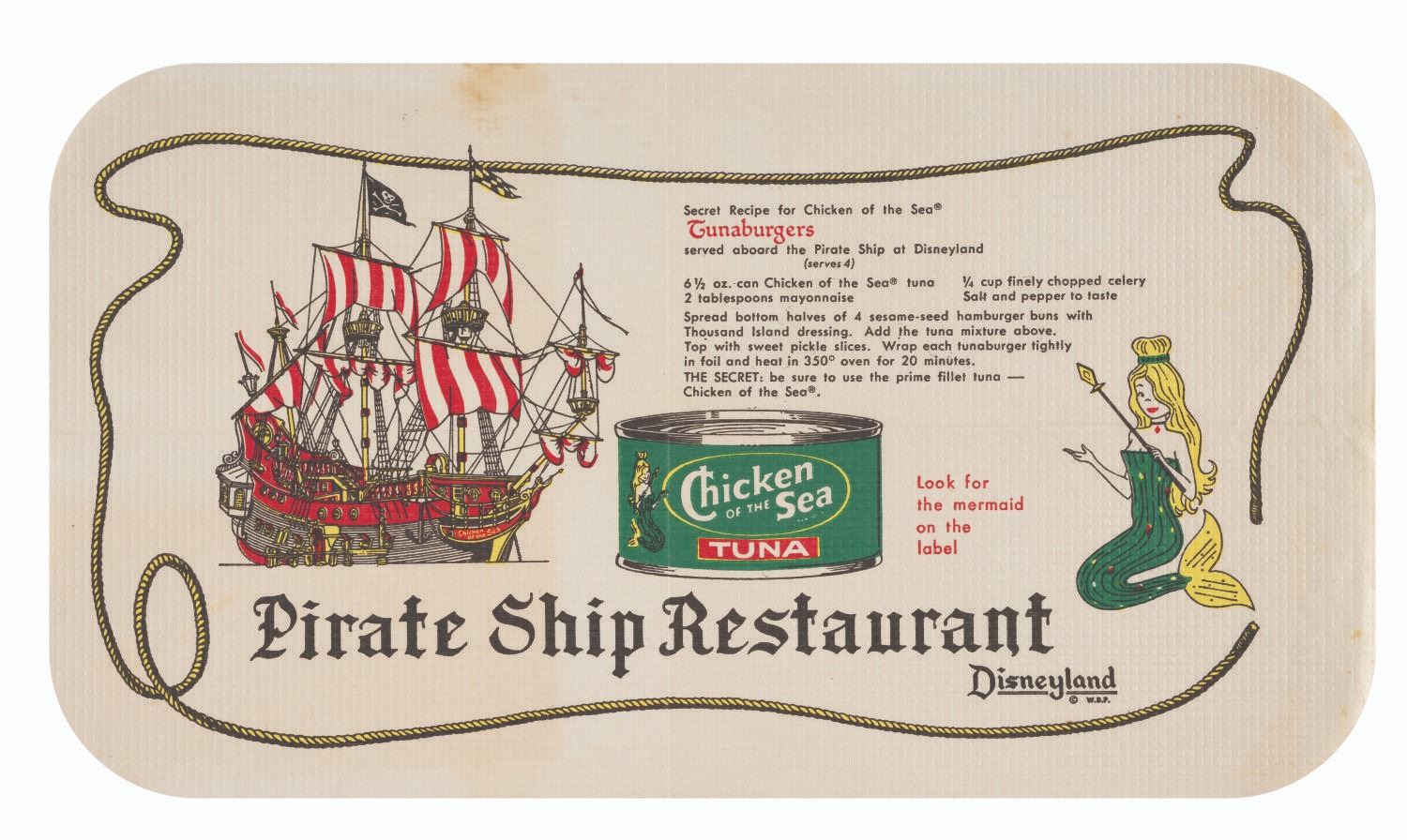 (Disneyland, 1959) A rare placemat from the Chicken of the Sea Pirate Ship Restaurant at Disneyland. This menu features the memorable recipe for Tuna Burgers, supplemented by tri-color images of the Mermaid and Pirate Ship Restaurant. Measuring 12.5"x7", the placemat is in good condition with spots of yellowing, minor wear, and creasing from being folded.