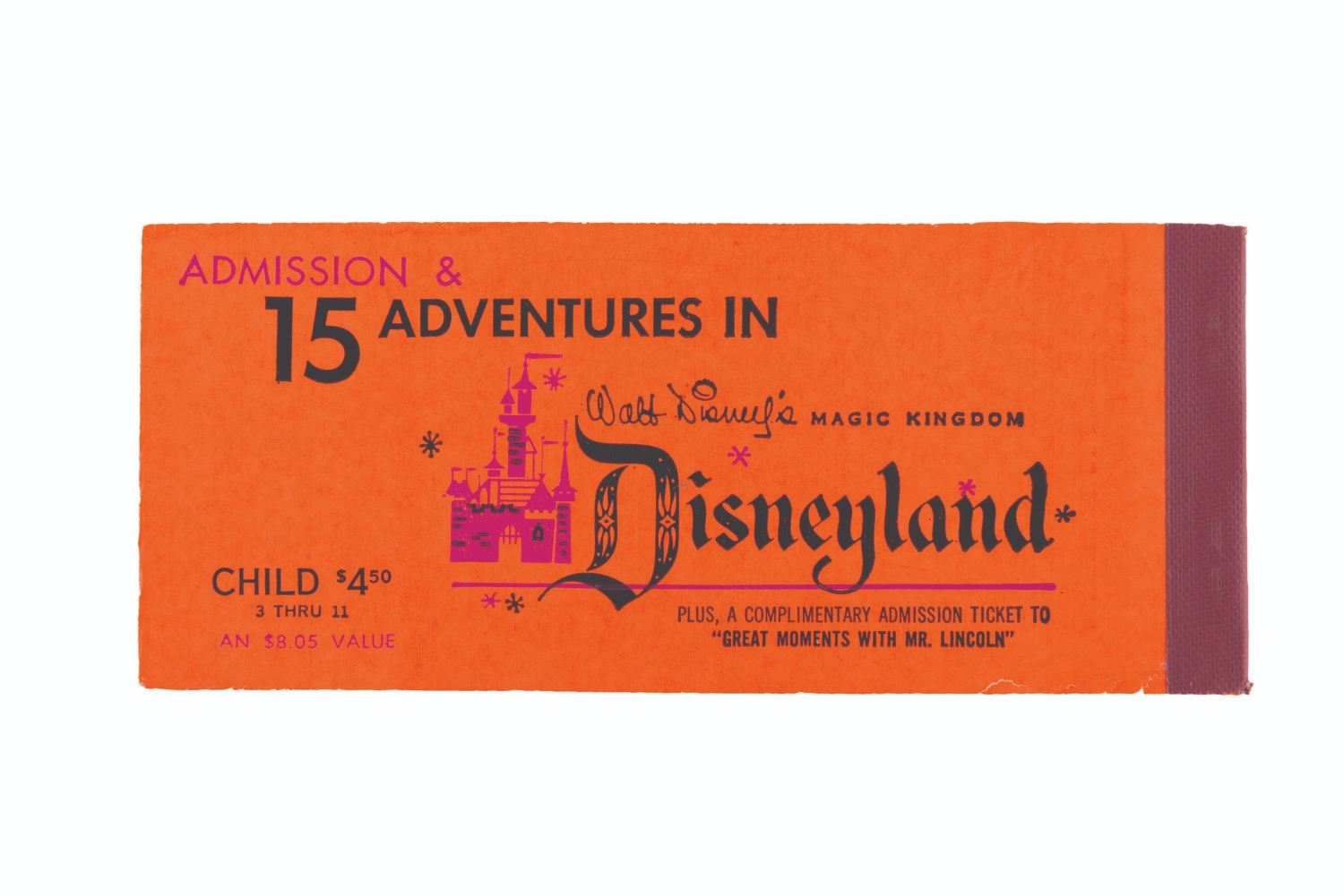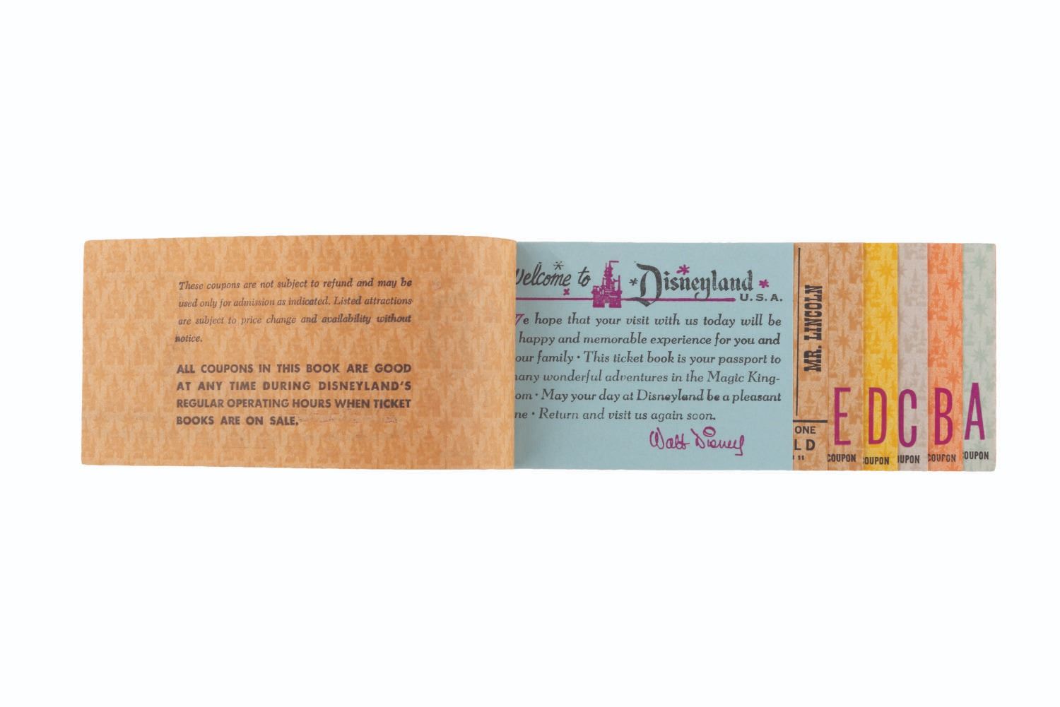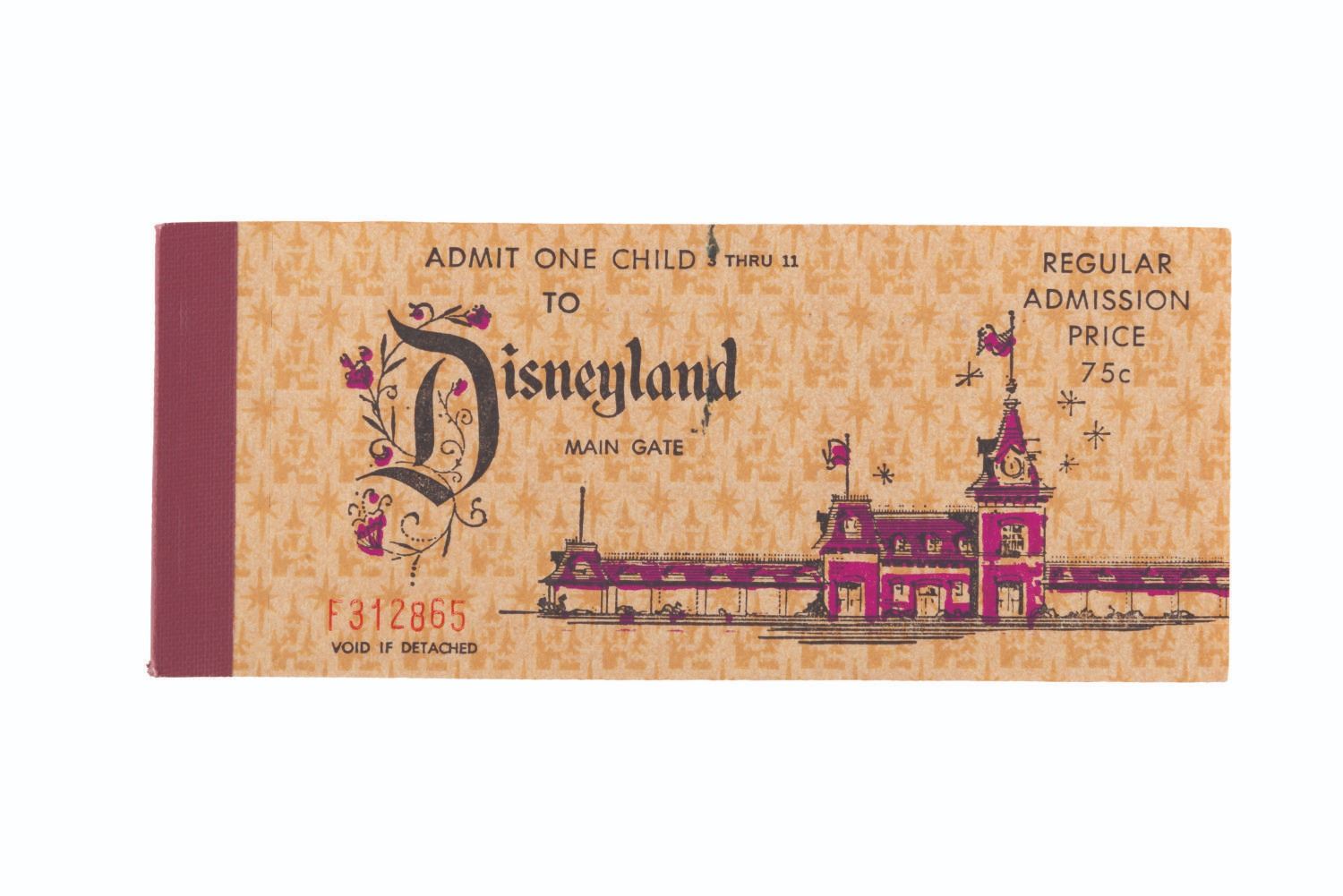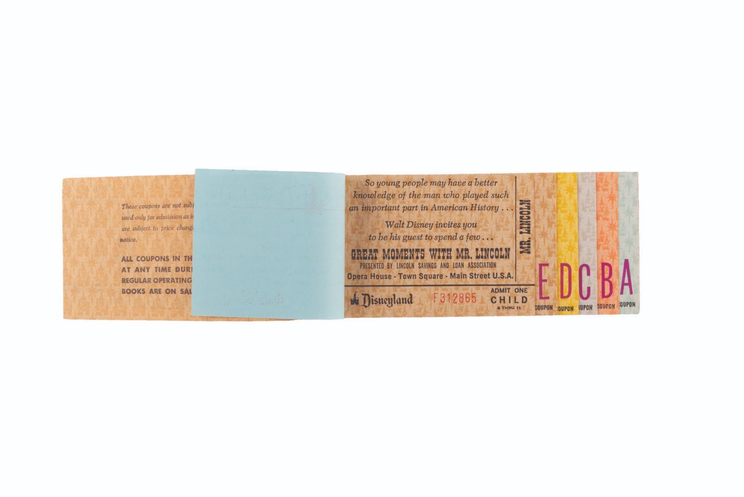 (Disneyland, 1971) A rare complete Child Admission and 15-ticket book from 1971. The book includes the front Main Gate admission ticket, the Welcome to Disneyland tab, a Great Moments With Mr. Lincoln ticket, 5 "E " tickets, 4 "D " tickets, 3 "C " tickets, 2 "B " tickets, and 1 "A " ticket. Measuring 2.5 " x 6 ", the ticket book is numbered F312865 and displays in very good condition with stains, creases, and wear.