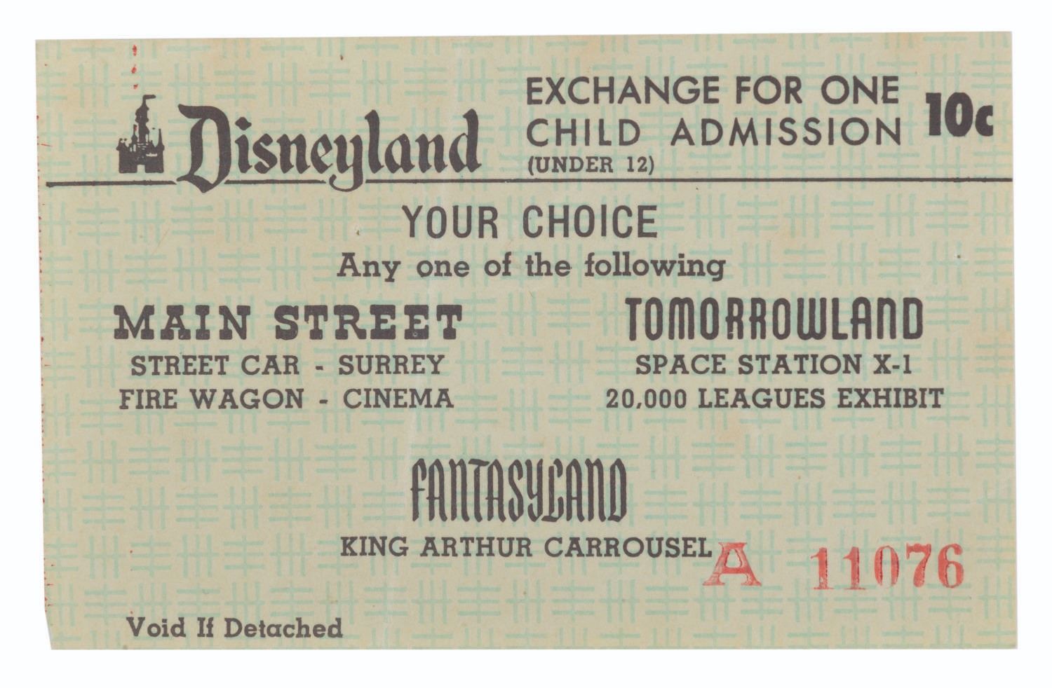 (Disneyland, 1955-58) A Disneyland Child Admission "A" Ticket for one of five attractions in the Main Street, Fantasyland, or Tomorrowland areas. Measuring 4" x 2.5", this ticket numbered A11076, is in good condition with few creases, minor yellowing, and wear.