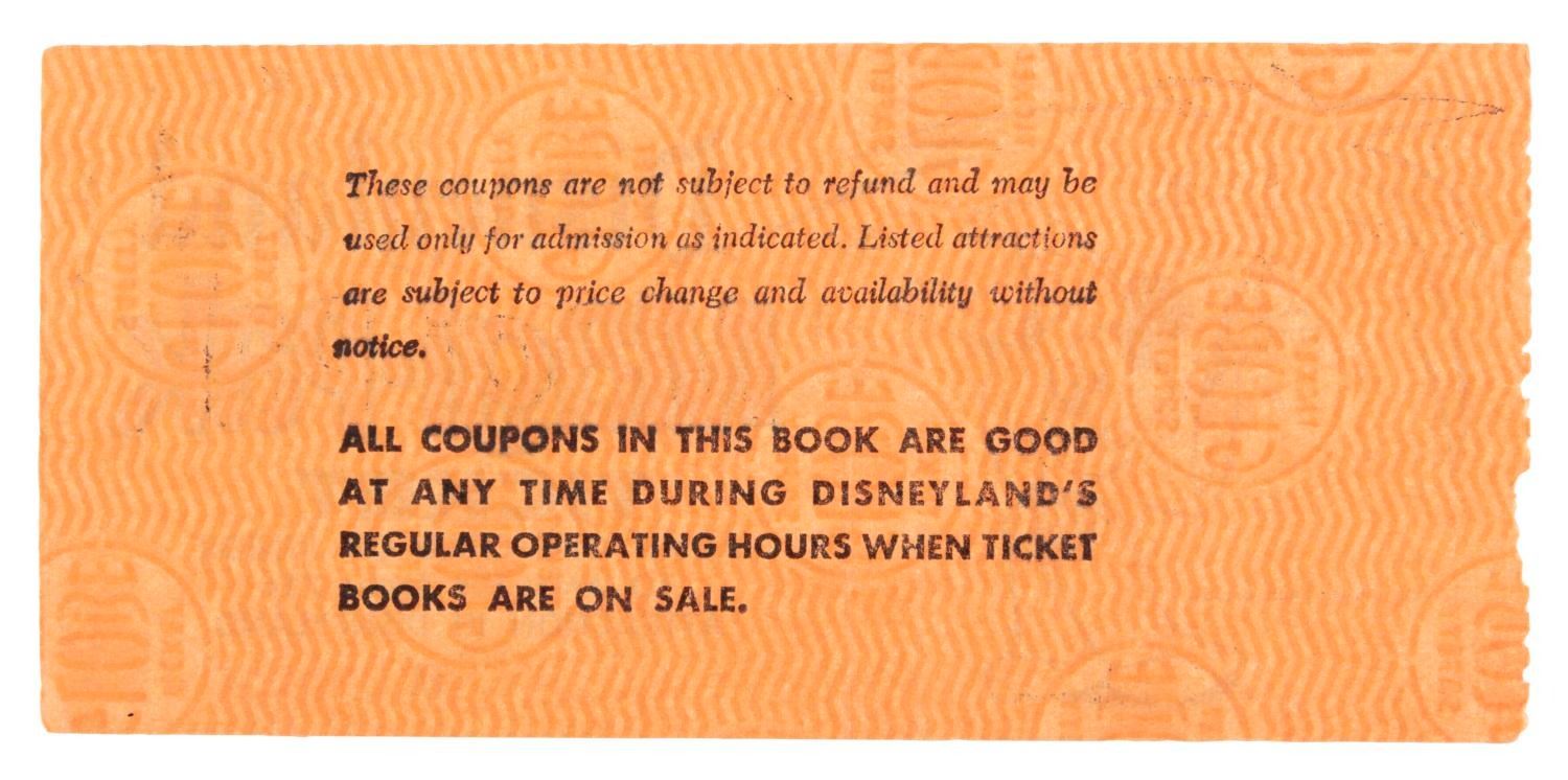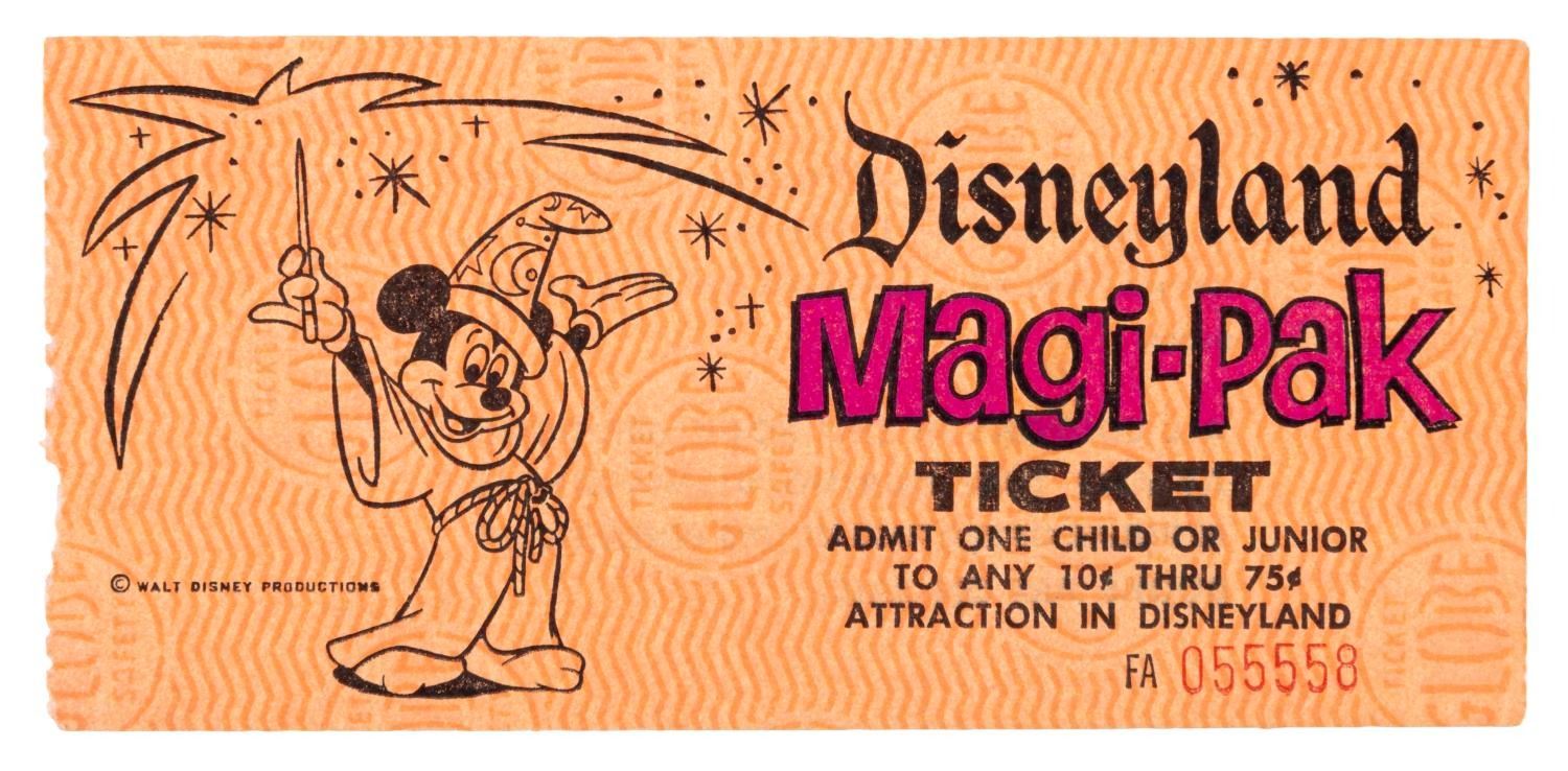 (Disneyland, 1966) A ticket from the Disneyland Magi-Pak booklets that were sold in the Park in the 1960s. This 1966 edition of the Magi-Pak differs from earlier versions, with “Walt Disney Productions” replacing a replica of Walt’s signature and a price increase. Measuring 2.5” x 5.5”, ticket 055558 displays in very good condition with a slightly uneven tear to the perforated left edge.