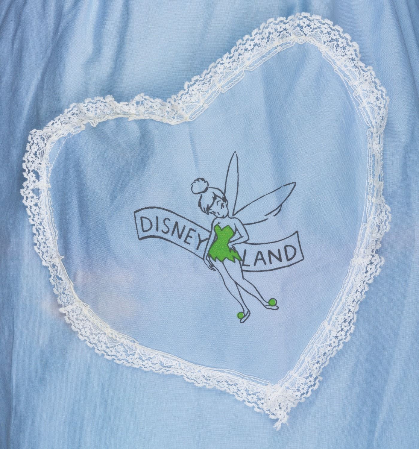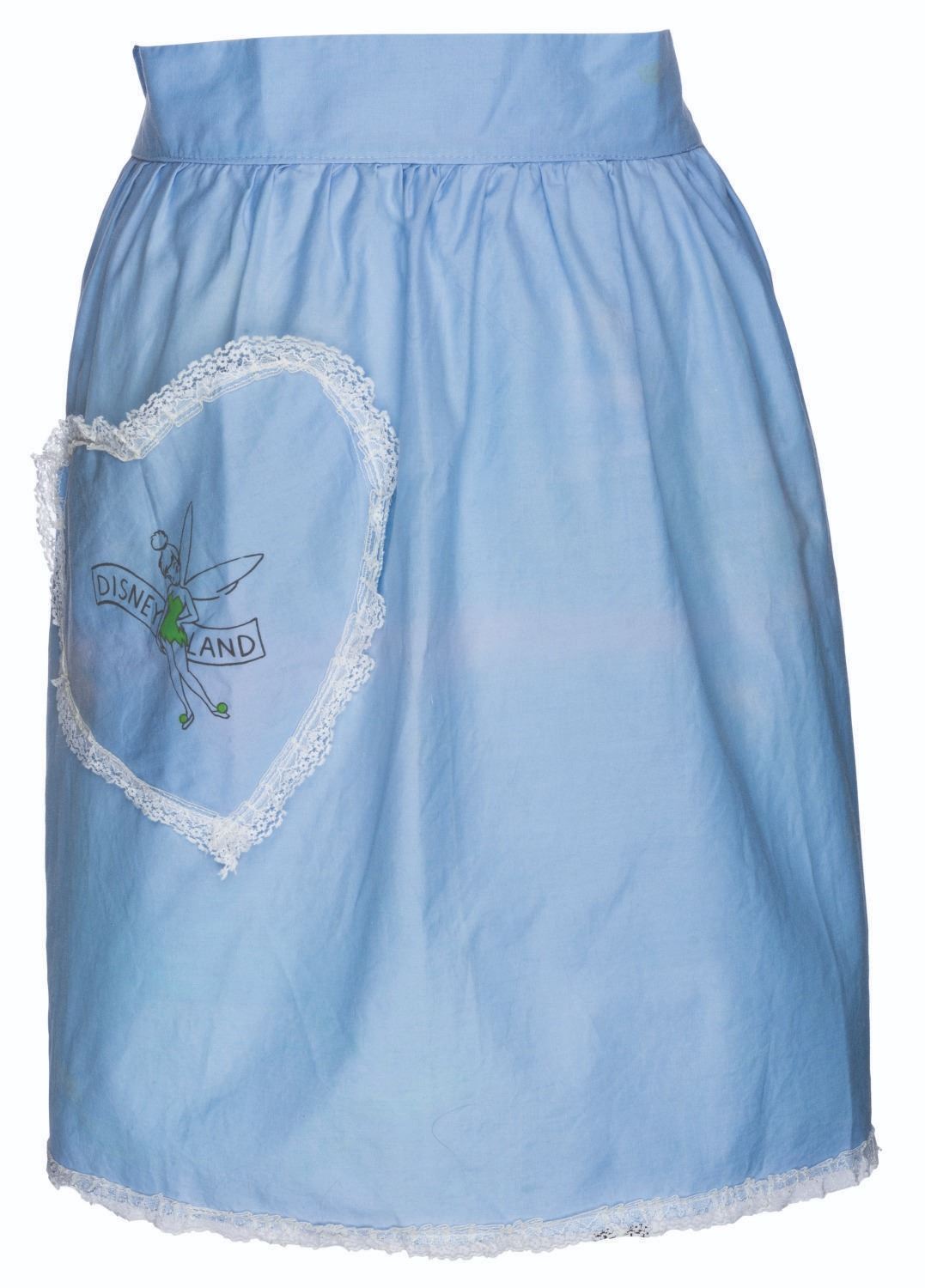 (Disneyland, 1950s) An early Disneyland child's-sized apron featuring Tinker Belle and adorned with lace. Measuring 17" x 24", the apron is in good condition with fading, stains, and discoloration.