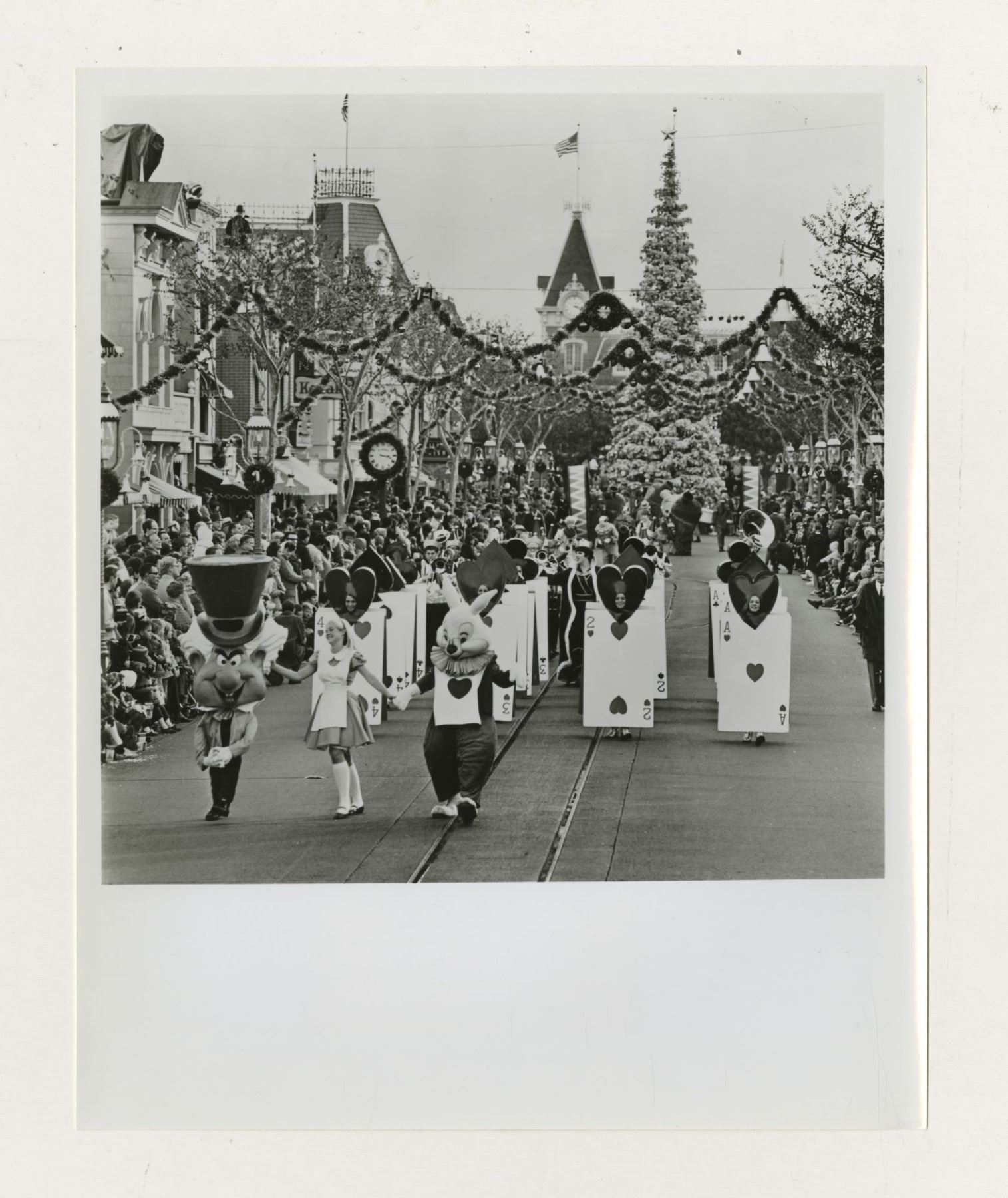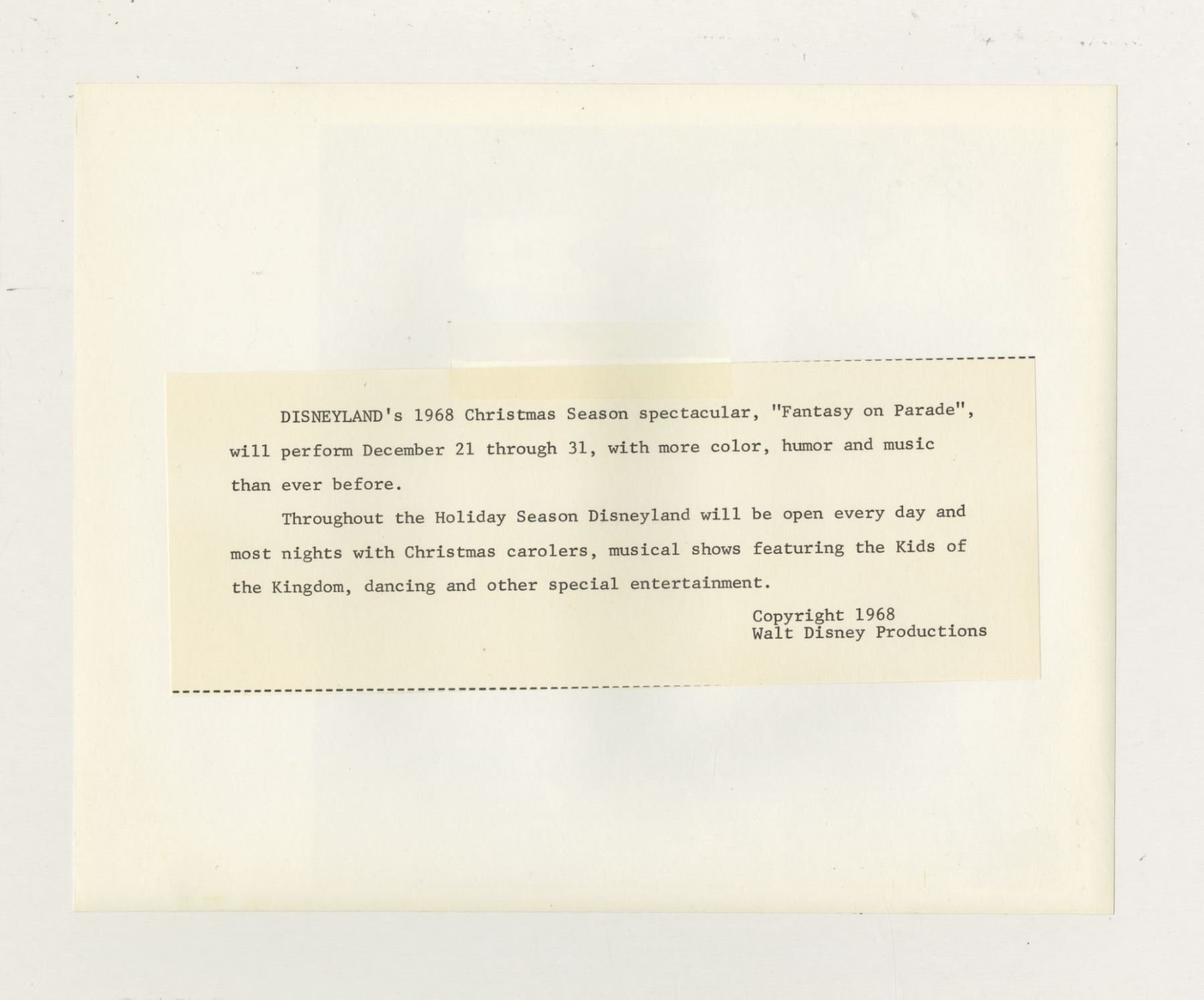 (Disneyland, 1968) A publicity photograph of Disneyland’s “Fantasy on Parade” with a press caption adhered to the reverse. Measuring 8” x 10”, the photograph is in very good condition with slight handling wear and discoloration from age.