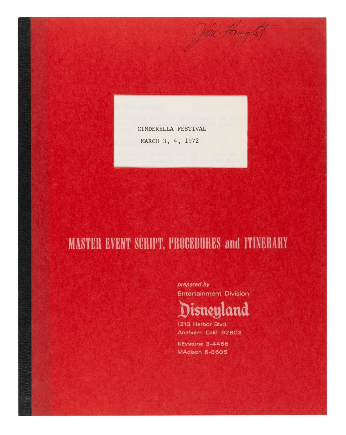 (Disneyland, 1972) An Entertainment Division master event script, procedures, and itinerary packet for the Cinderella Festival, held March 3-4, 1972 at Disneyland. The packet has been hand-signed by Jim Haught, a Disneyland Supervisor, and inside are maps, outlines, and schedules. Measuring 8.5” x 11”, the packet is in very good condition with light wear and blue pen inscriptions inside from Cast Member use.